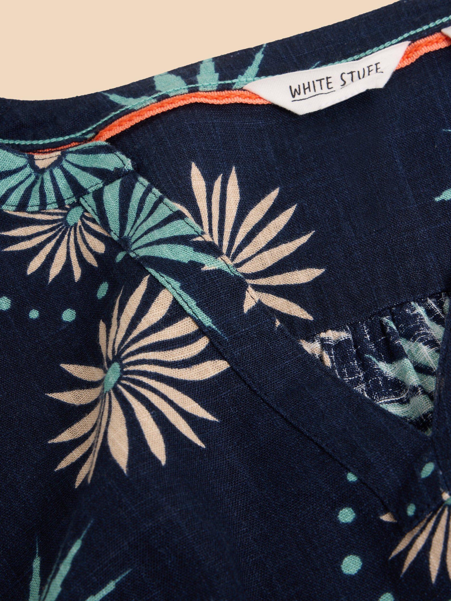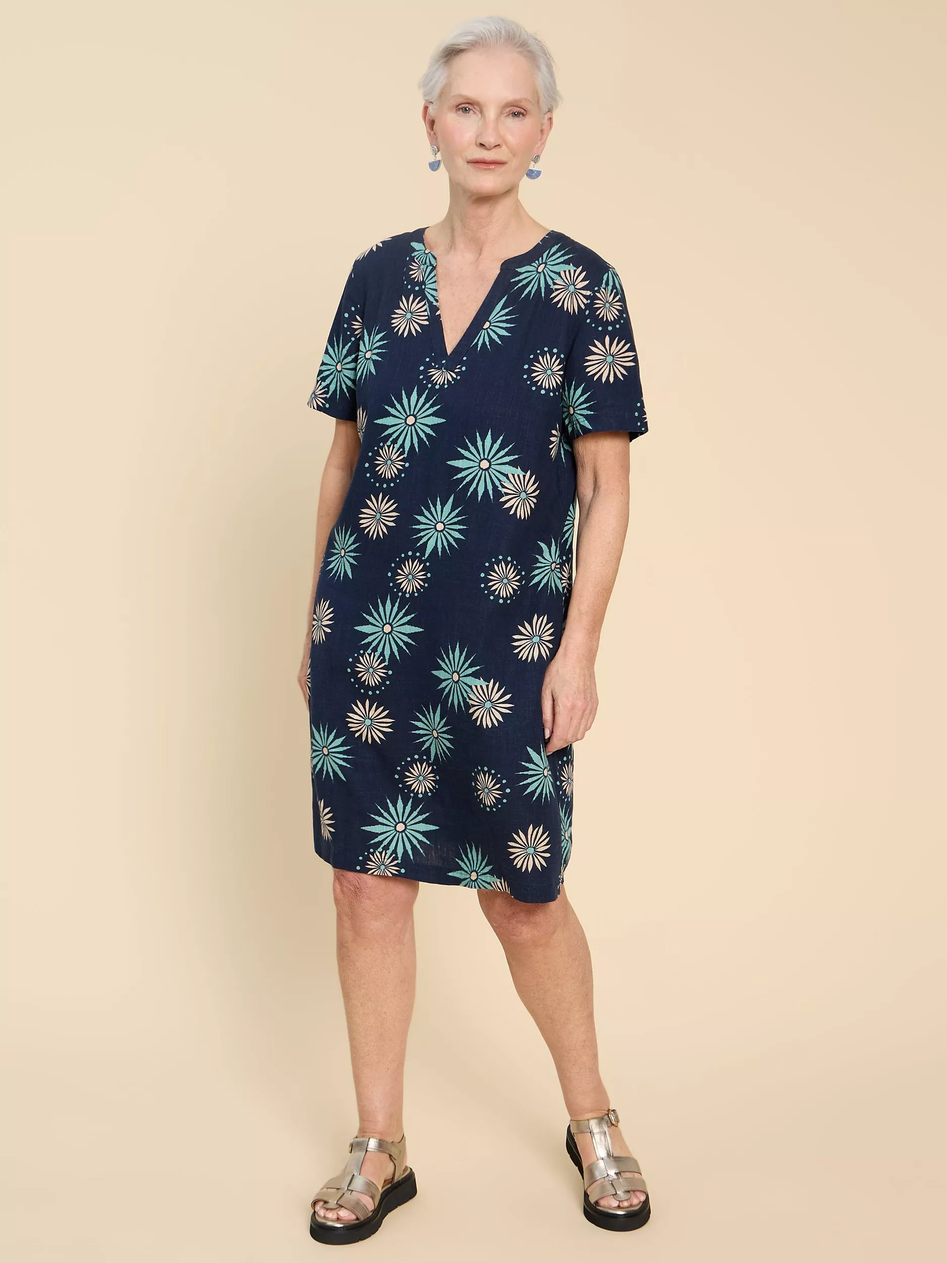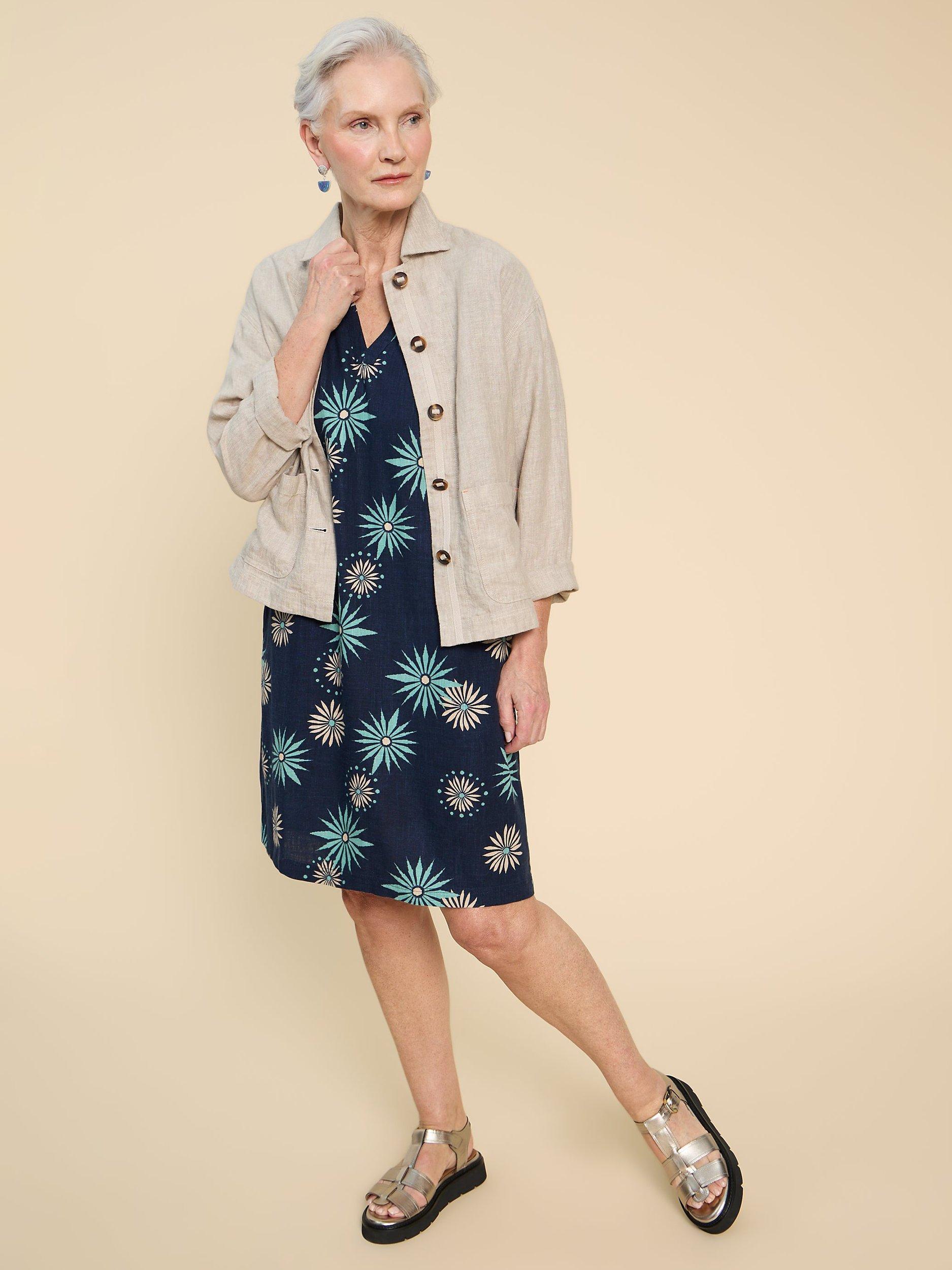 A fuss-free choice thanks to the shift cut, this knee length dress from White Stuff is dreamt up from a light linen blend. With a fuss-free but smart v-neckline and short sleeves, it is cloaked with abstract motifs.