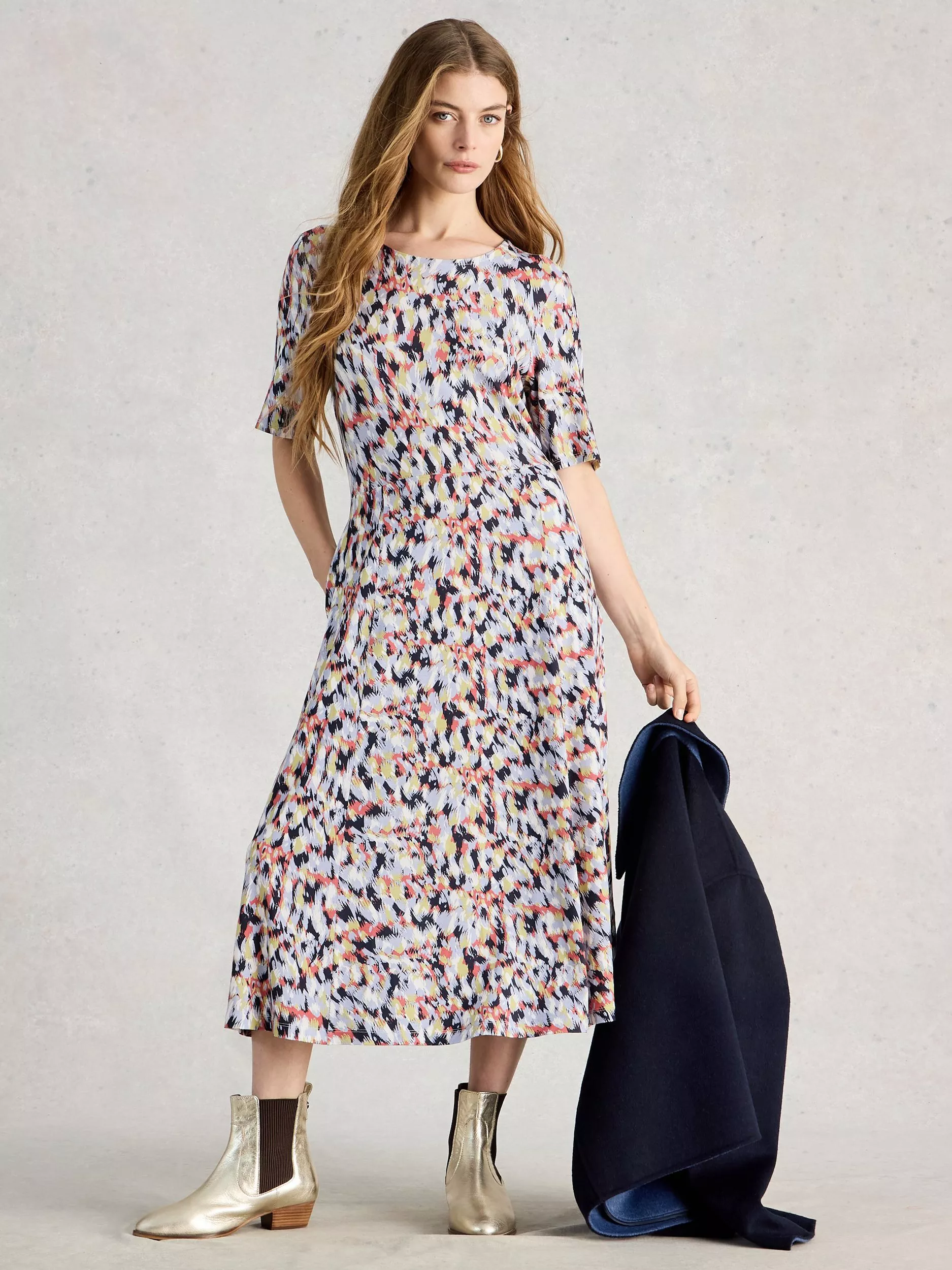 An A-line midi dress from White Stuff that moves with you. With an abstract pattern, the soft viscose blend keeps you comfortable through every task, meeting, or catch-up you have planned.