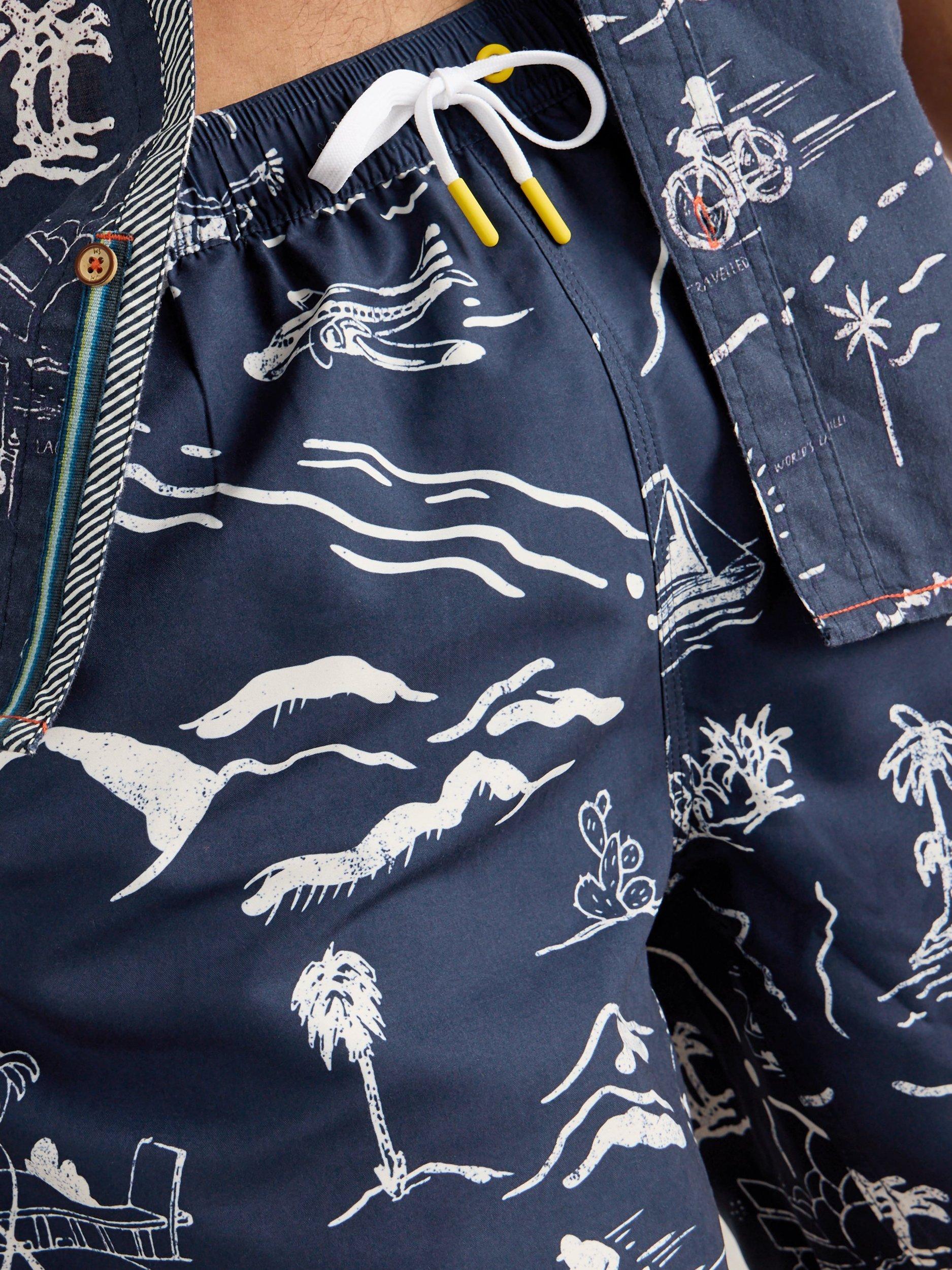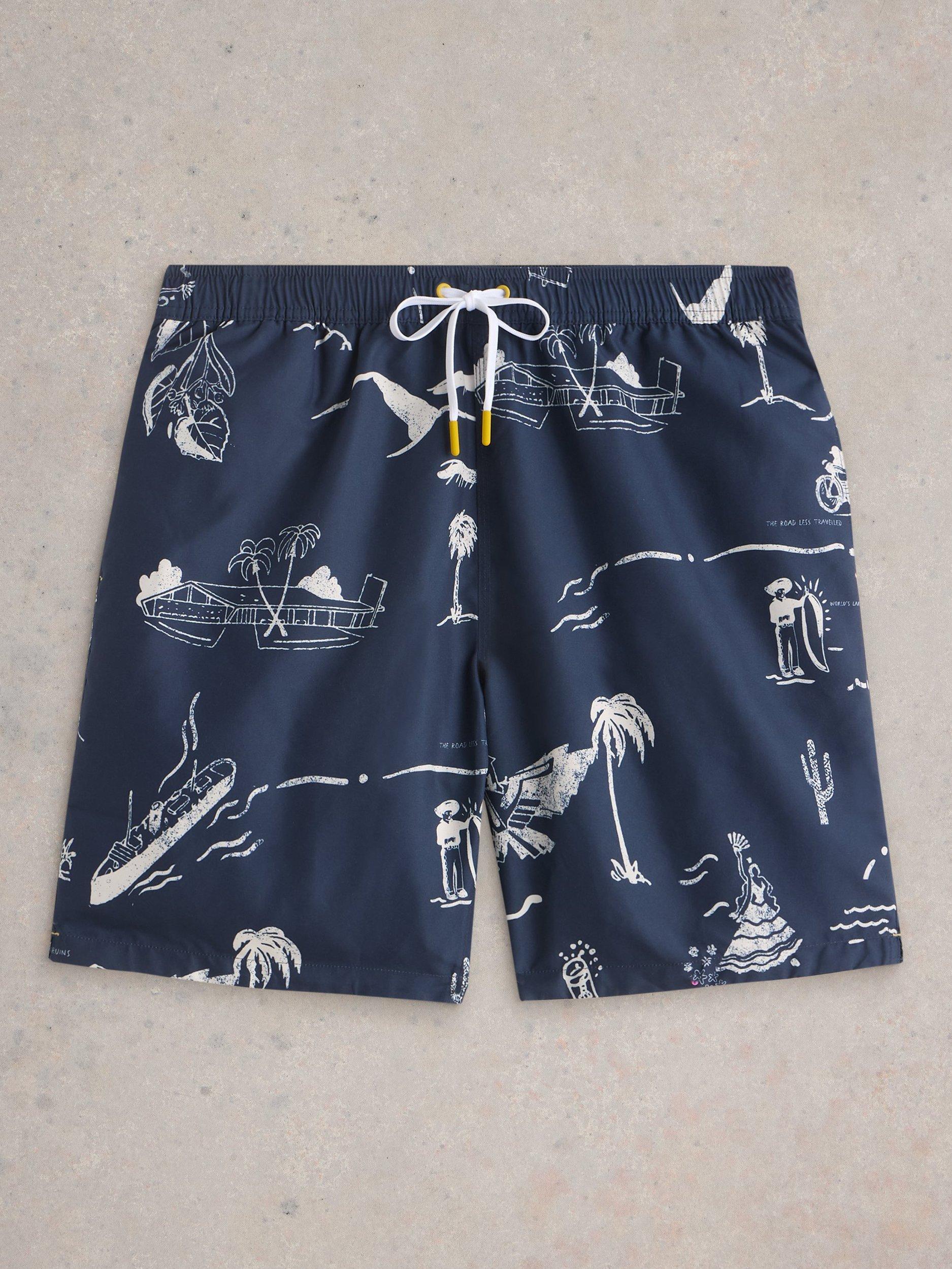 These swim shorts are constructed from lightweight fabric with water-repellent and fast-drying qualities. They feature a drawstring waist, a zip pocket on the back and a fun map print.
