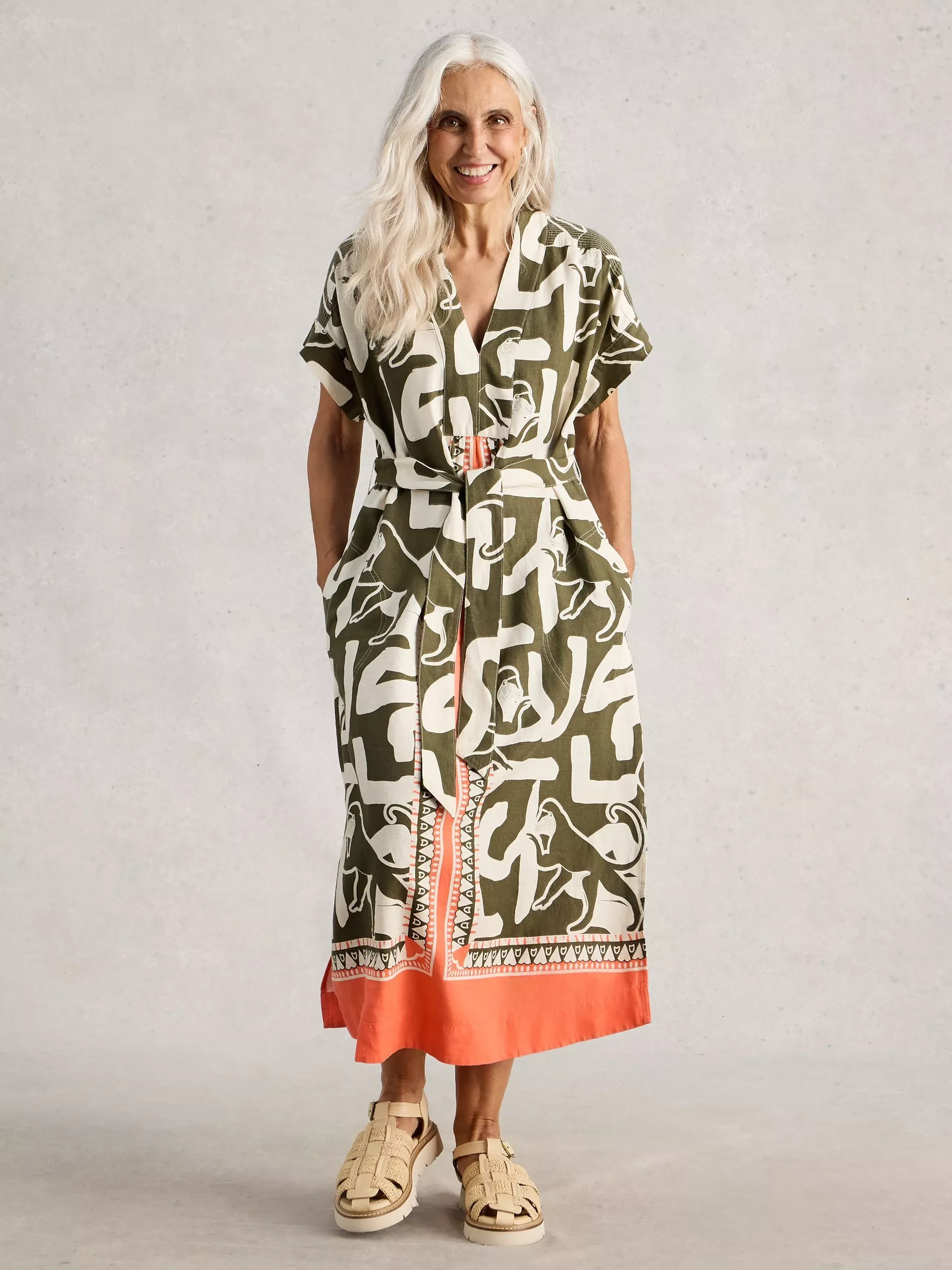 In a breathable viscose-linen blend, this midi dress from White stuff is cut to a straight silhouette with a v-neck and short cap sleeves. Finished with an abstract print for a modern feel.