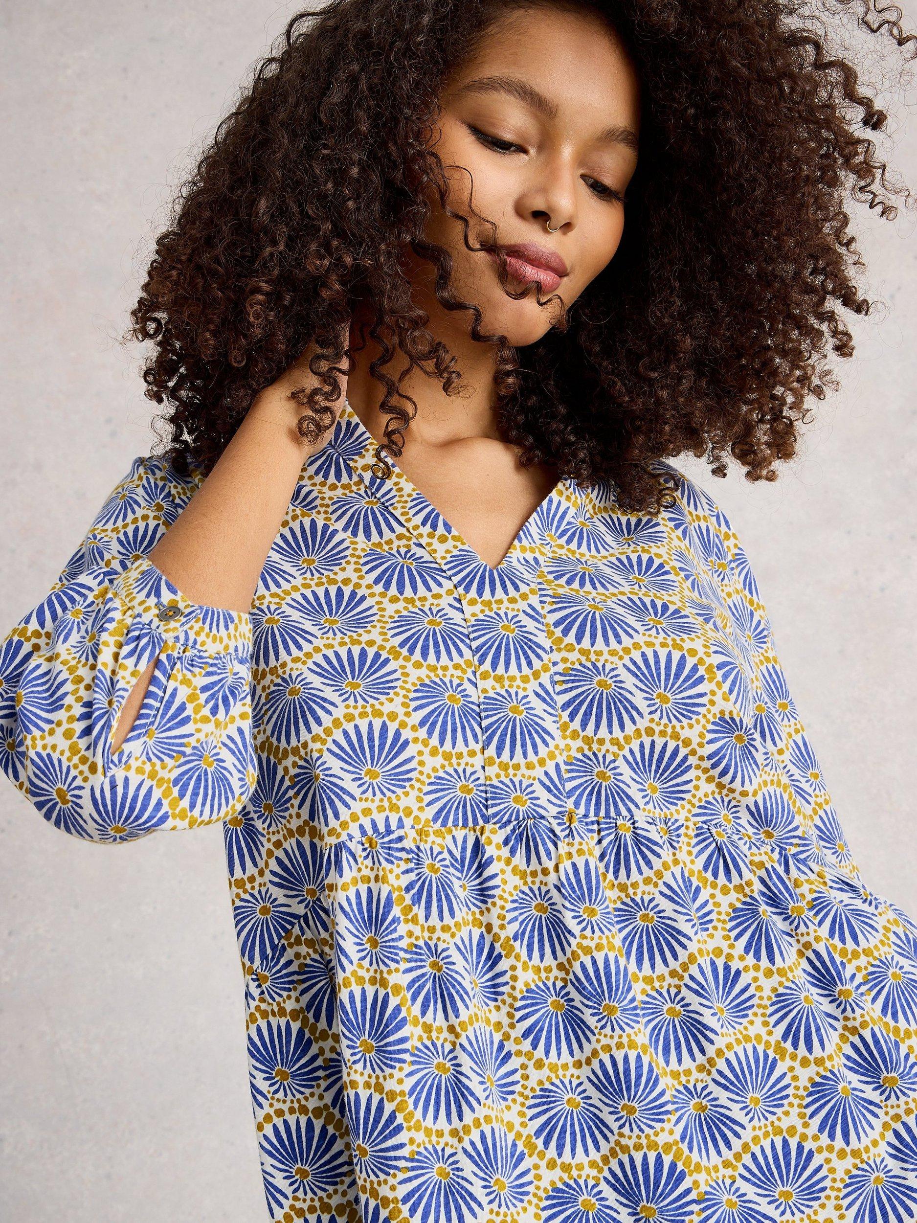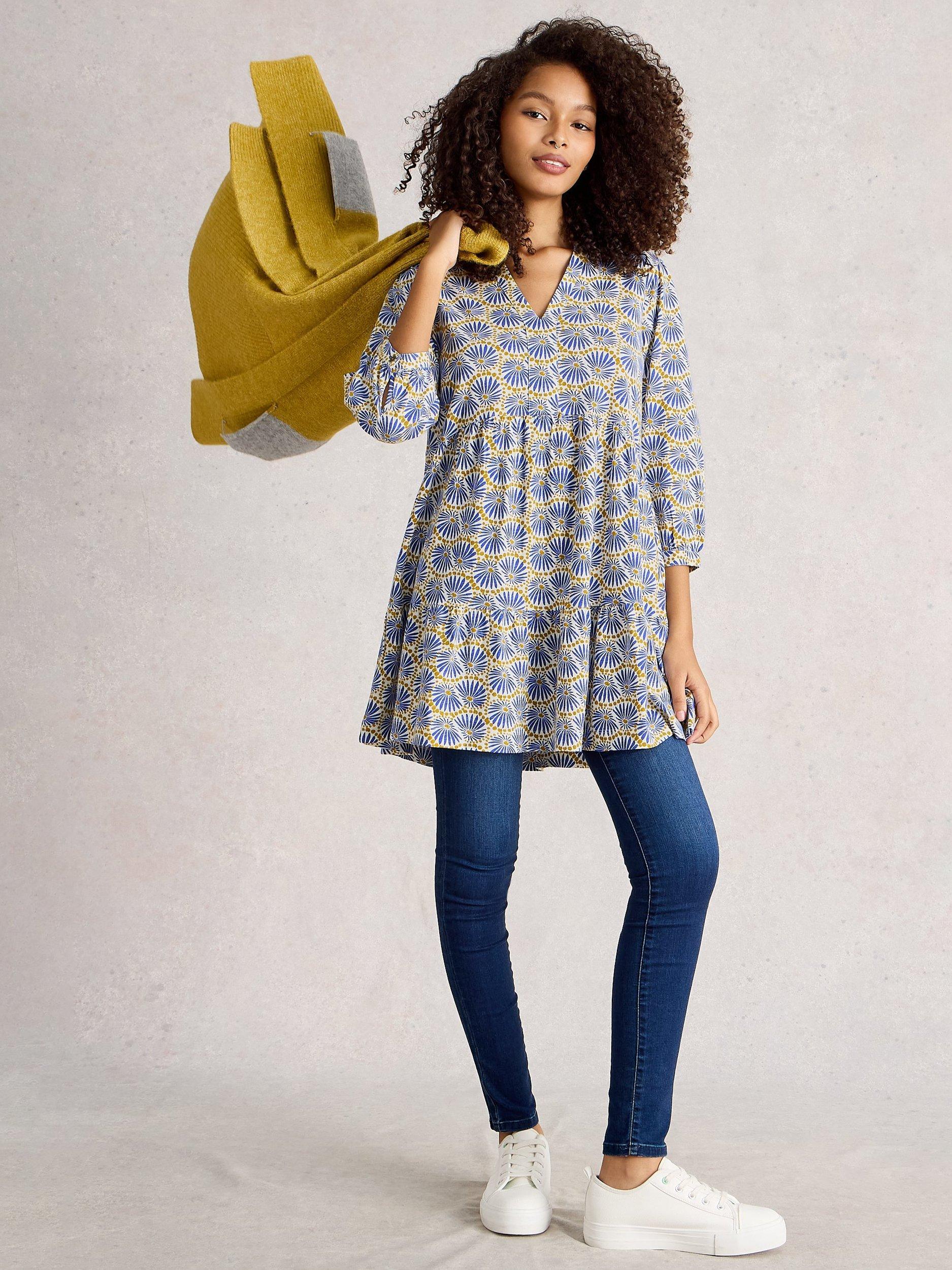 Longer in length for relaxed days ahead, this abstract print tunic top by White Stuff is made from cotton with a classic v-neckline and three-quarter length sleeves.
