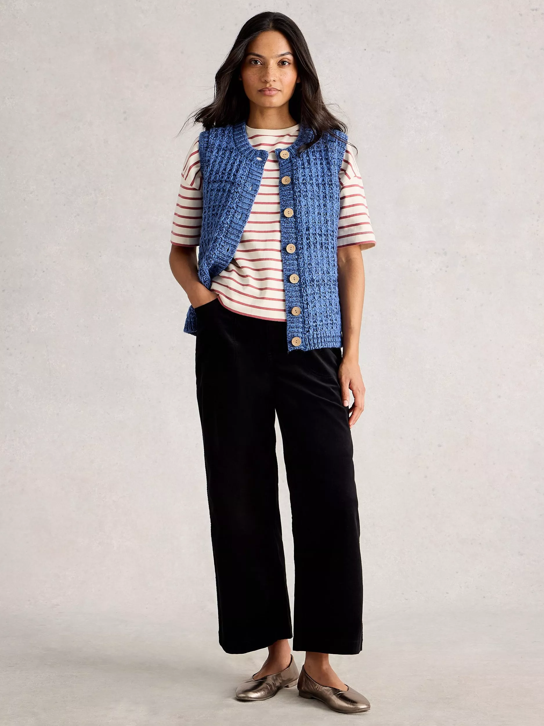 Nice and simple with a round neckline, this chunky textured waistcoat from White Stuff is a go-to as the temperature cools.