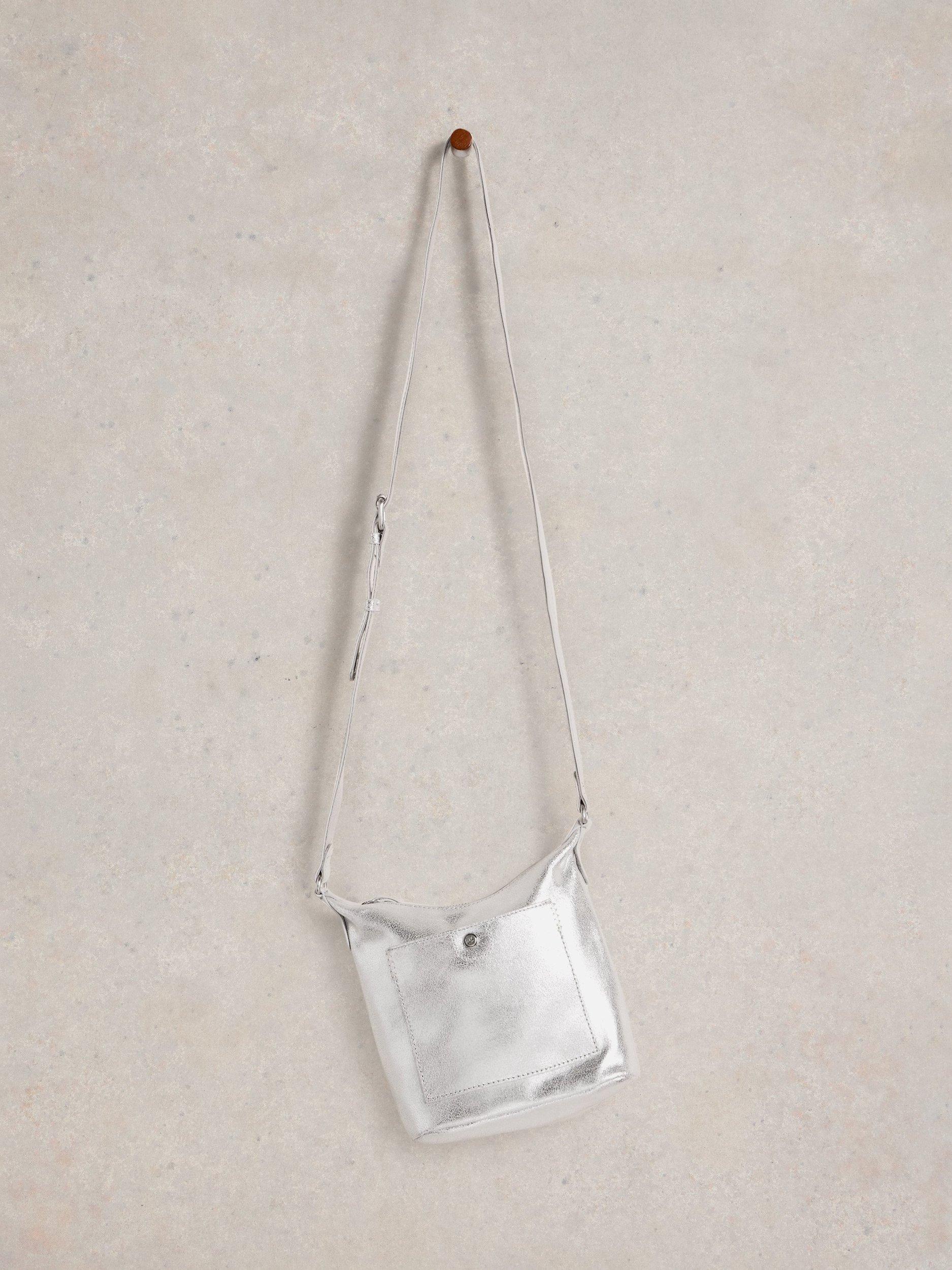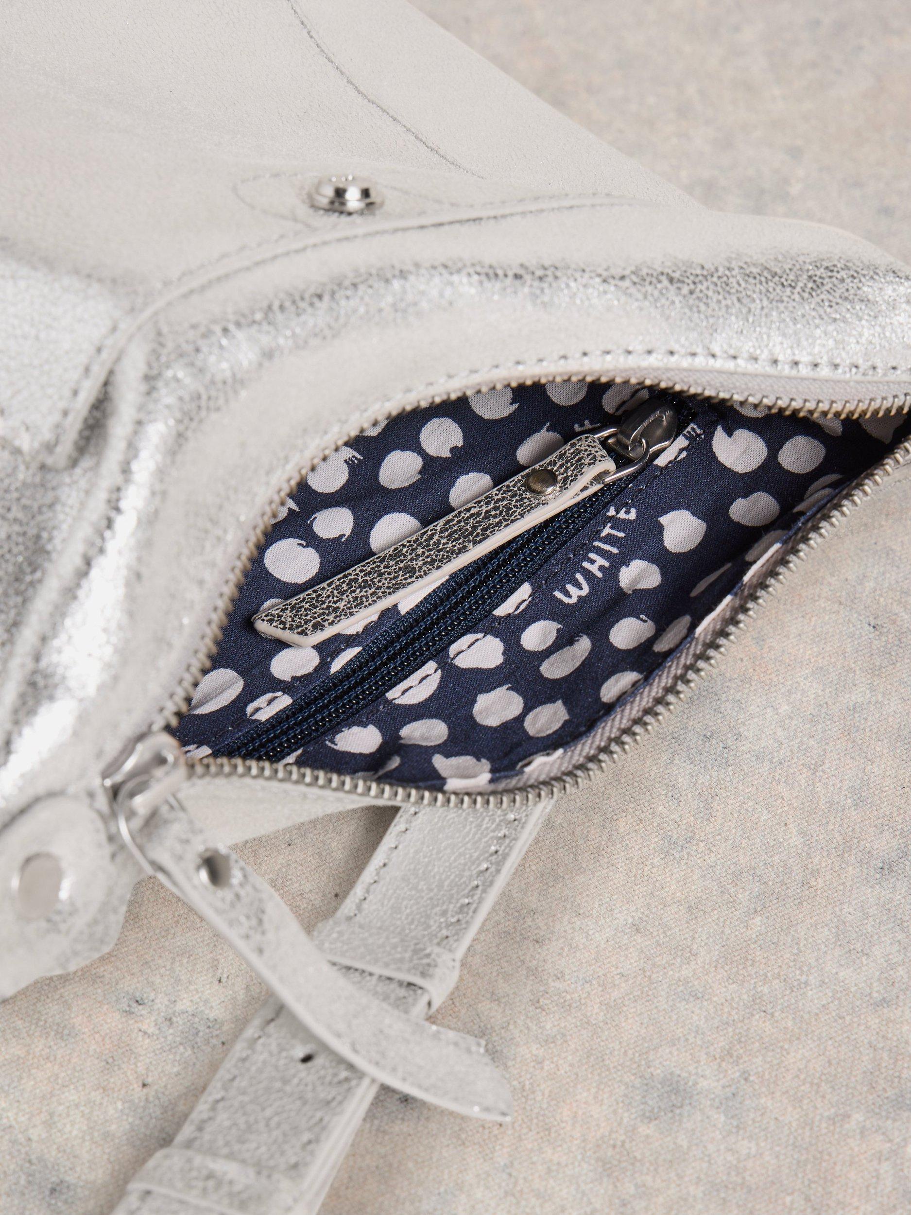 Metallic leather bag from White Stuff, featuring an adjustable crossbody strap, zip fastening and external pocket. Finished with a patterned lining and internal zip pocket.