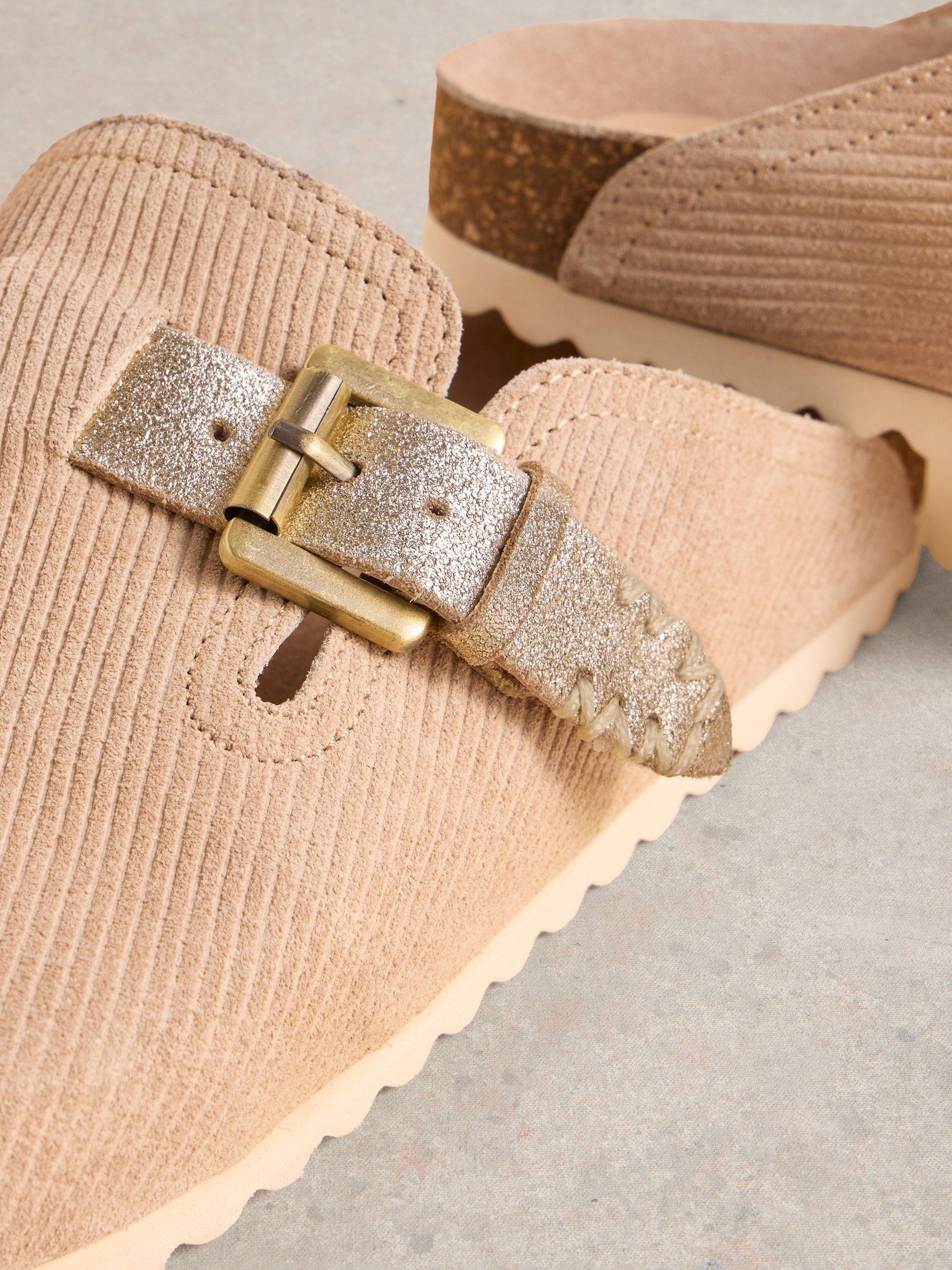 Complete with a cushioned footbed, this design also features a round toe with an adjustable metallic strap.