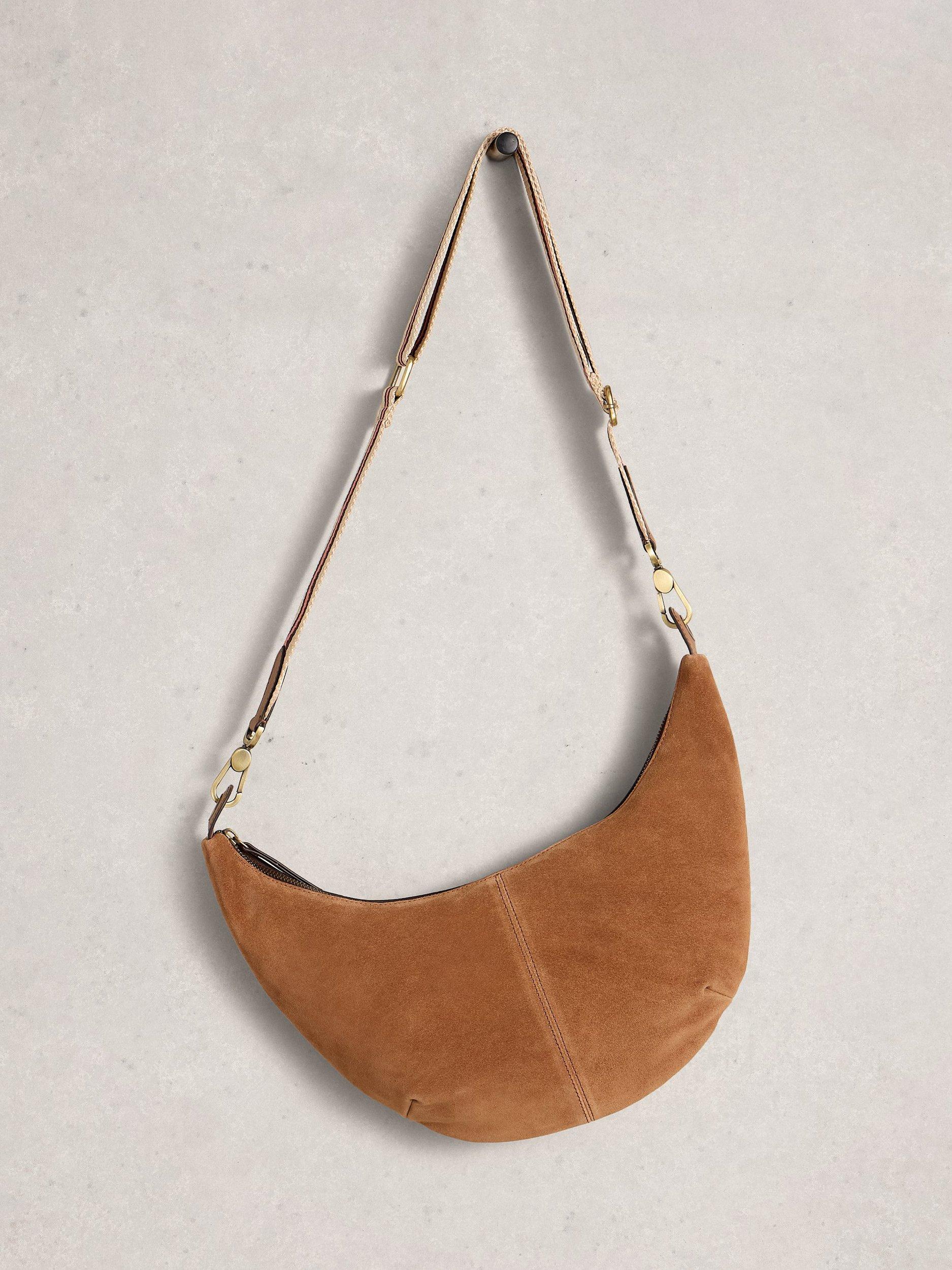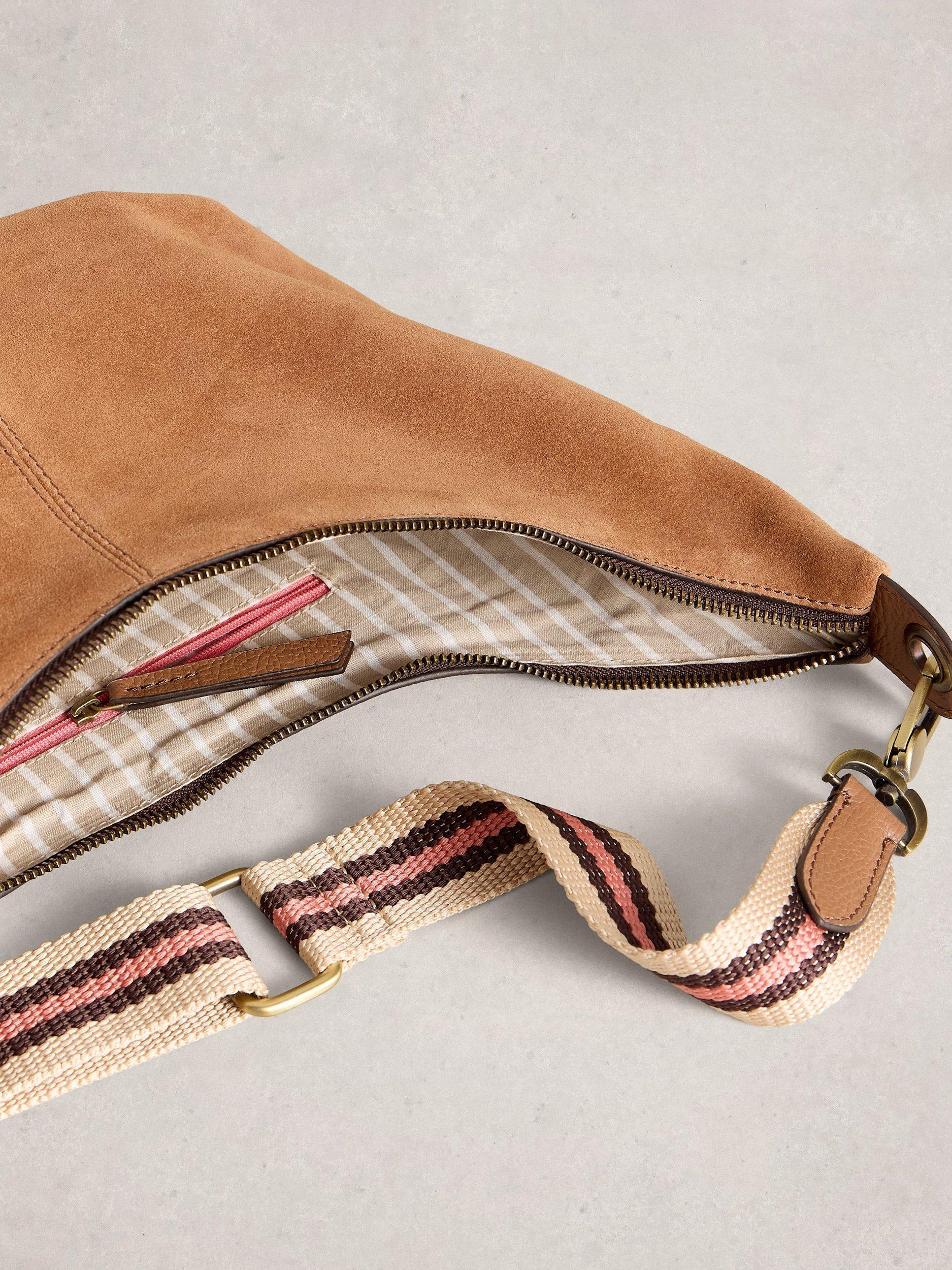 A curved leather and suede sling bag with an adjustable webbing striped strap.