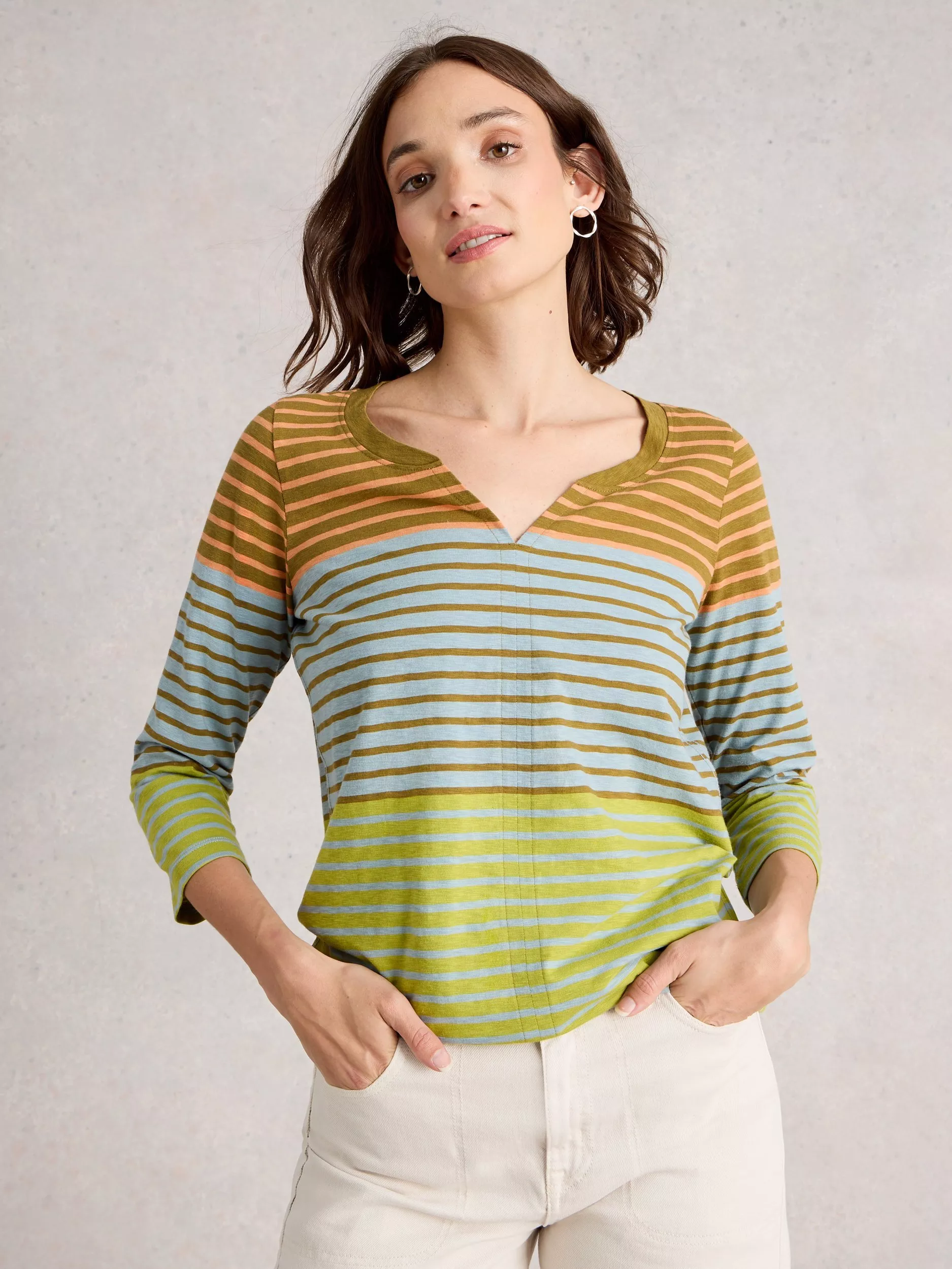 The foundation to all your looks, this t-shirt from White Stuff is sure to be a wardrobe favourite with its neat stripe detail. Classic in cut with a v-neckline and three-quarter length sleeves, it's made from soft cotton and is ideal for relaxed daytime wear.