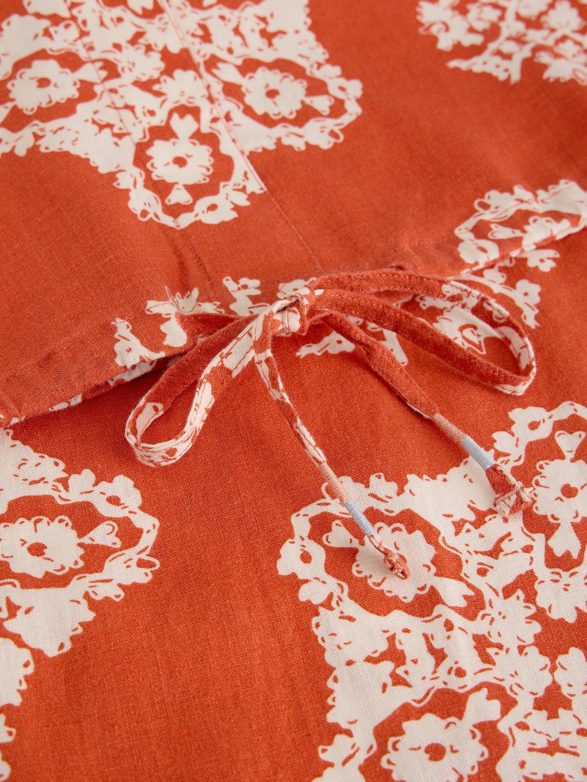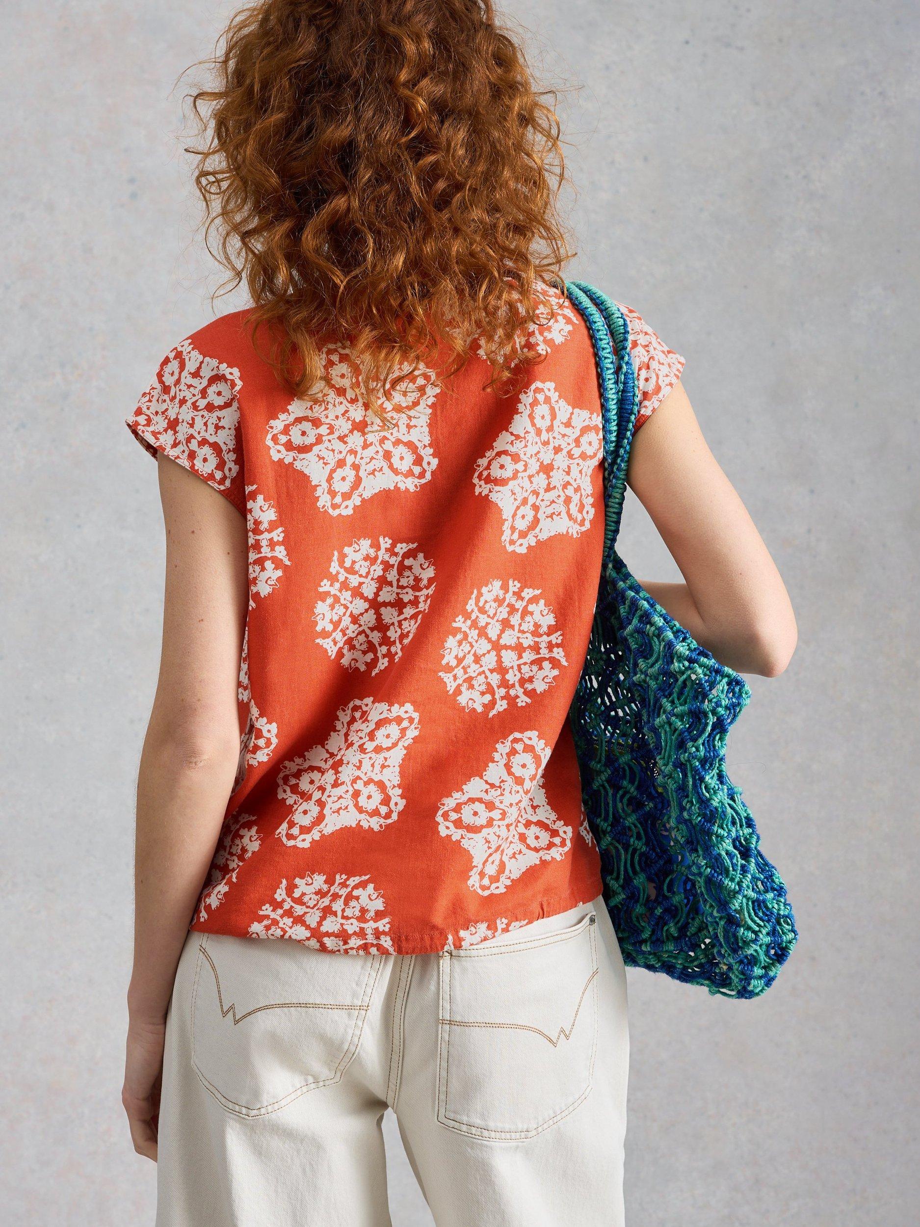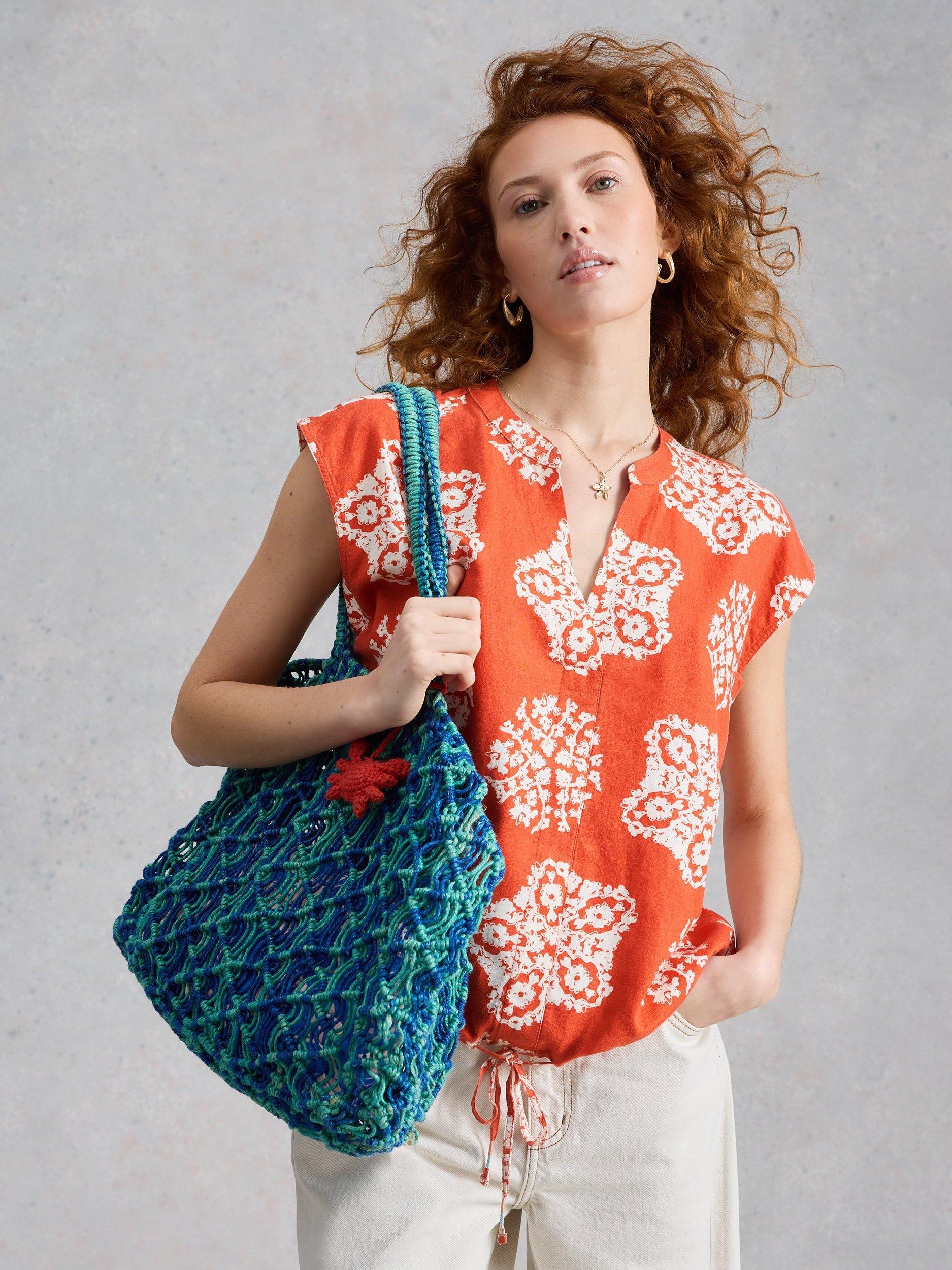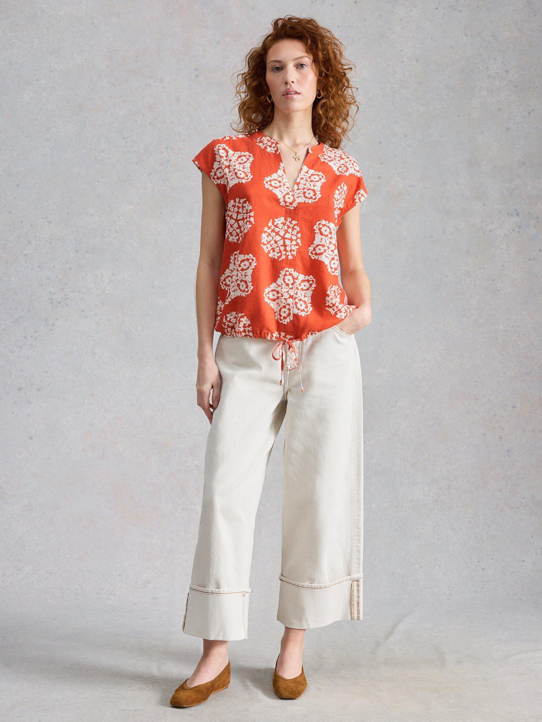 This lightweight top features a notch neckline, cap sleeves, and a drawstring hem.