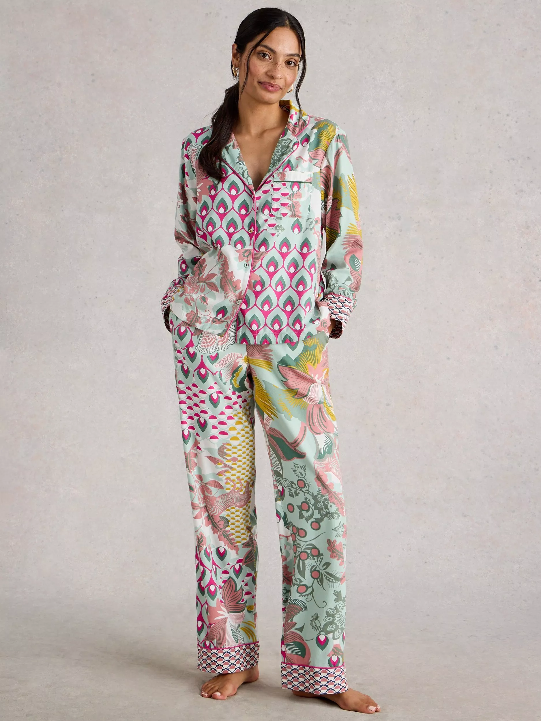 A pyjama shirt with a contrasting print on the cuffs and little colour pop and embroidery details. Consider this your excuse to lounge.