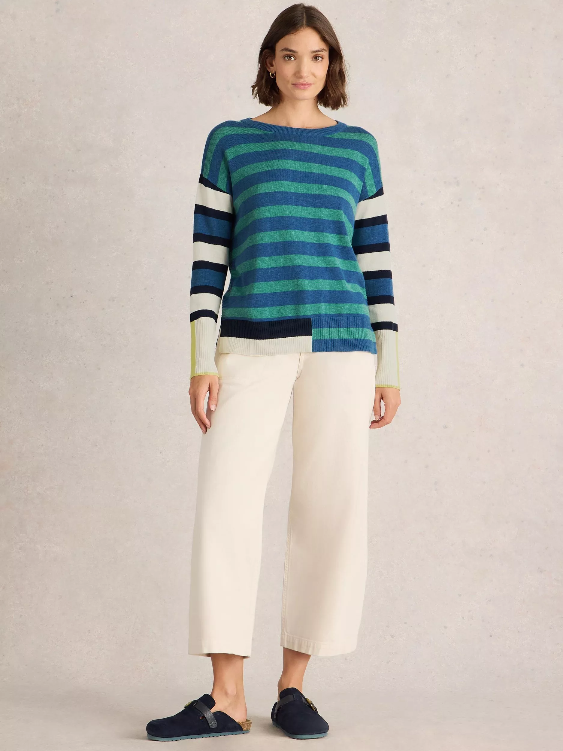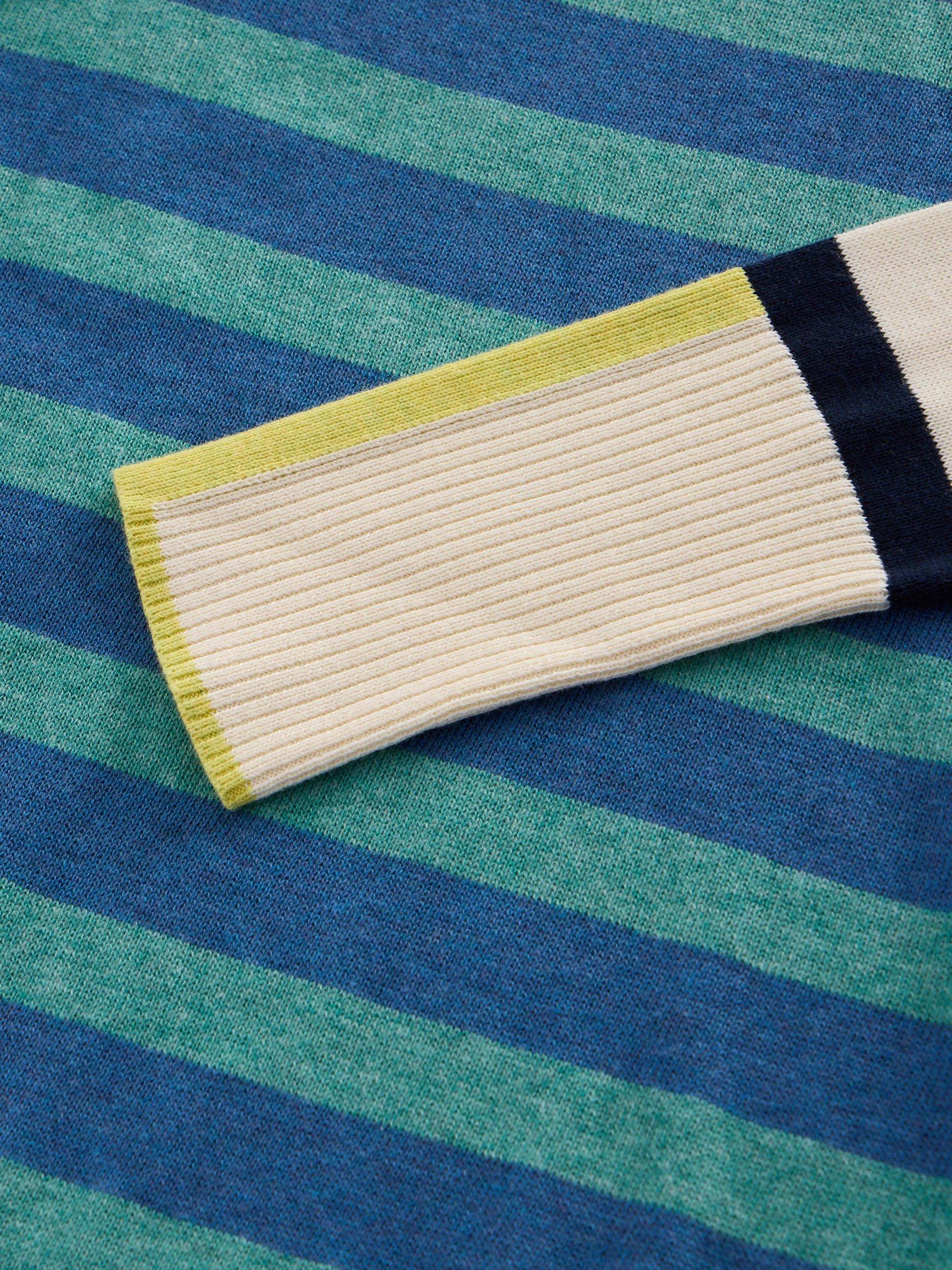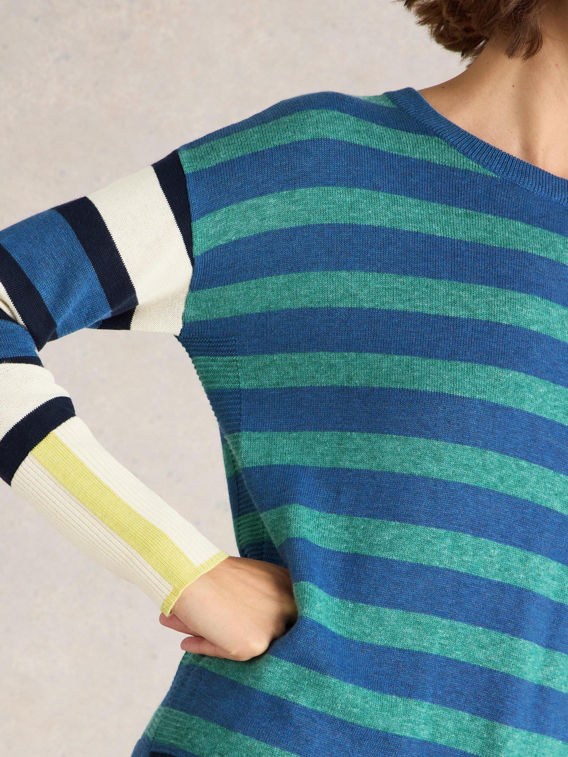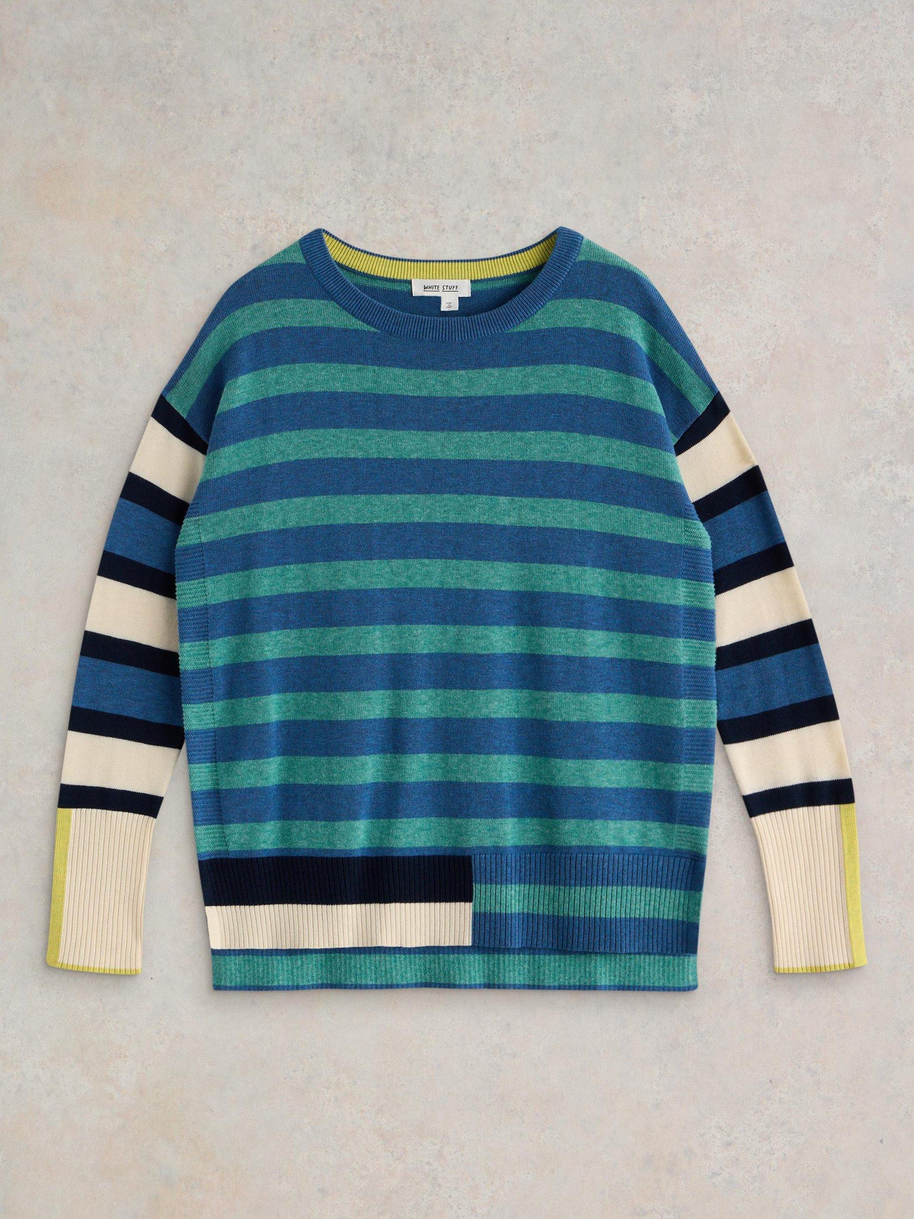 A crew neck, regular fit jumper with side splits and a whole body stripe pattern.
