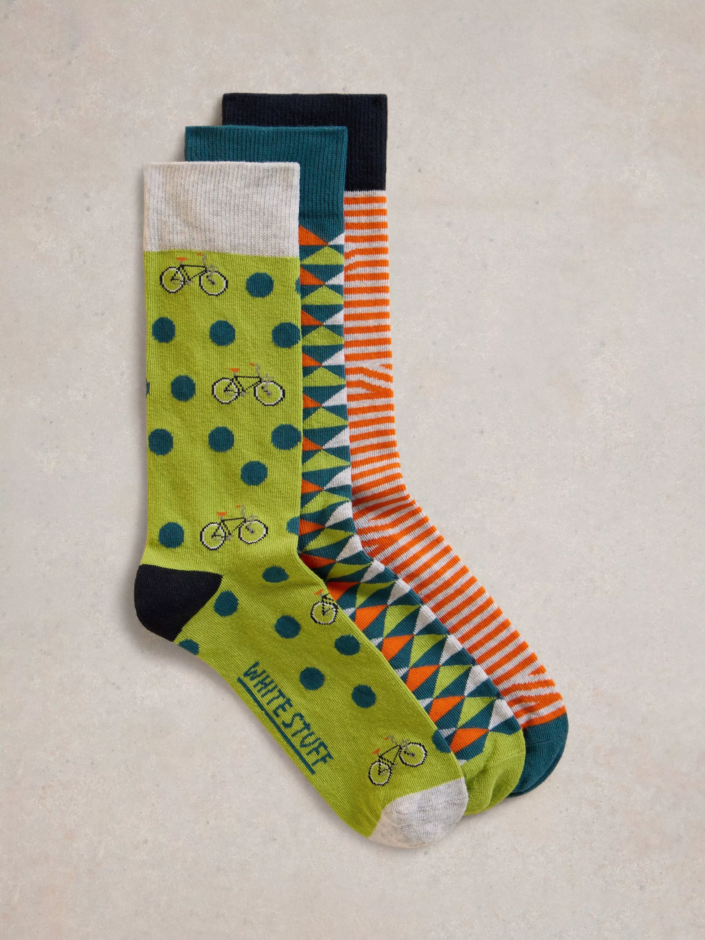 White StuffOrganic Cotton Blend Geometric & Bicycle Print Socks, Pack of 3