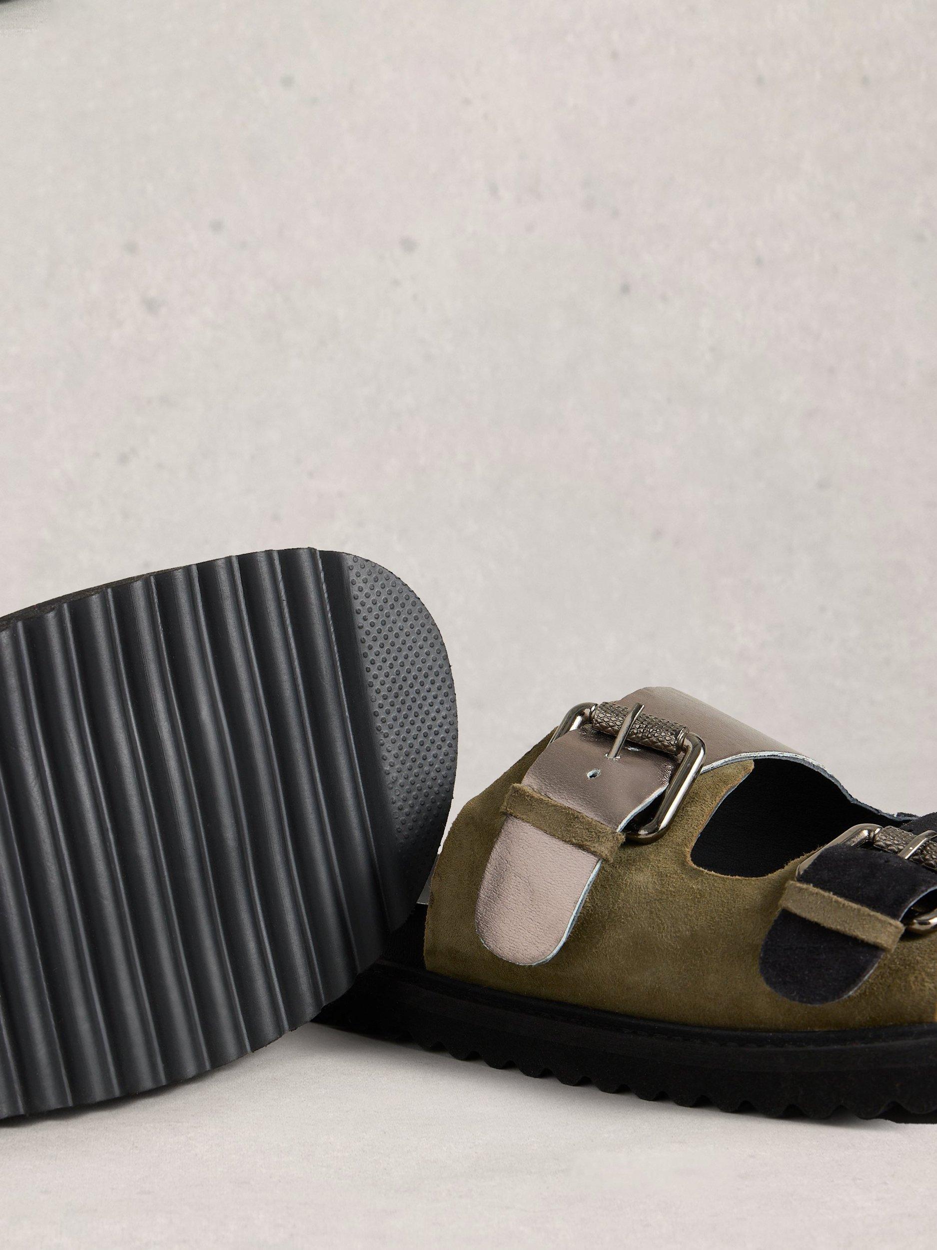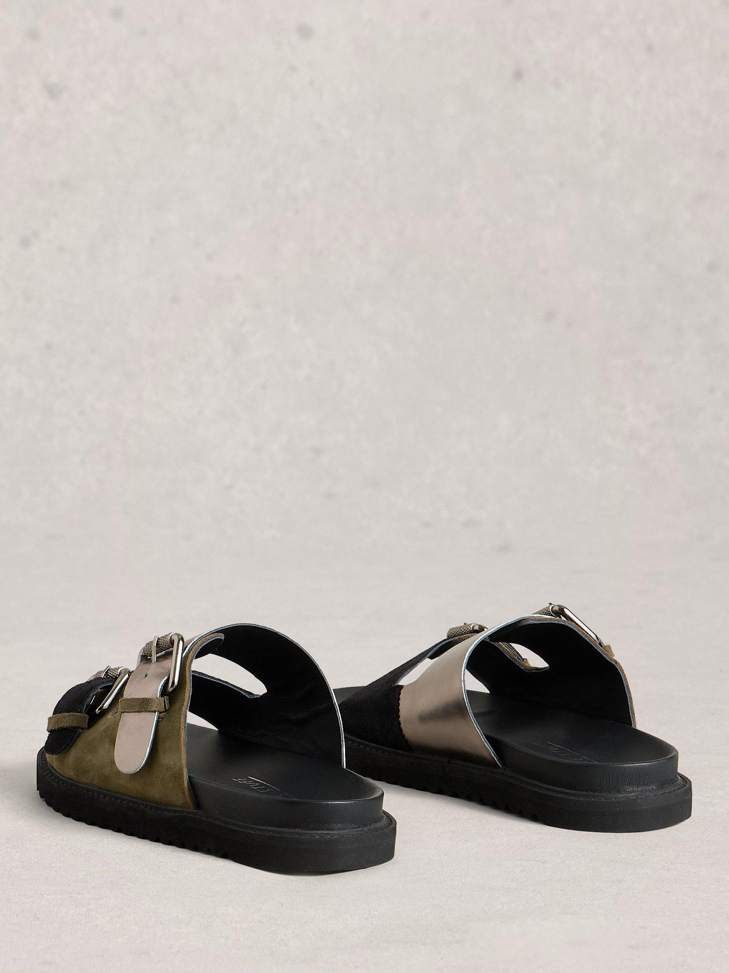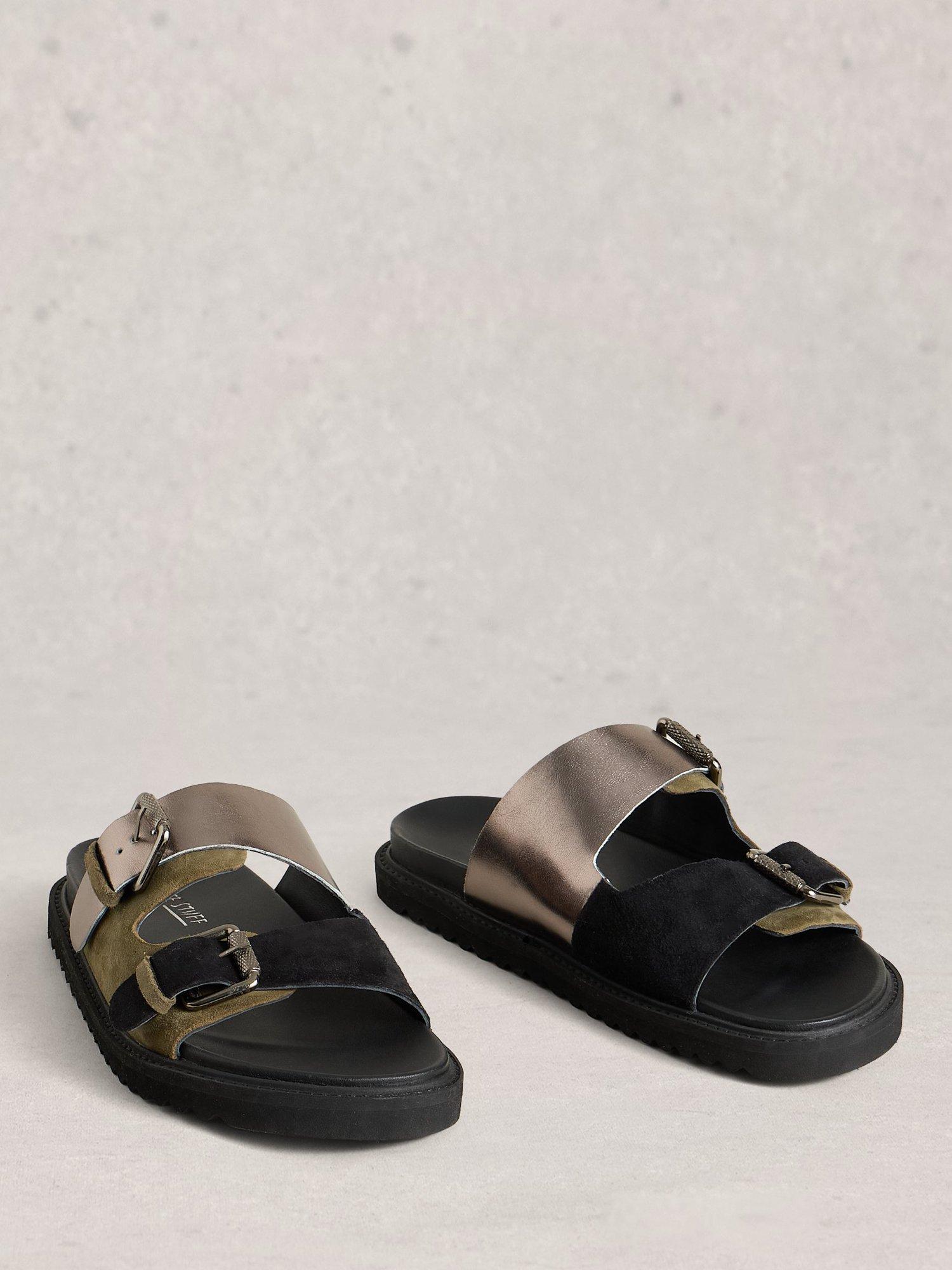 Metallic footbed sandals crafted in smooth leather and soft suede. The open toe design and easy buckle fastening keep you feeling relaxed and ready for whatever your day brings, from summer strolls to casual gatherings.