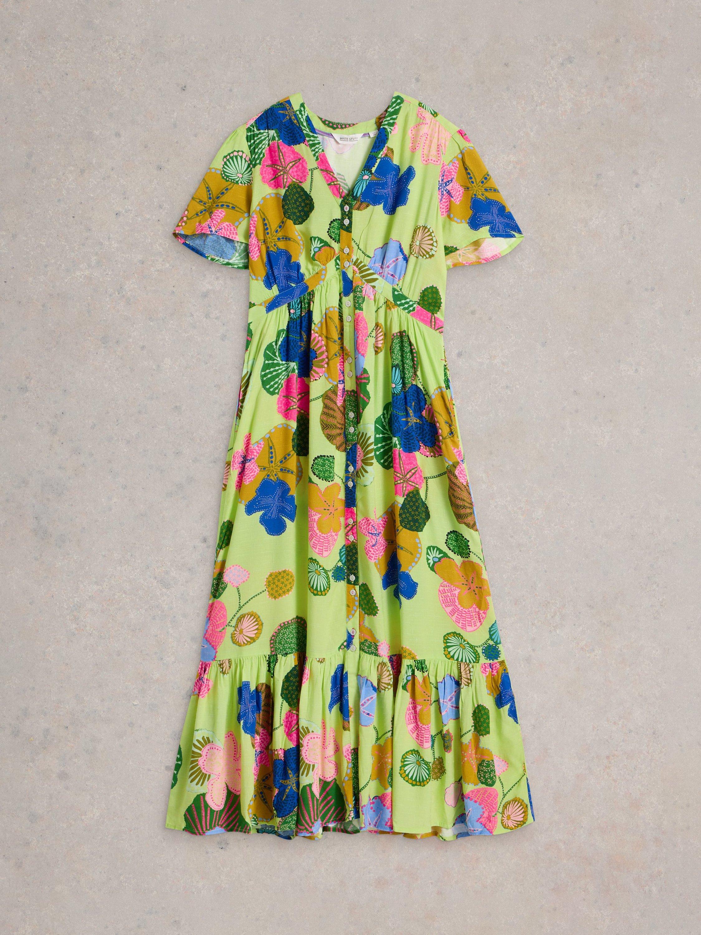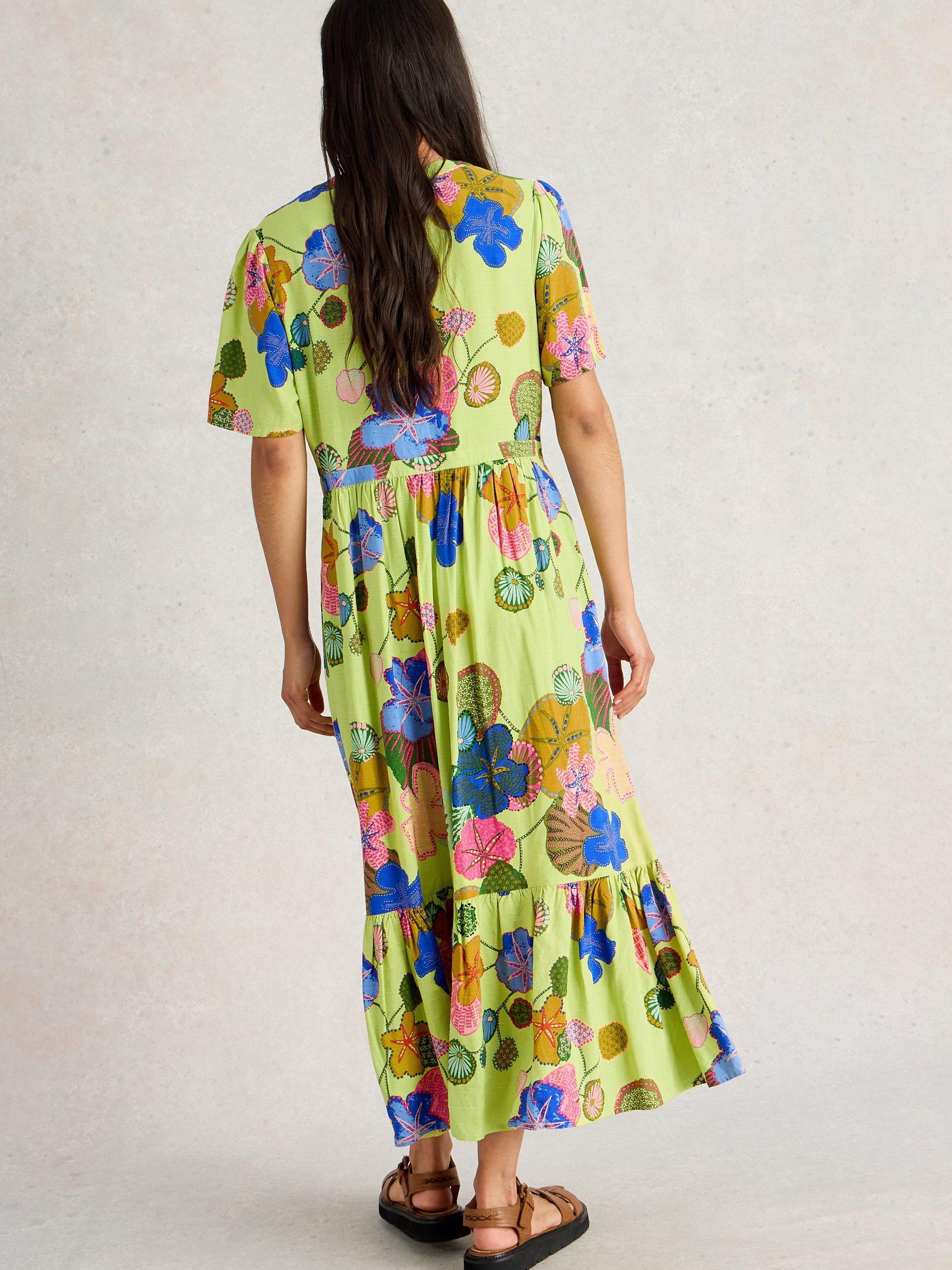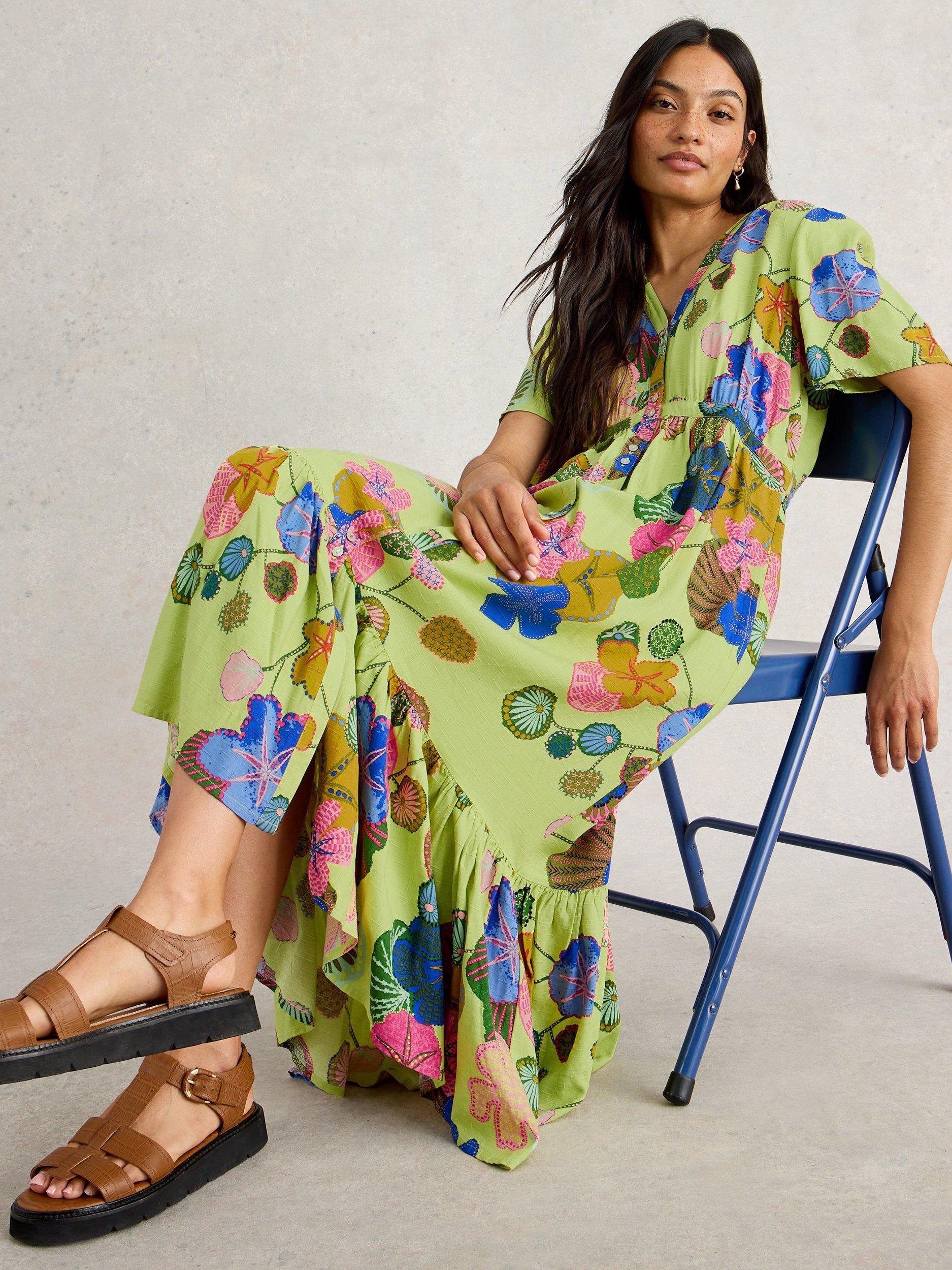 In an A-line shape with a single tiered hem for added flounce, this floor-length dress from White Stuff is made from soft viscose. With a simple v-neckline and short floaty sleeves, this style charms with an intriguing floral print.