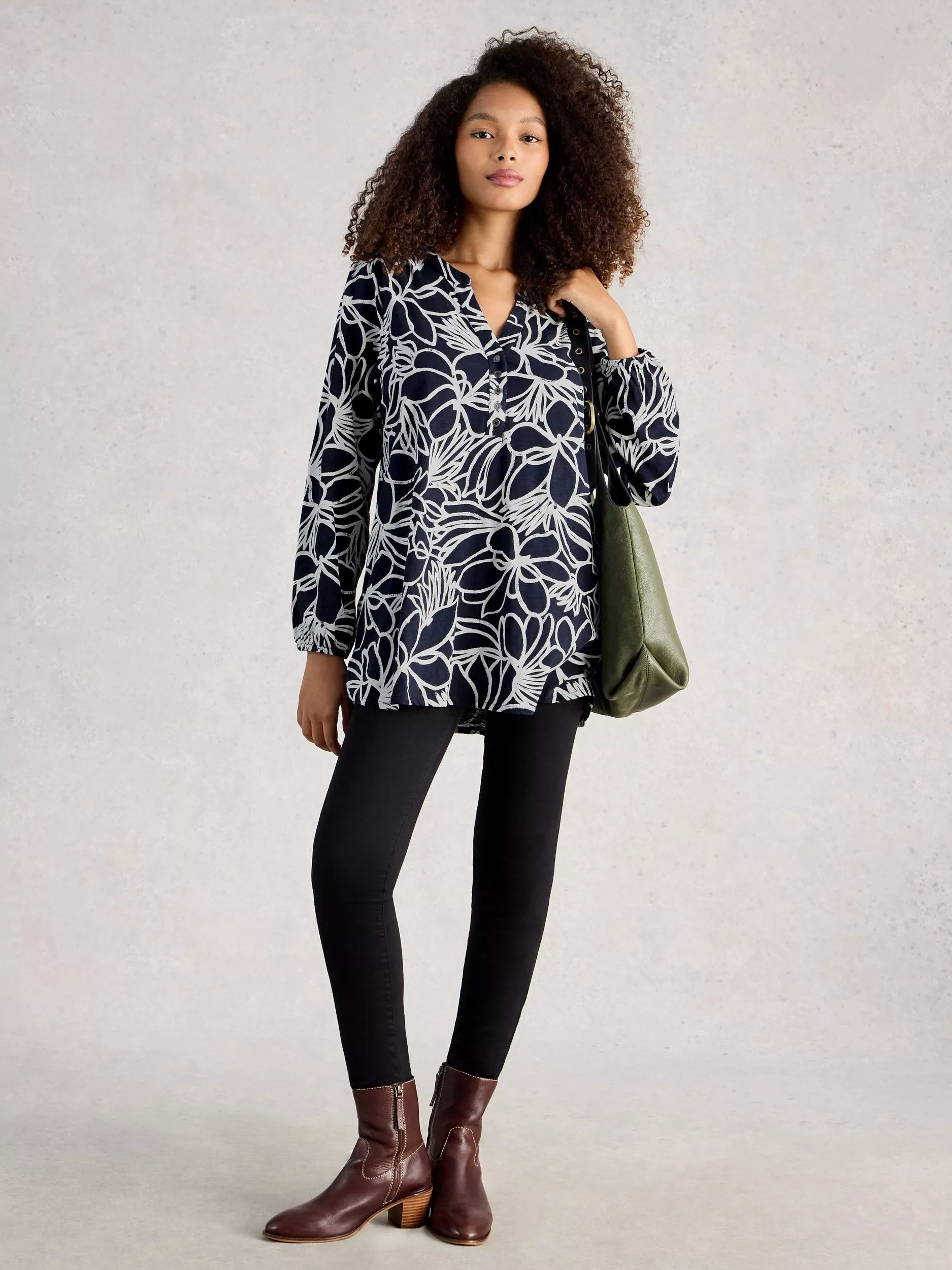 A longer in length, relaxed tunic top by White Stuff that's light and breathable in cotton. Featuring a V-neck and long sleeves, it will brighten your wardrobe with its pretty floral print. Perfectly polished for daily wear.