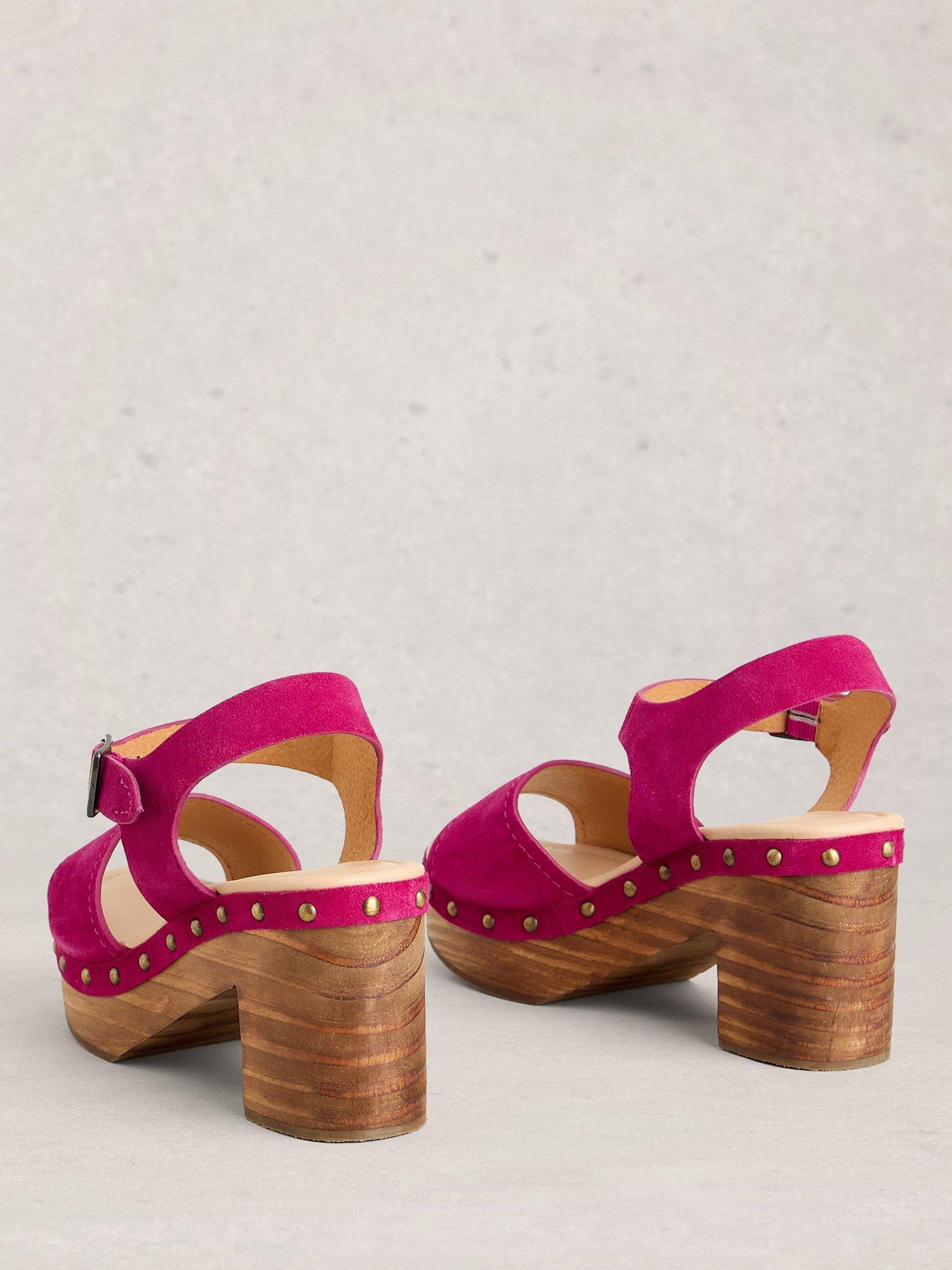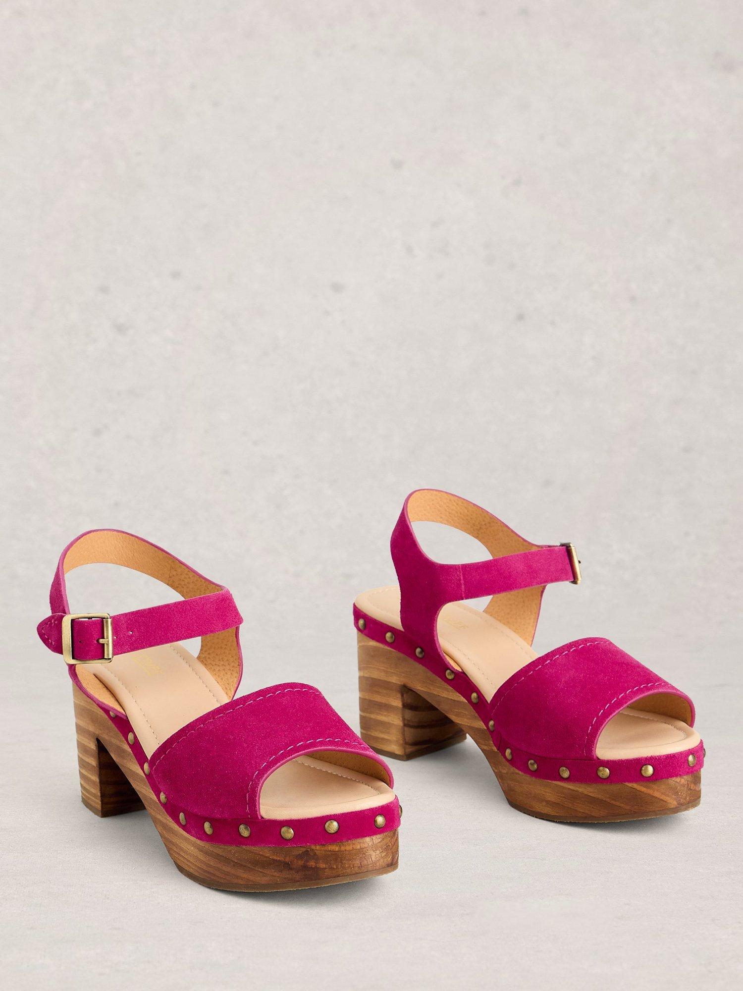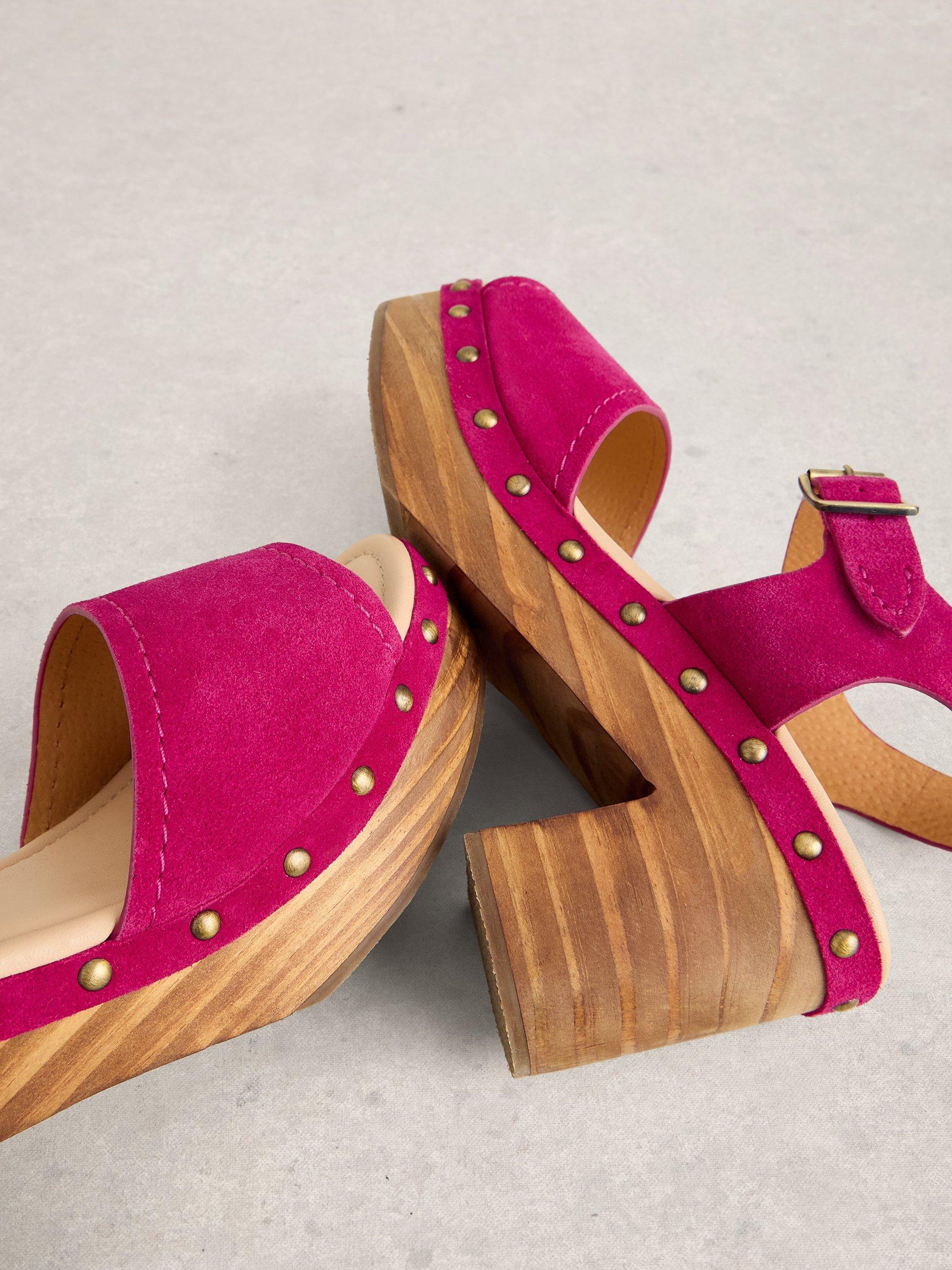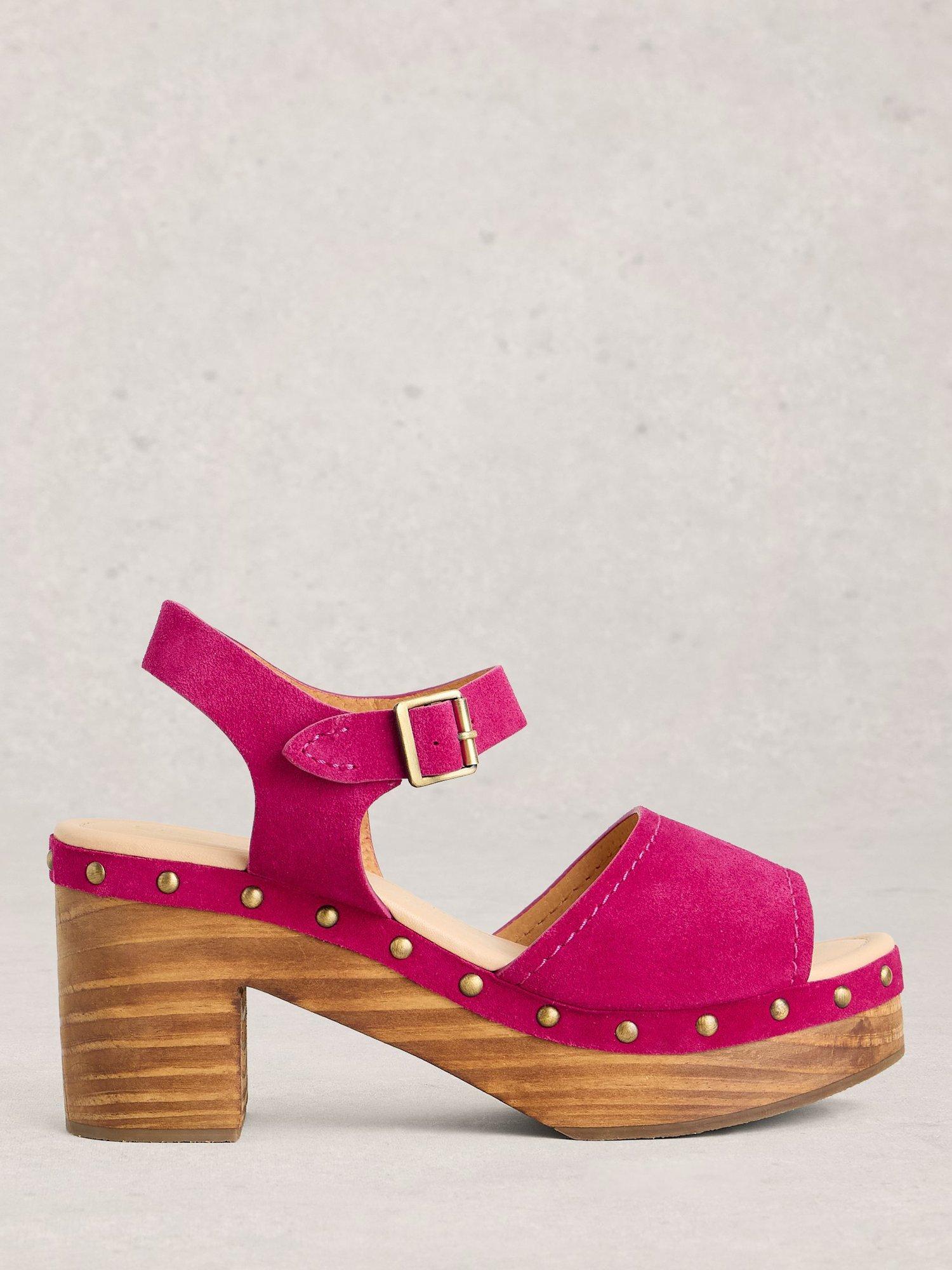 Heeled clog-style sandals by White Stuff in vibrant suede and set on a platform heel. With stud detailing and secured with a buckle fastening for a comfortable fit, they are ready for the summer ahead.