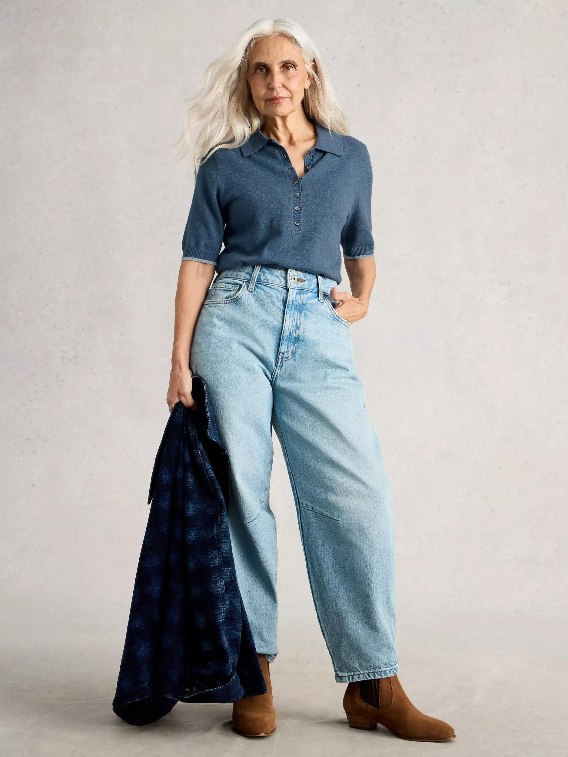 White StuffPoppy Knit Polo Shirt, Mid Blue