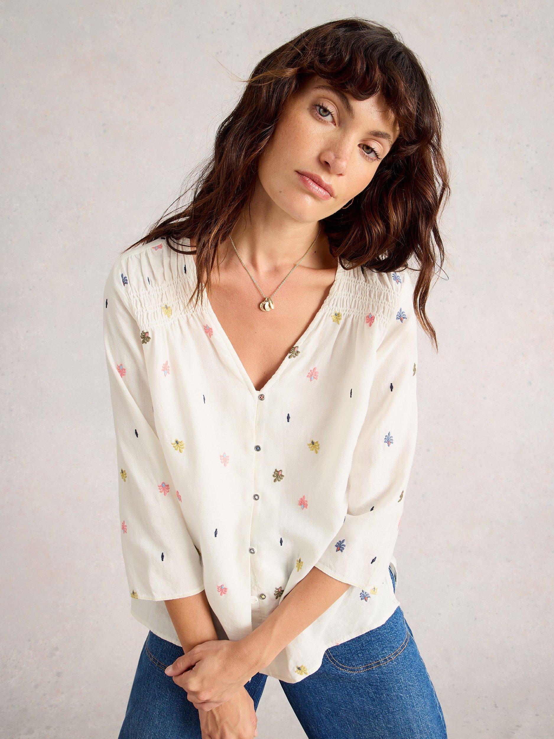 Soft dobby cotton meets intricate embroidery in this ditsy leaf blouse. The relaxed fit, V-neck and three quarter sleeves keep you comfortable at work or out with friends.