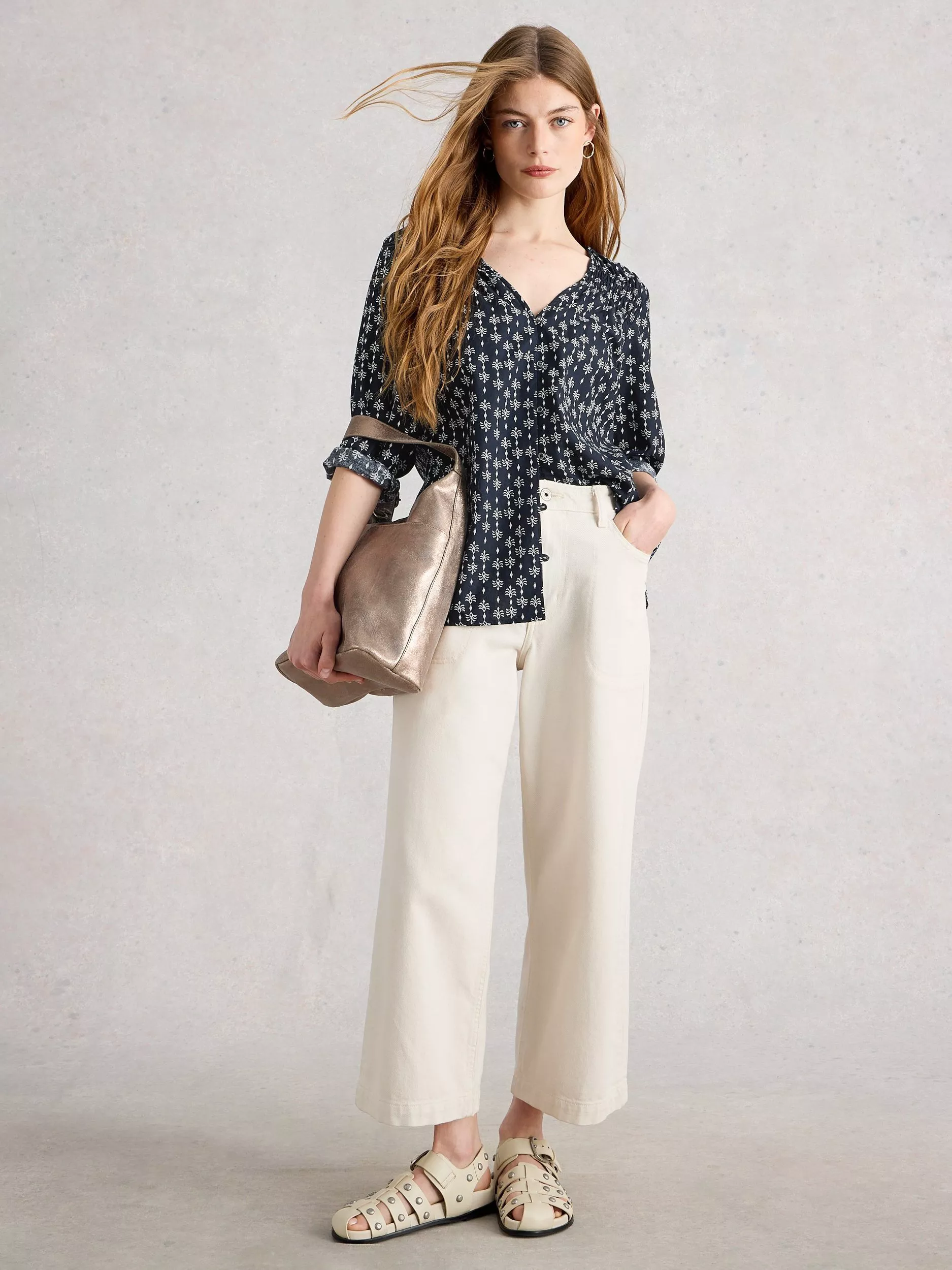 A soft organic cotton T-shirt with an abstract pattern and flattering V-neck, this top offers comfort for your day and a playful twist on everyday style. Three-quarter sleeves keep you comfortable as you move from one moment to the next.