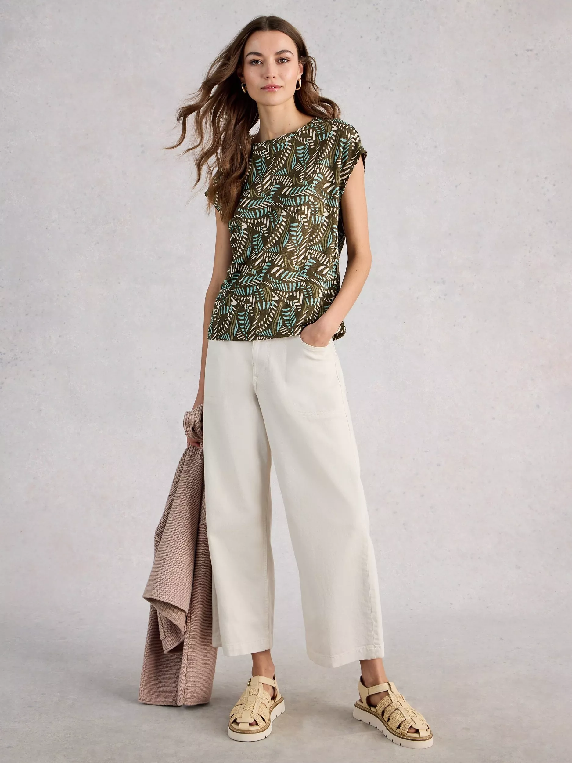 White StuffRowan Leaves Pure Linen T-Shirt, Green/Multi
