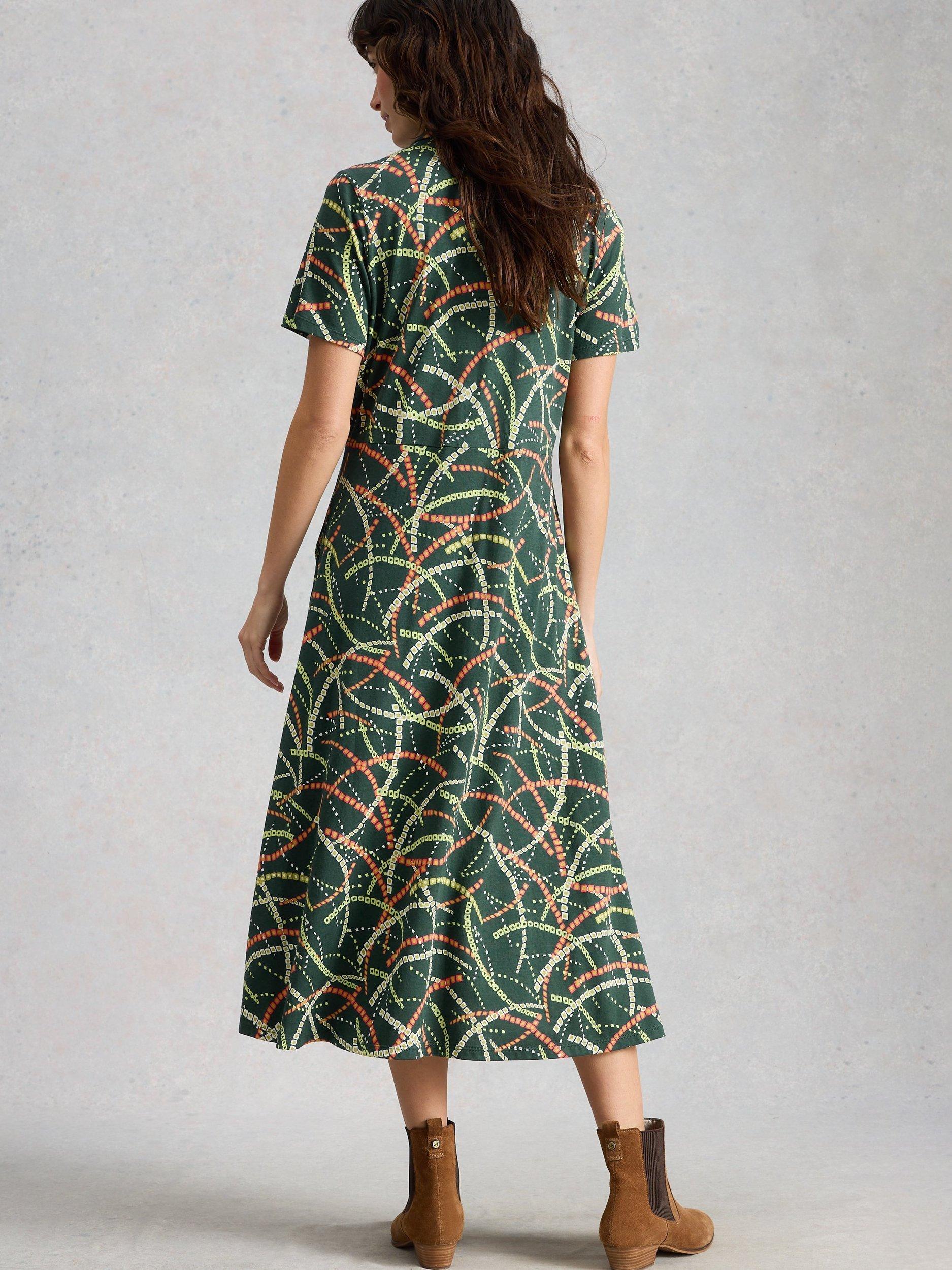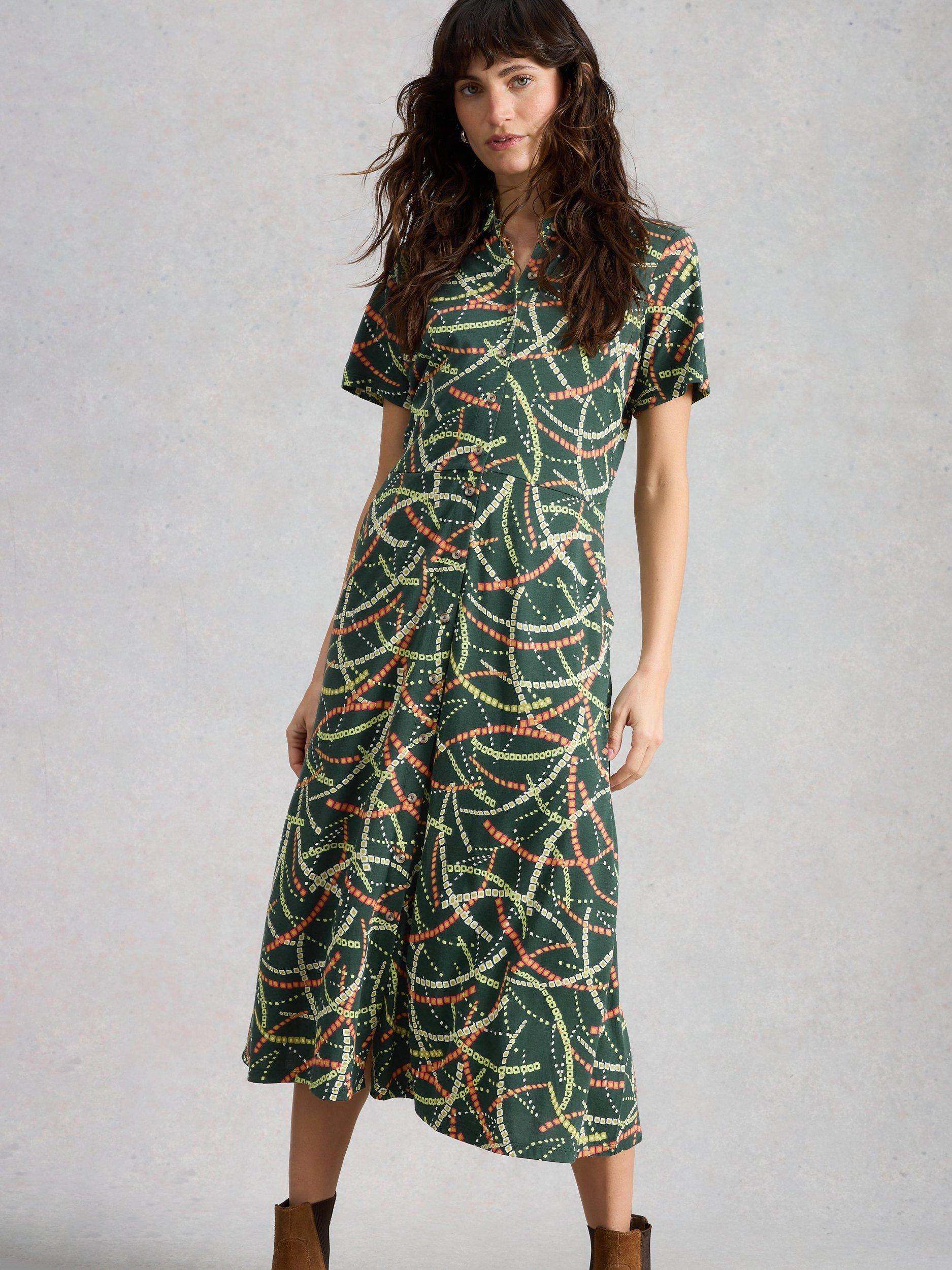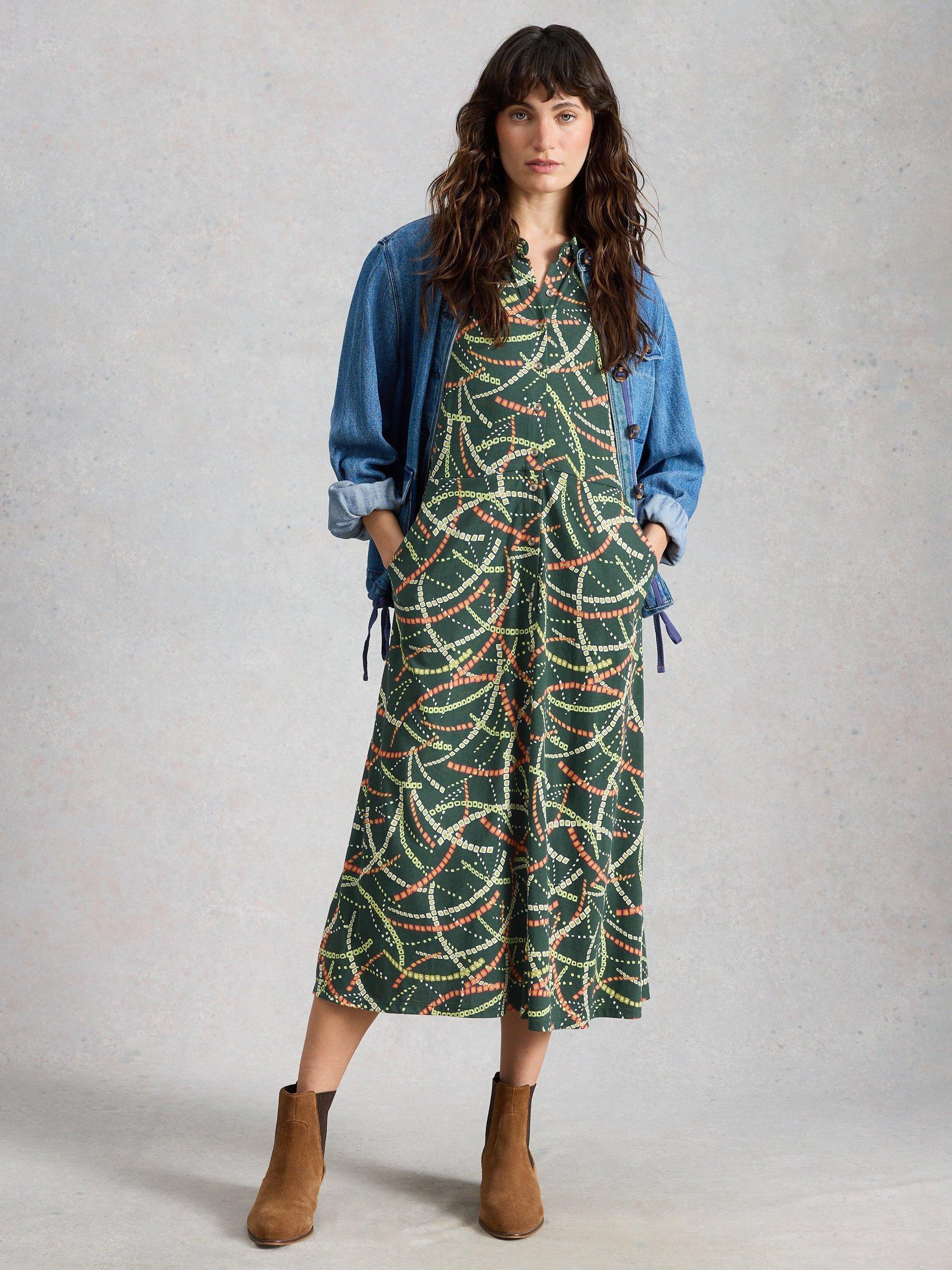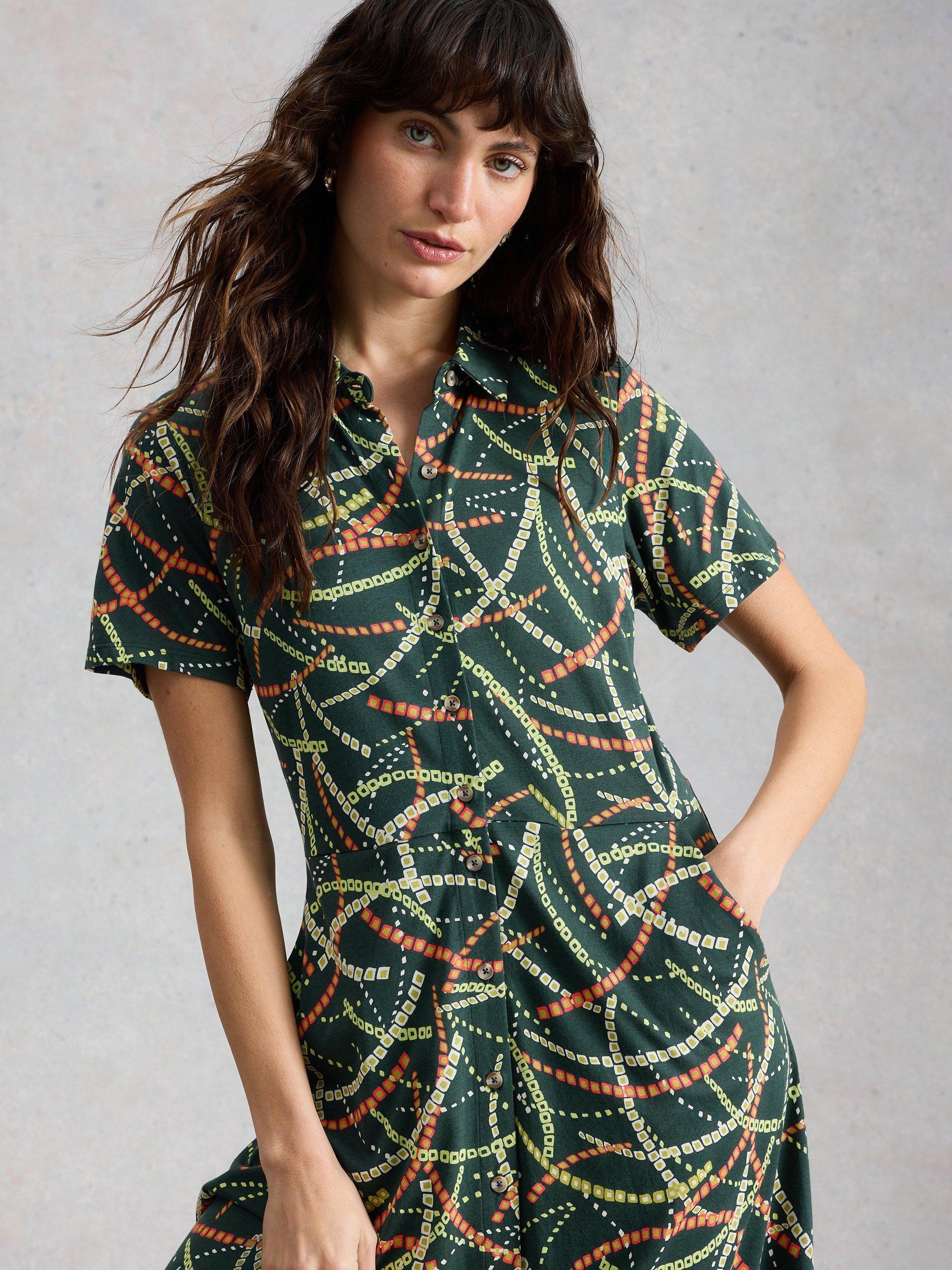 This midi jersey shirt dress by White Stuff brings a smart collar, playful abstract pattern, and soft cotton blend for all-day ease.