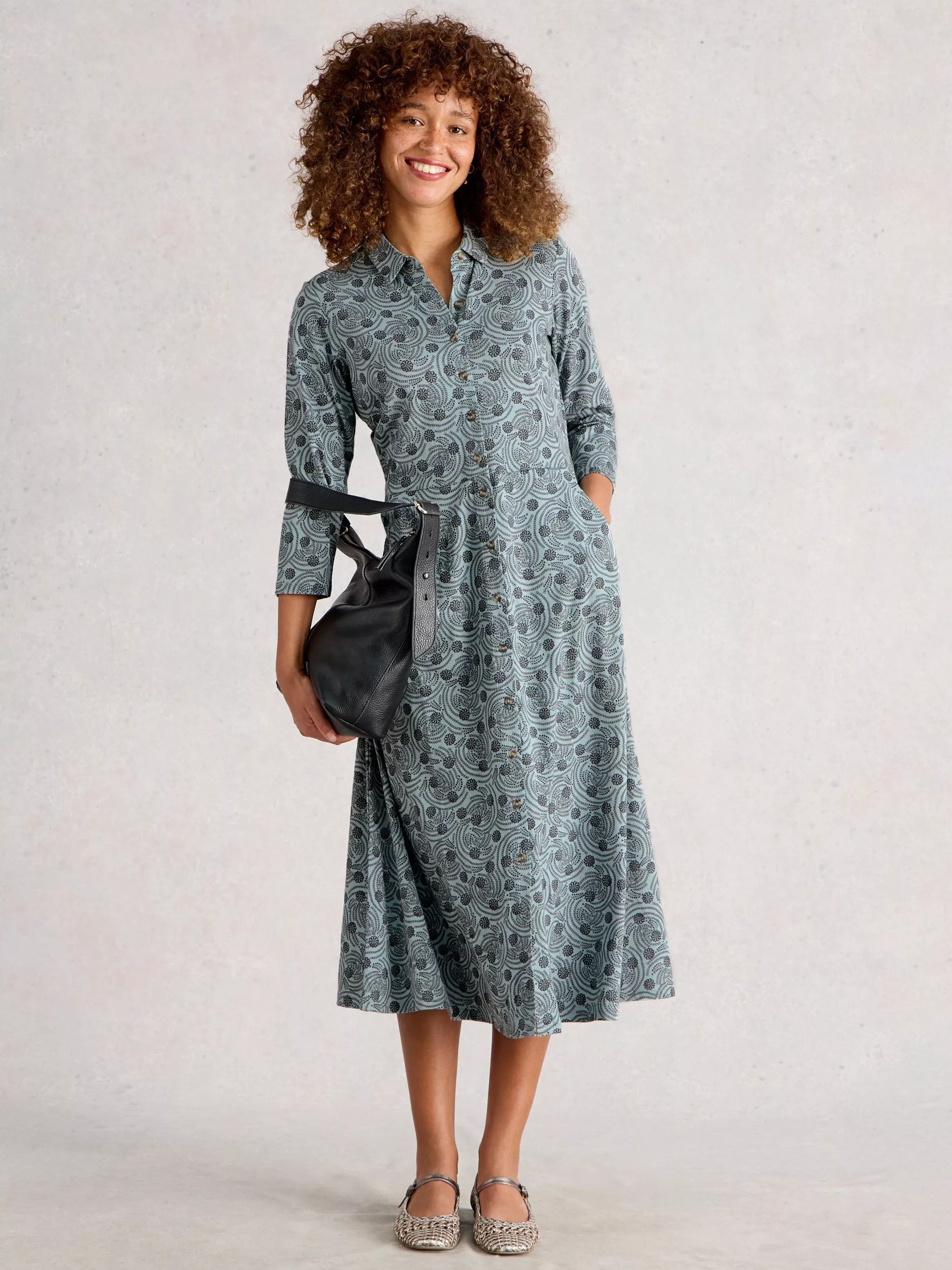 A midi shirt dress - crafted from a soft cotton blend for day-long ease. Its abstract pattern adds a spark of originality, while three quarter sleeves and a neat collar keep things smart.