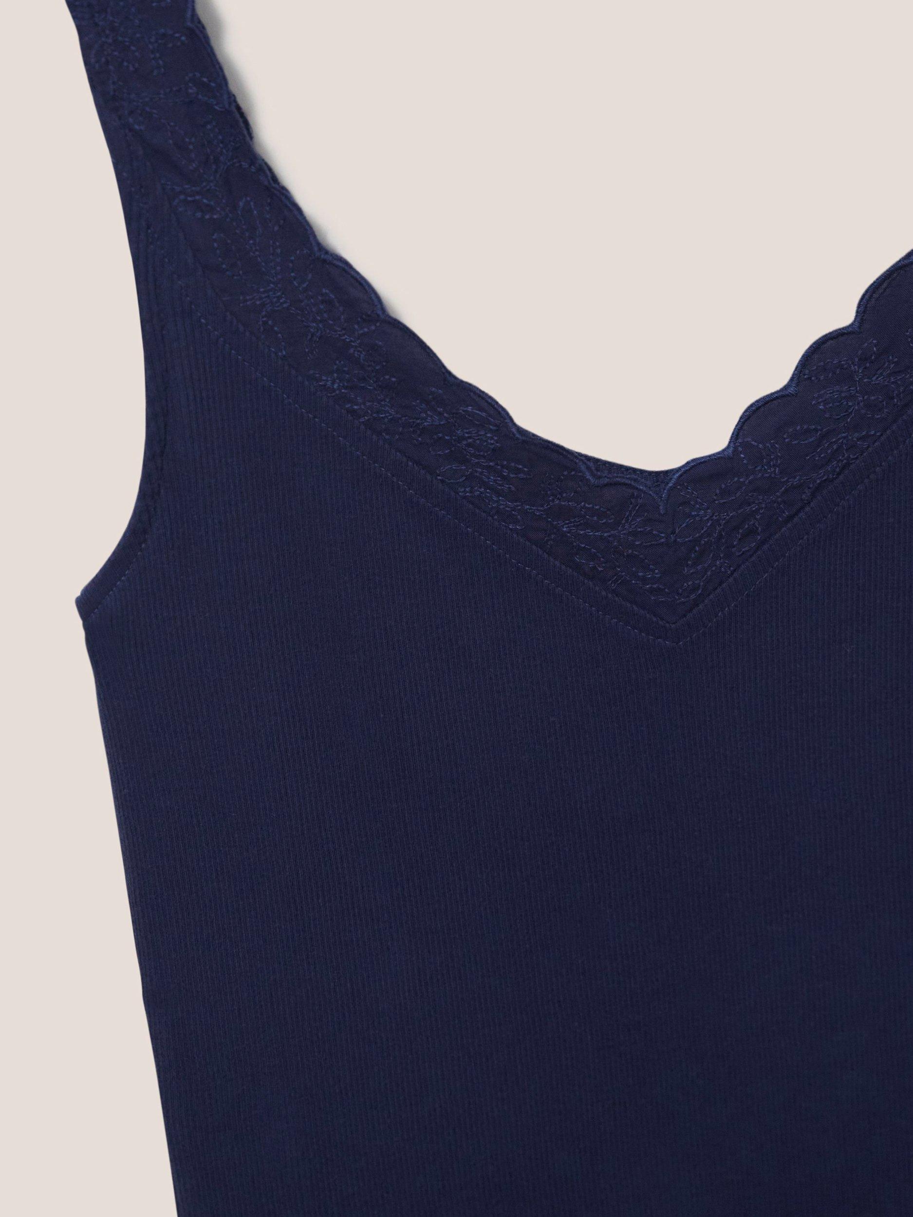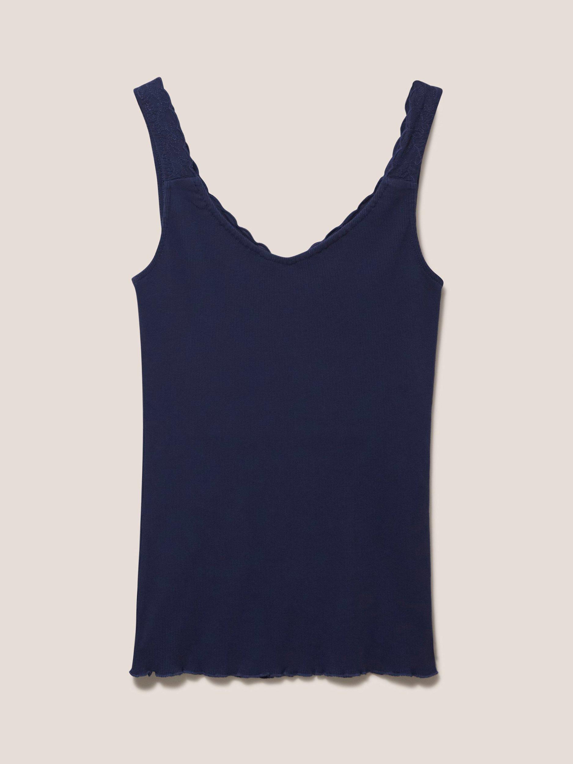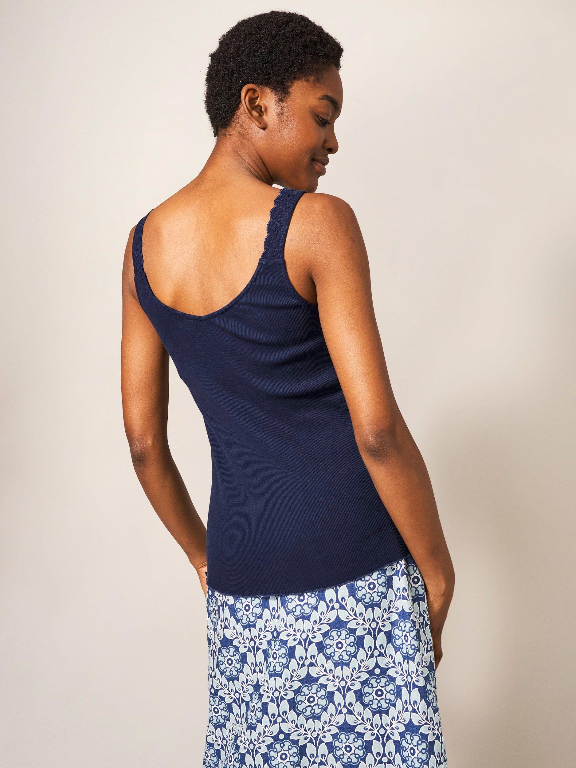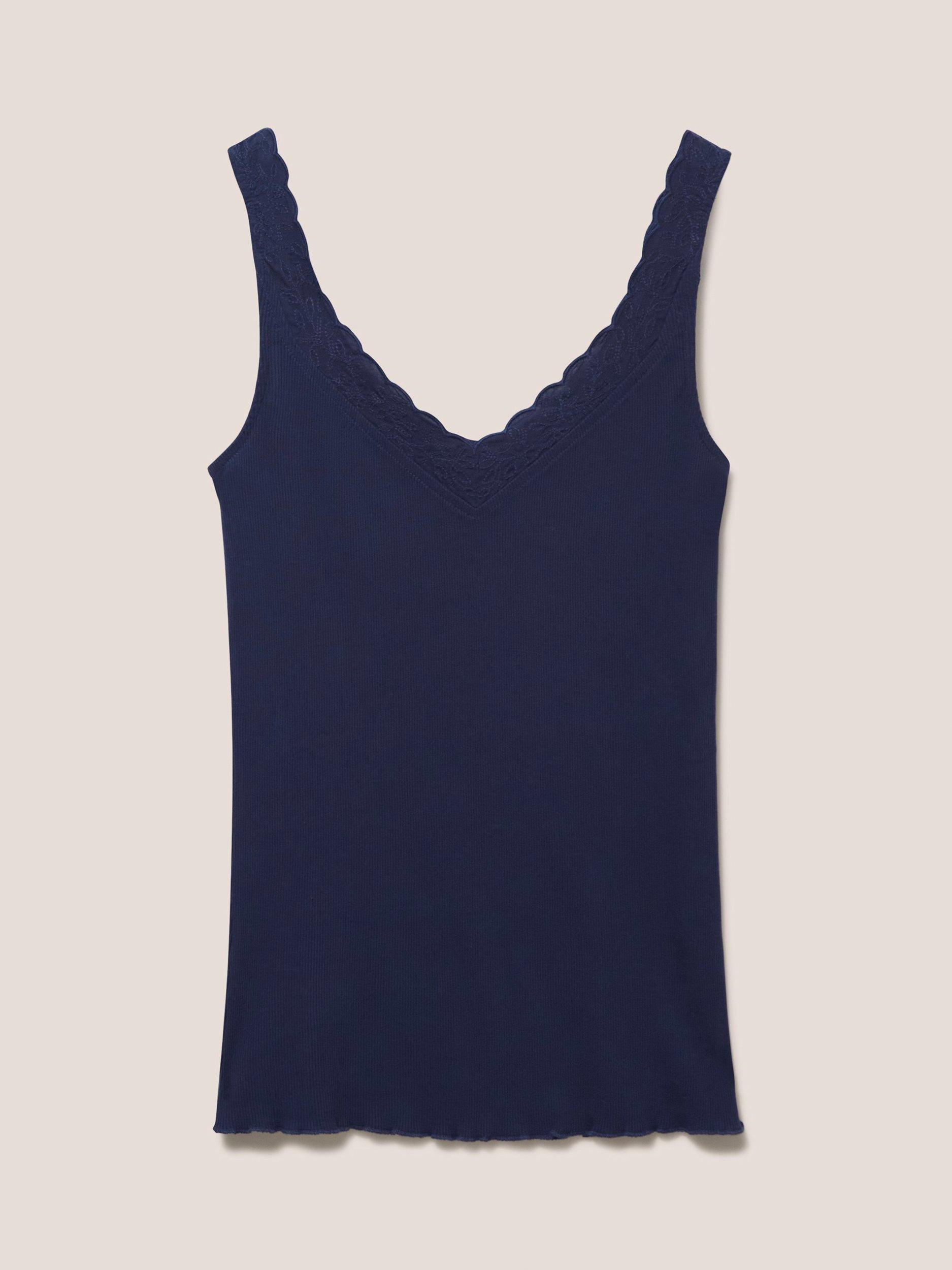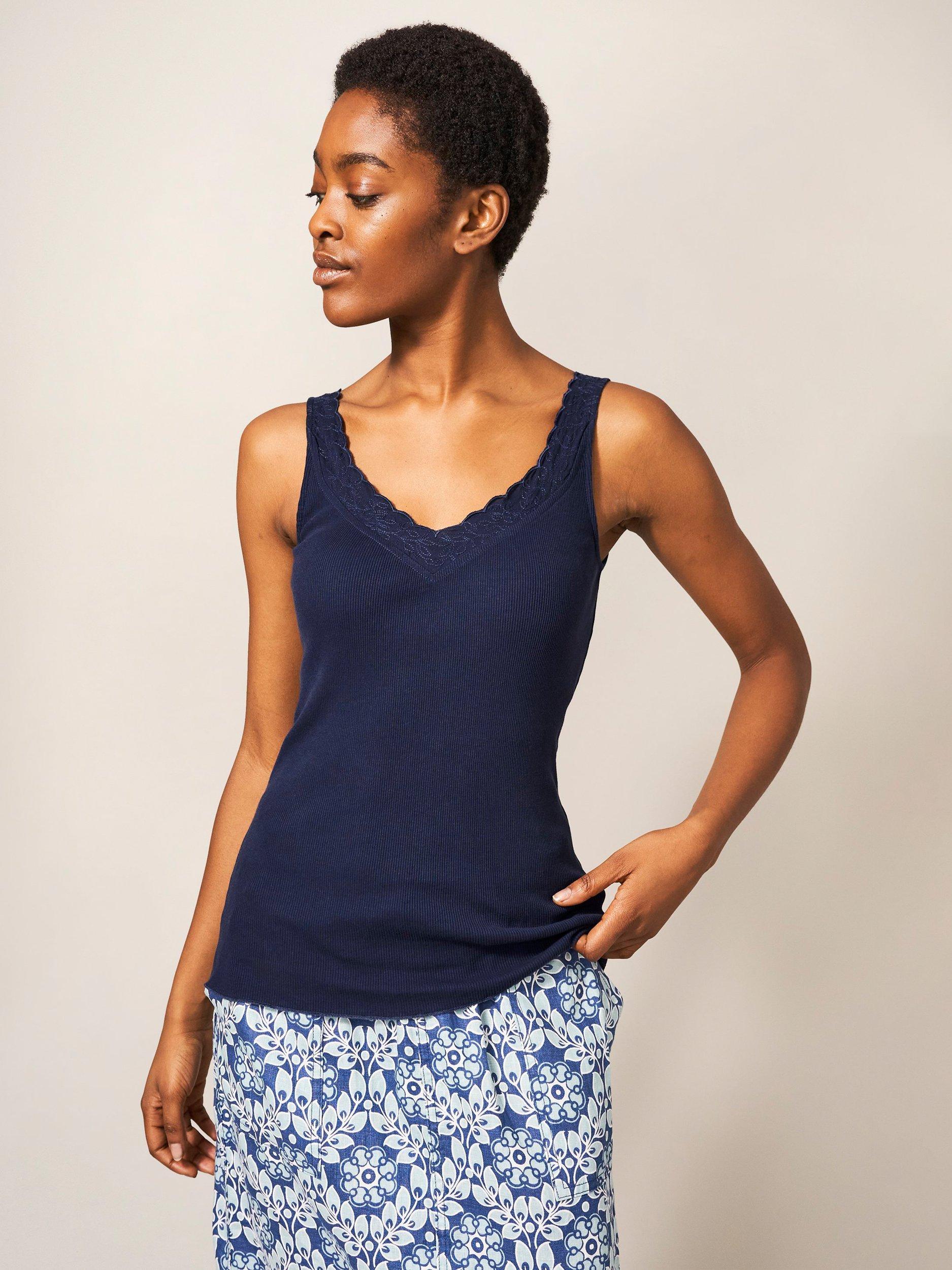 A pure cotton ribbed vest top with lace detail on the neckline.
