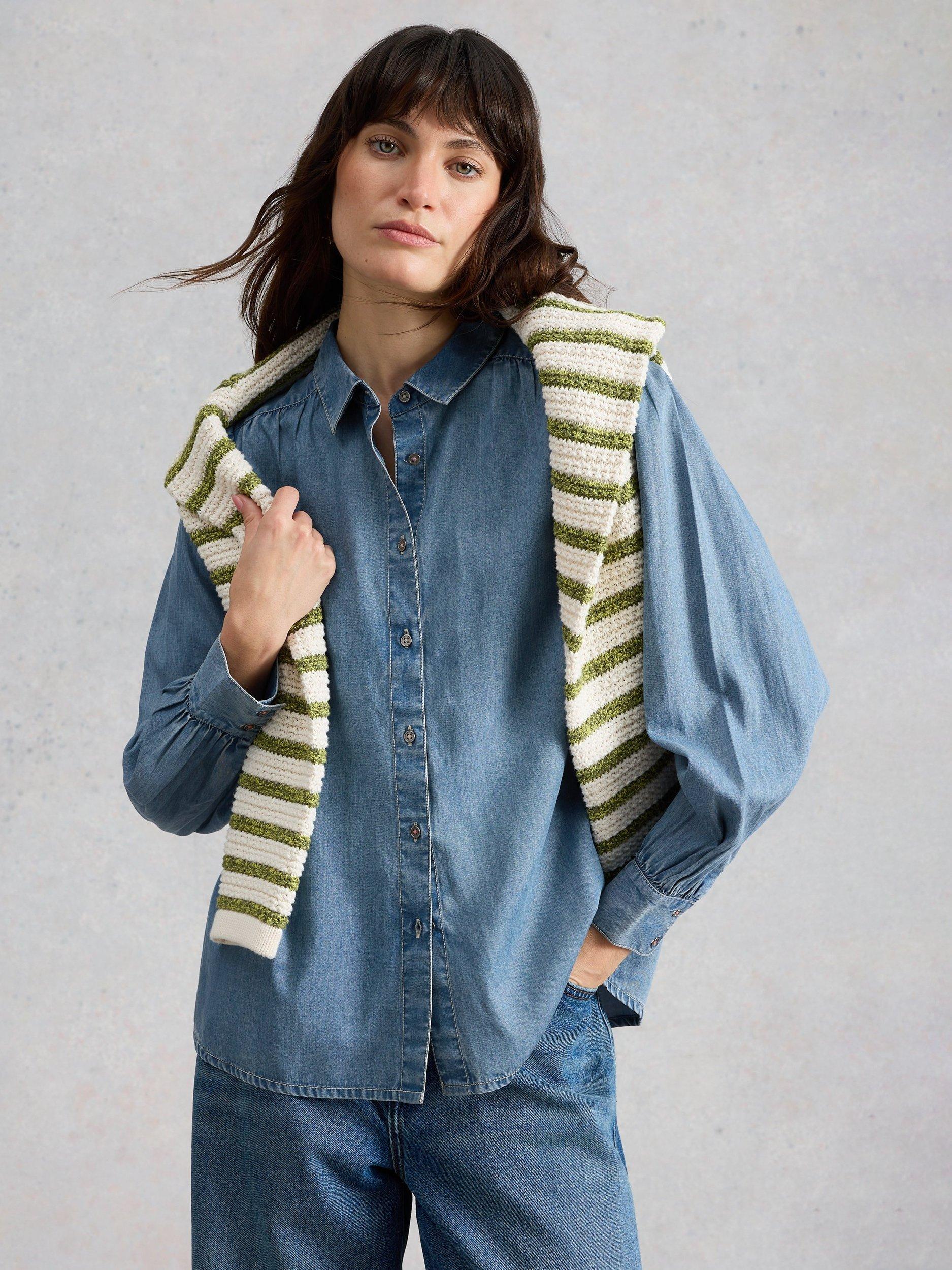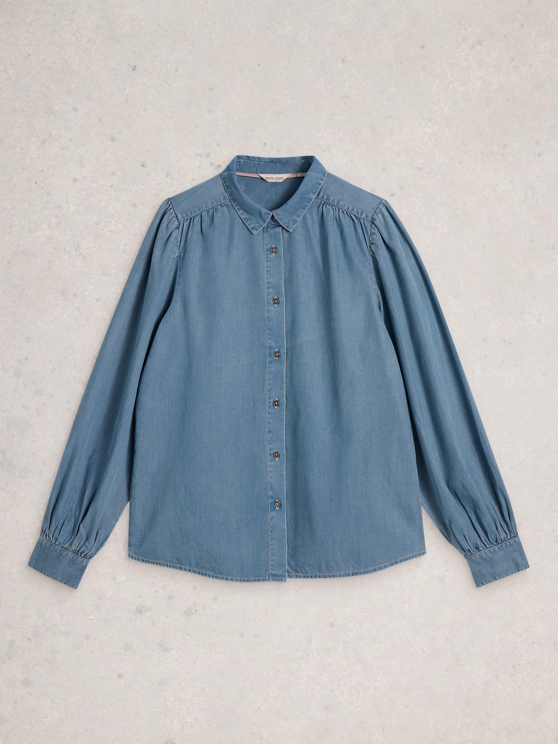 This style has a flattering fit with gauging at the shoulder and seam details on the cuff.