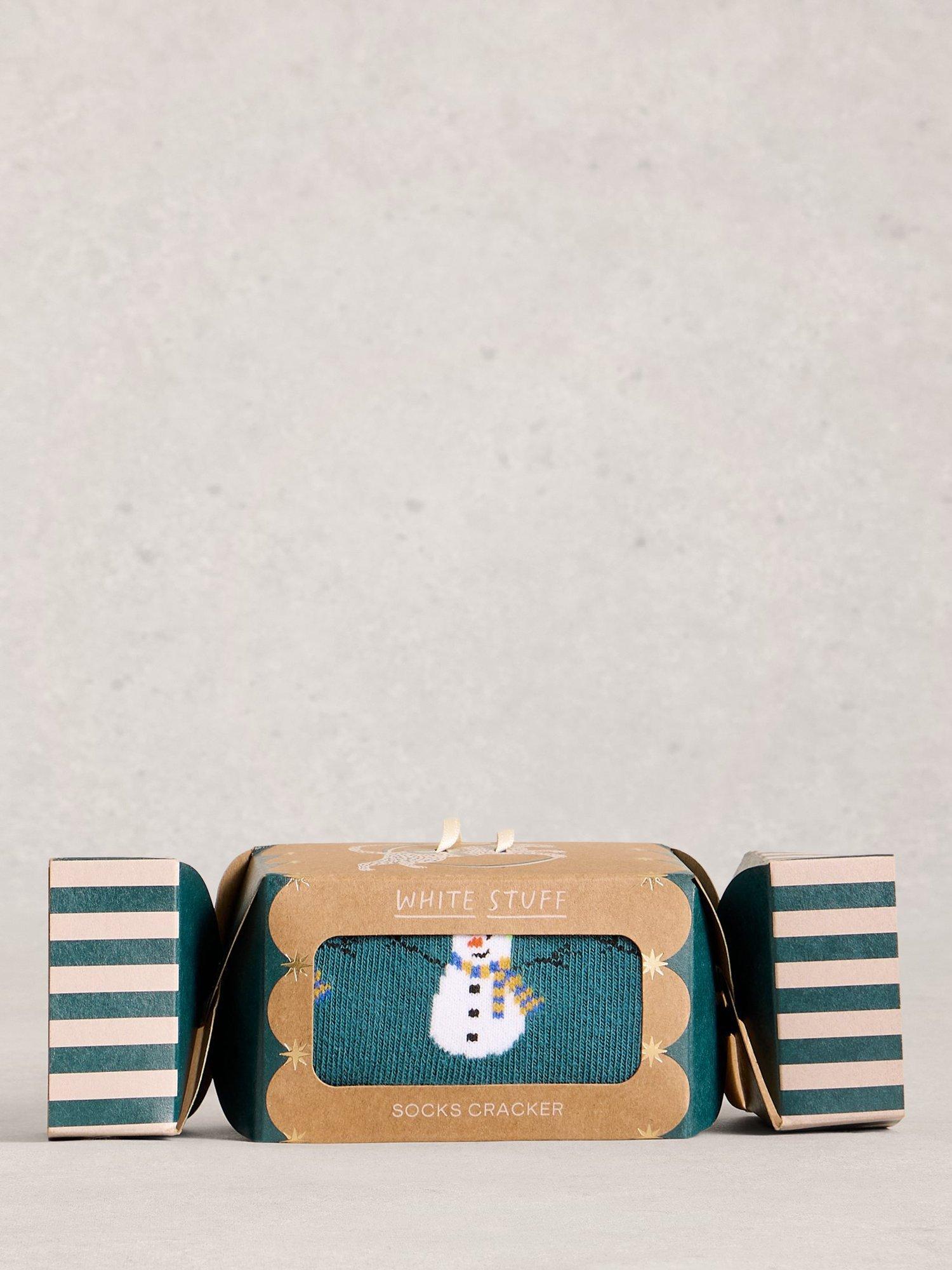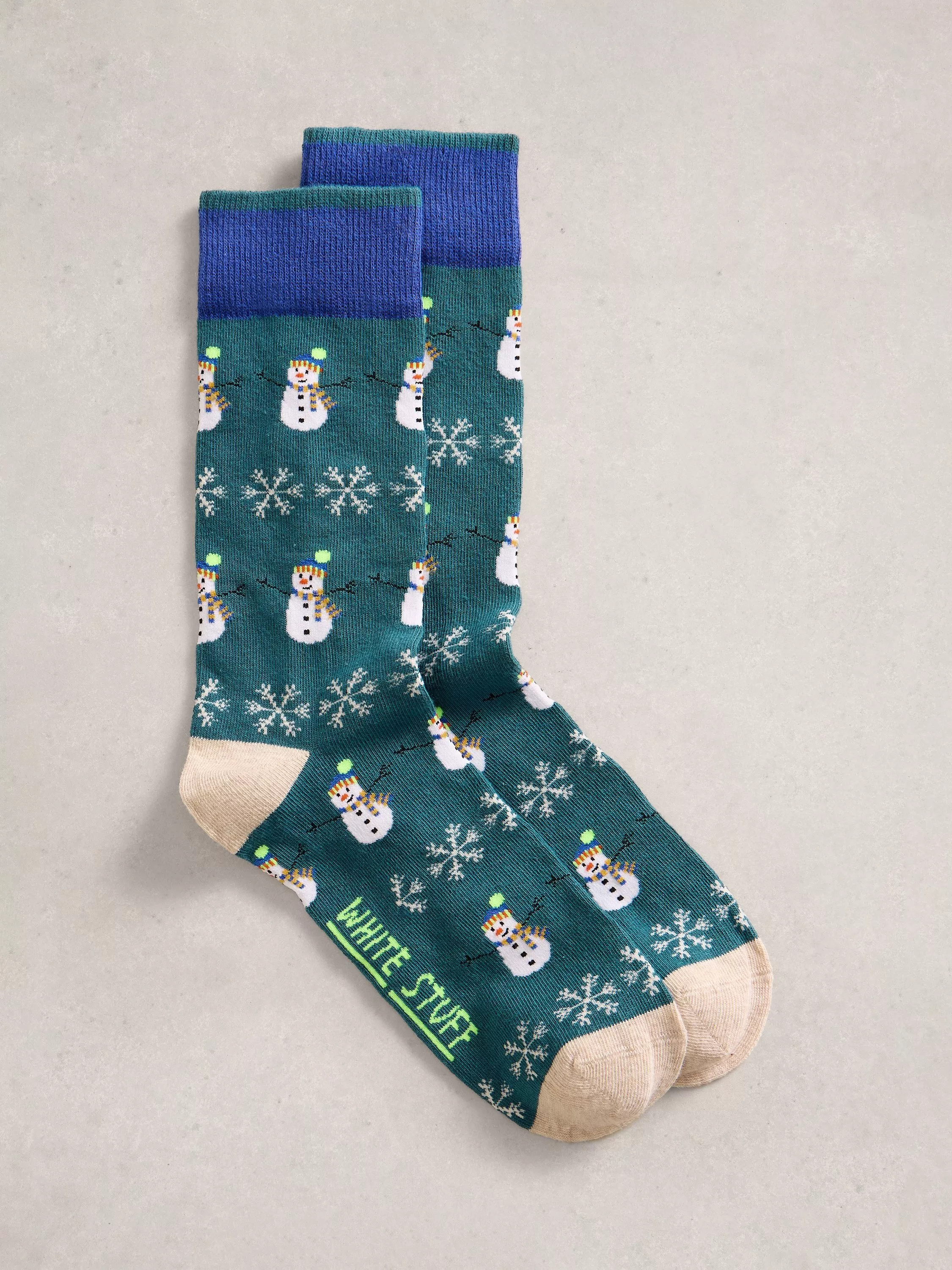 A pair of snowmen print crew socks from White Stuff, blended with cotton and packaged in a gift-ready cracker.