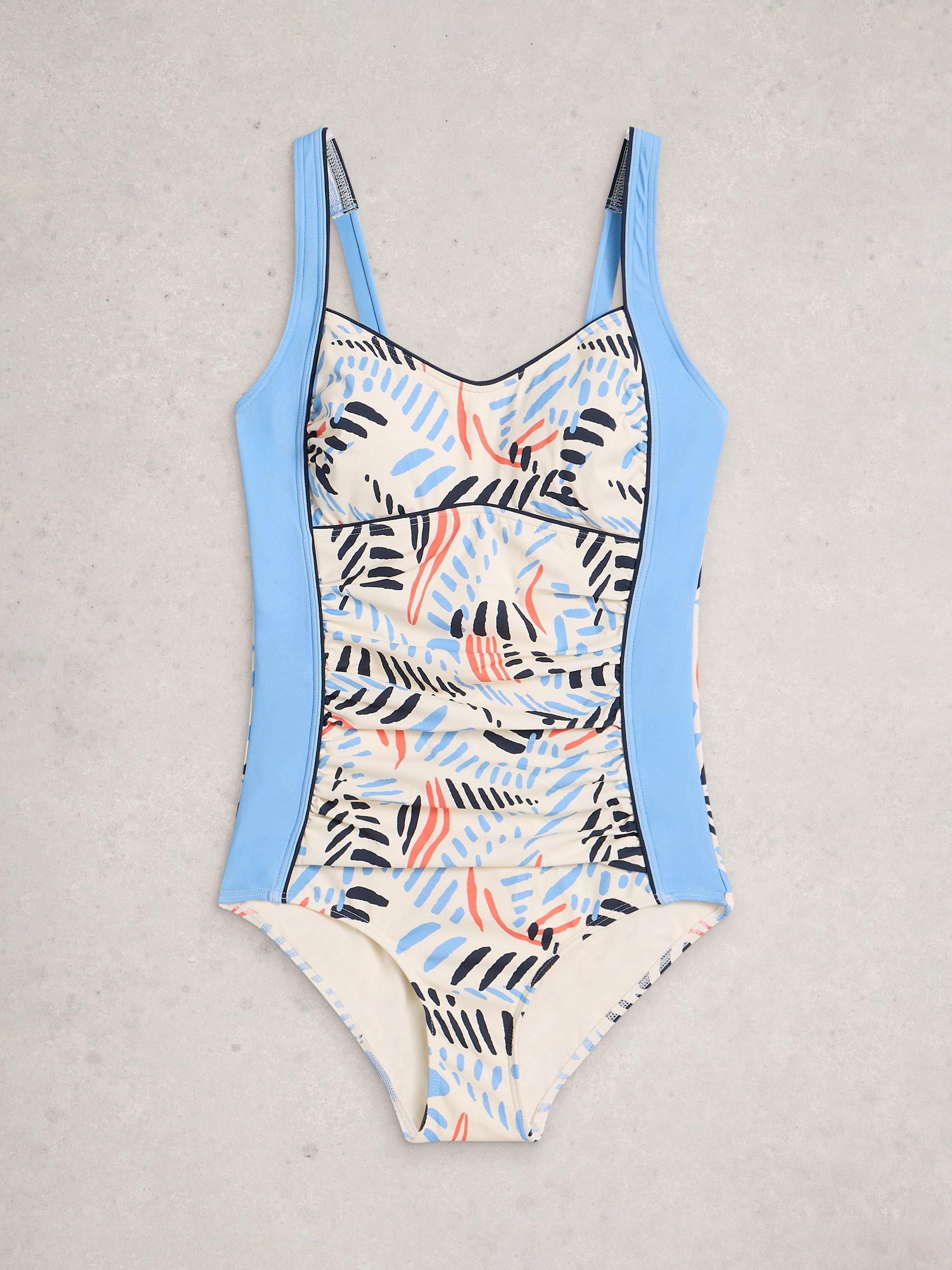 Feel comfortable and free in this non wired high leg swimsuit from White Stuff. The high back and scoop neck keep you secure while the abstract pattern adds a fun twist to your swim sessions. Finished with tummy control ruching and elasticated sides.