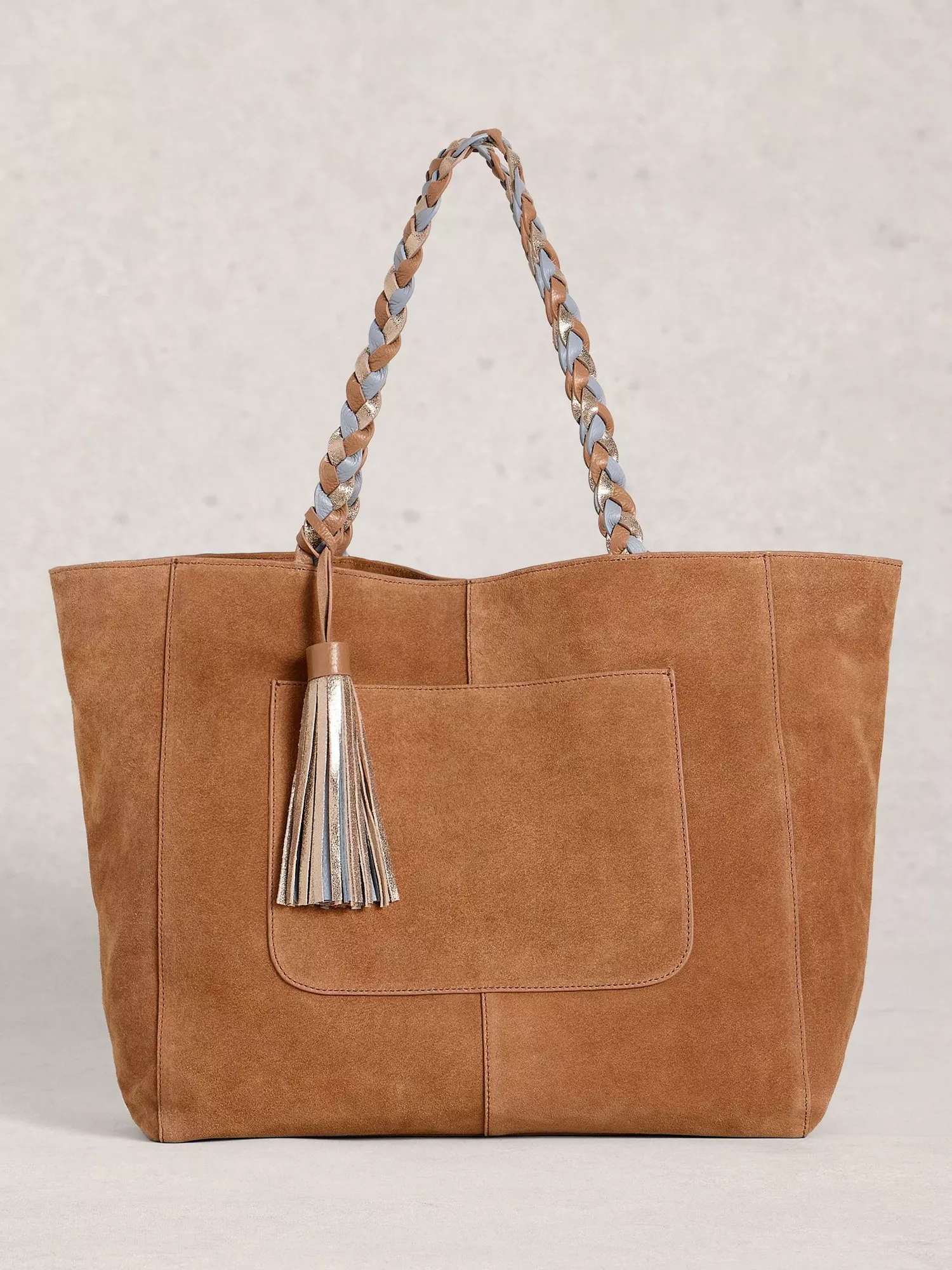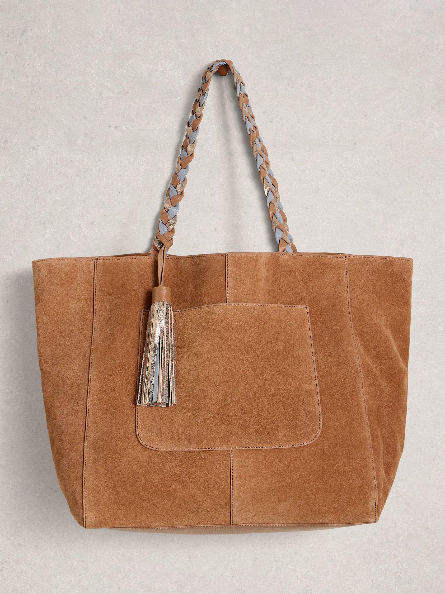 A soft slouch extra large suede tote with front suede pocket, plaited leather handles and leather tassle.