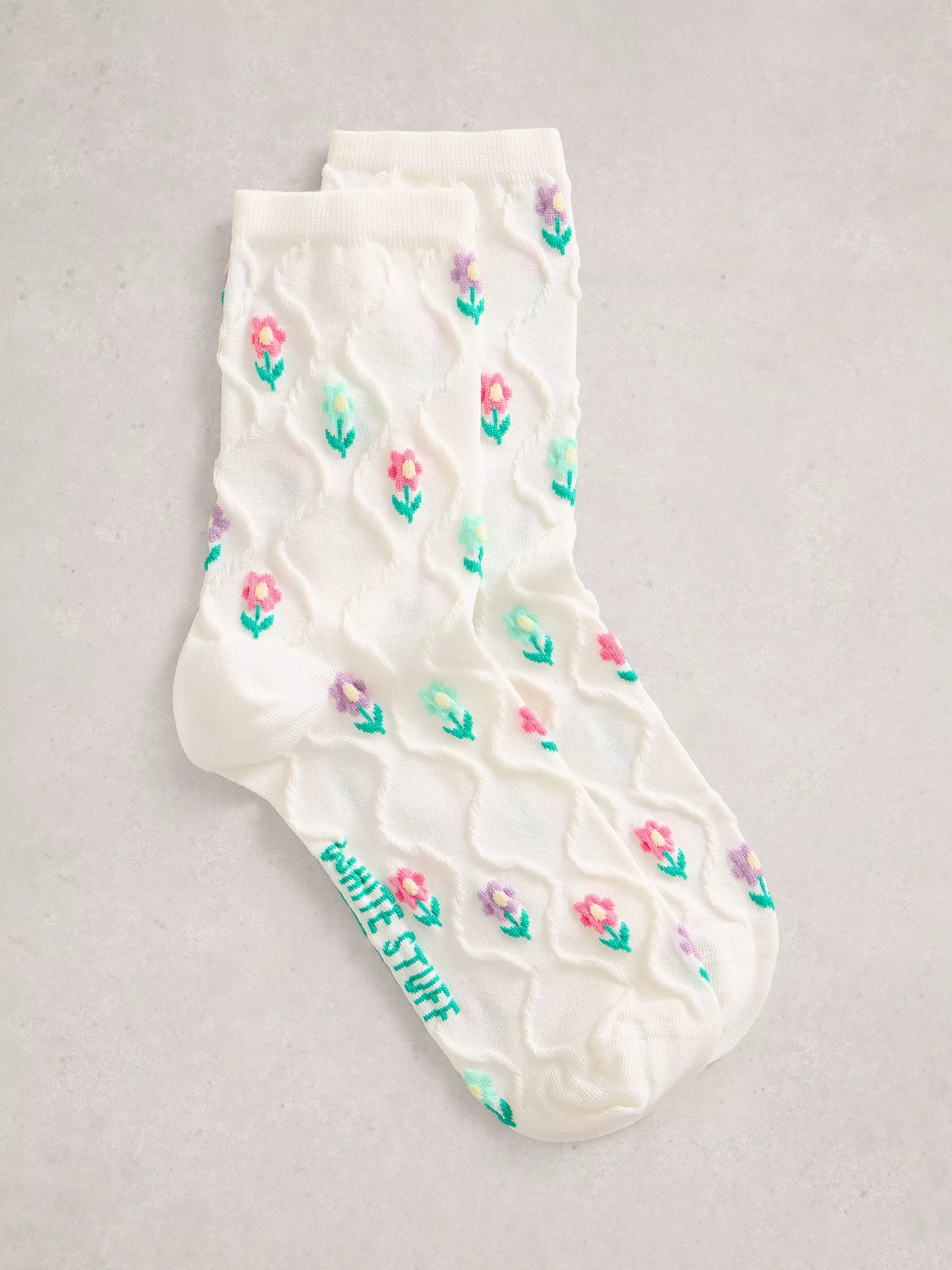 A pair of textured floral ankle socks from White Stuff that come in a soft cotton blend material for everyday comfort.