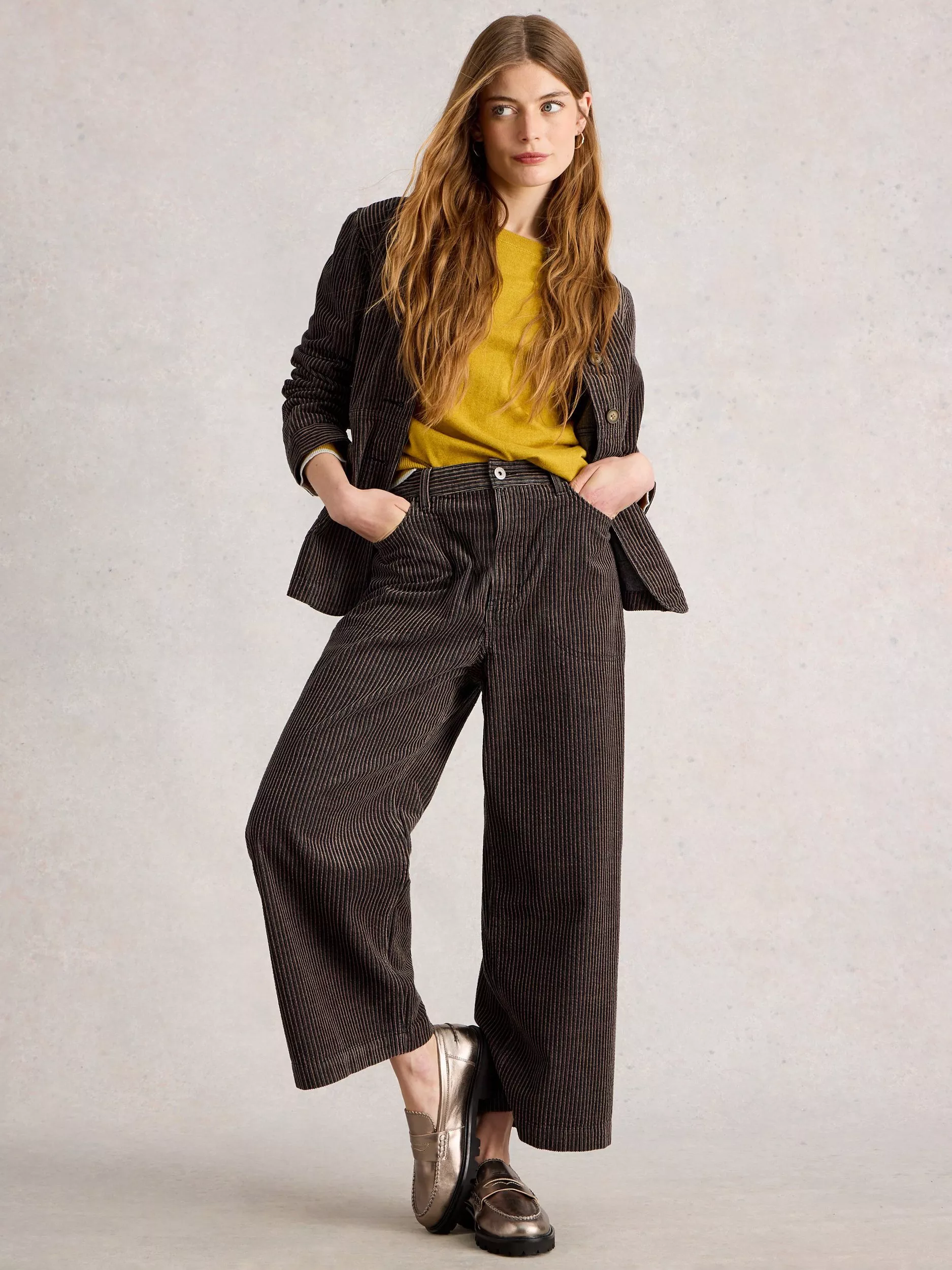 A pair of confident, exaggerated wide-leg corduroy trousers by White Stuff. Soft organic cotton, playful stripes, and a practical zip fastening help you move with confidence and style from morning plans to evening catch-ups.