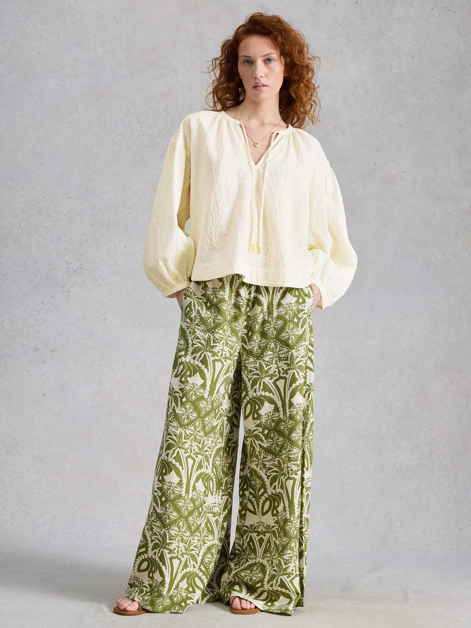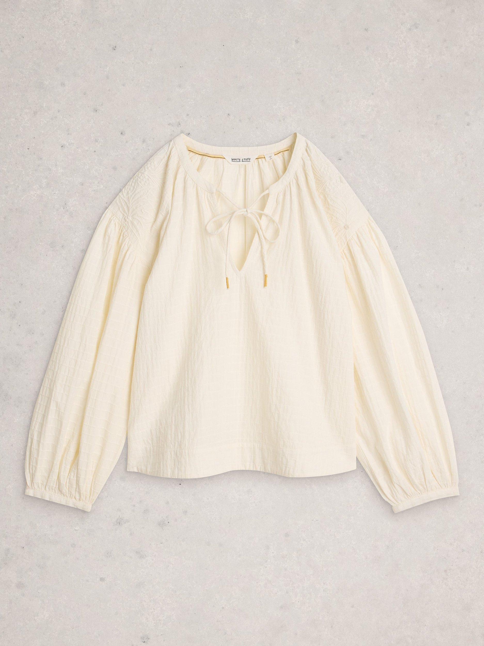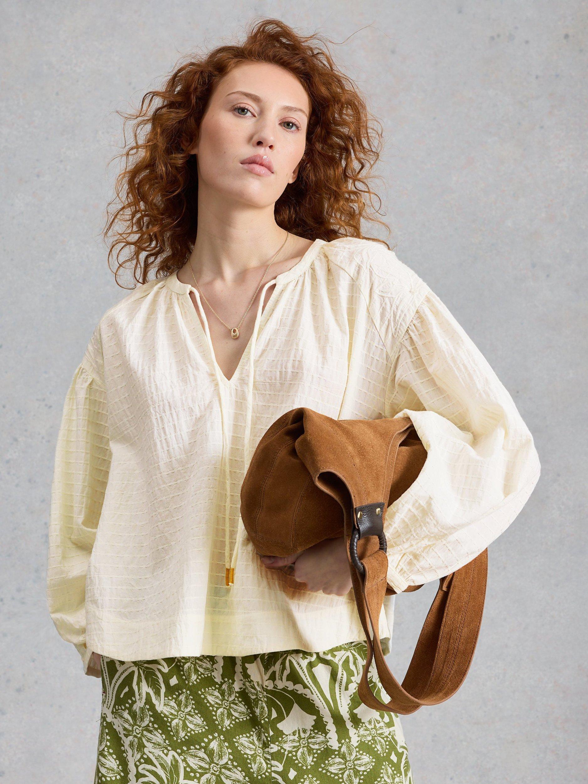 This textured blouse keeps you comfortable as you move. Soft cotton, a subtle stripe, and playful puff sleeves give your everyday look an easy look that never tries too hard.