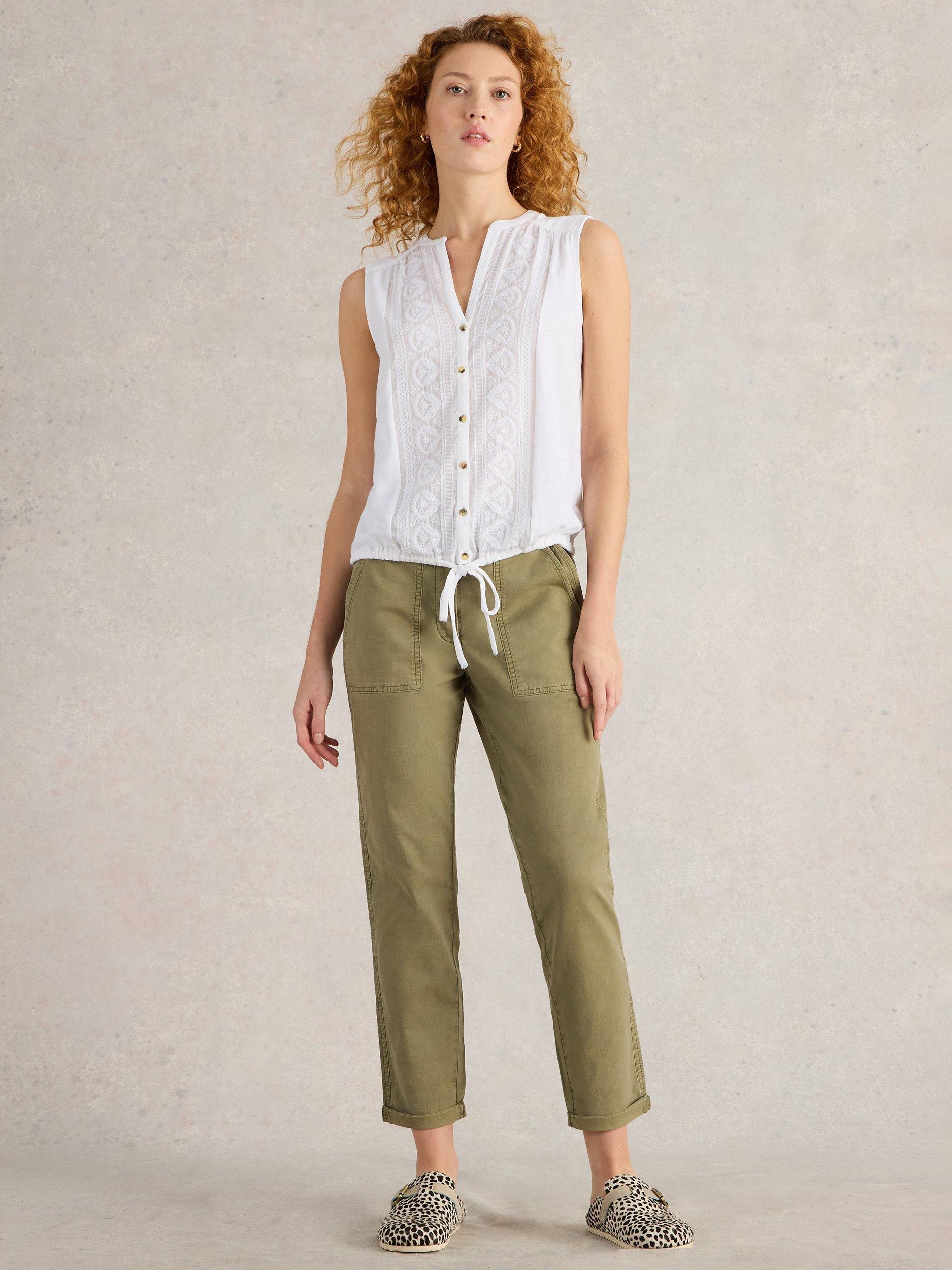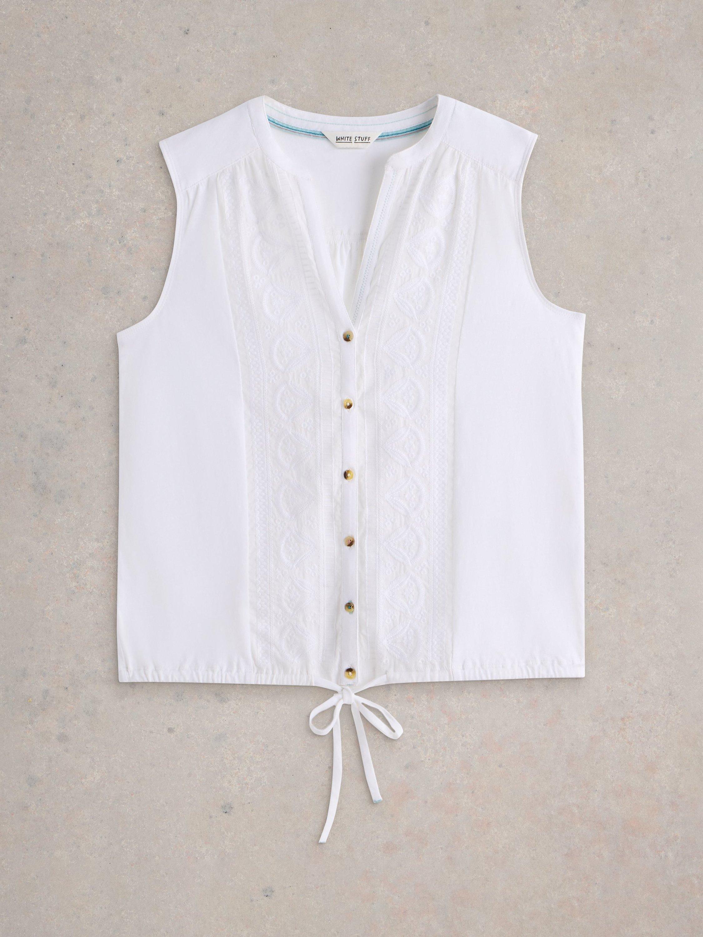 A sleeveless button down shirt with tie detail.
