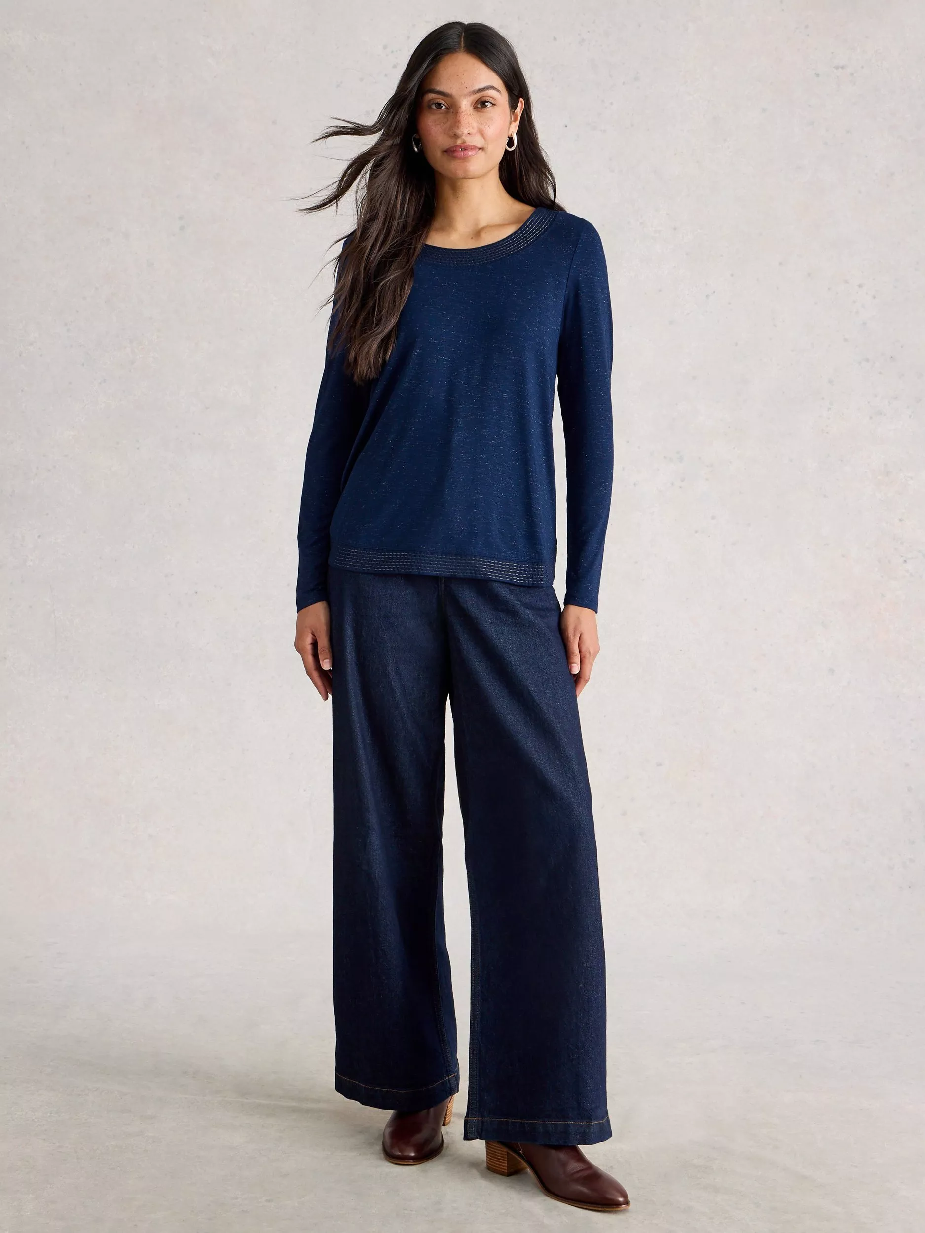 A sparkle shirt from White Stuff, blended with light viscose. With a round neck and long sleeves, it's elevated with metallics for a piece you'll reach for again and again.