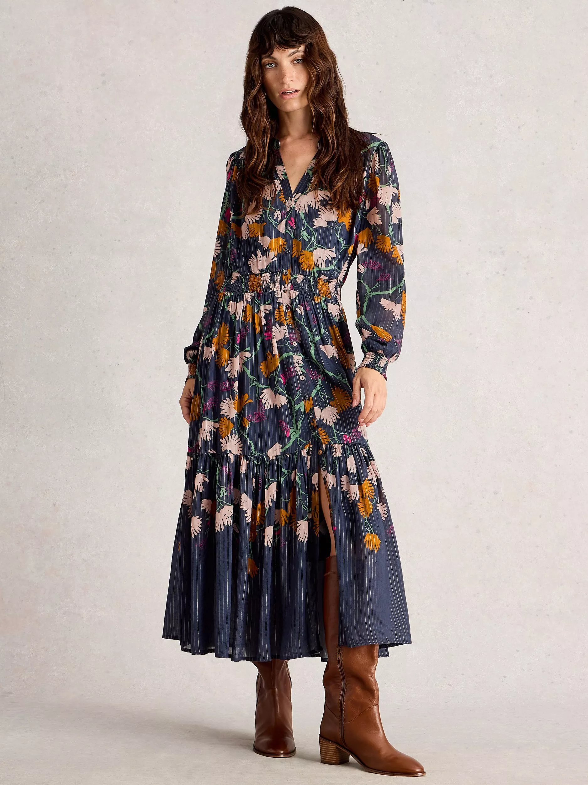 White StuffYuki Floral Metallic Midi Dress, Navy/Multi