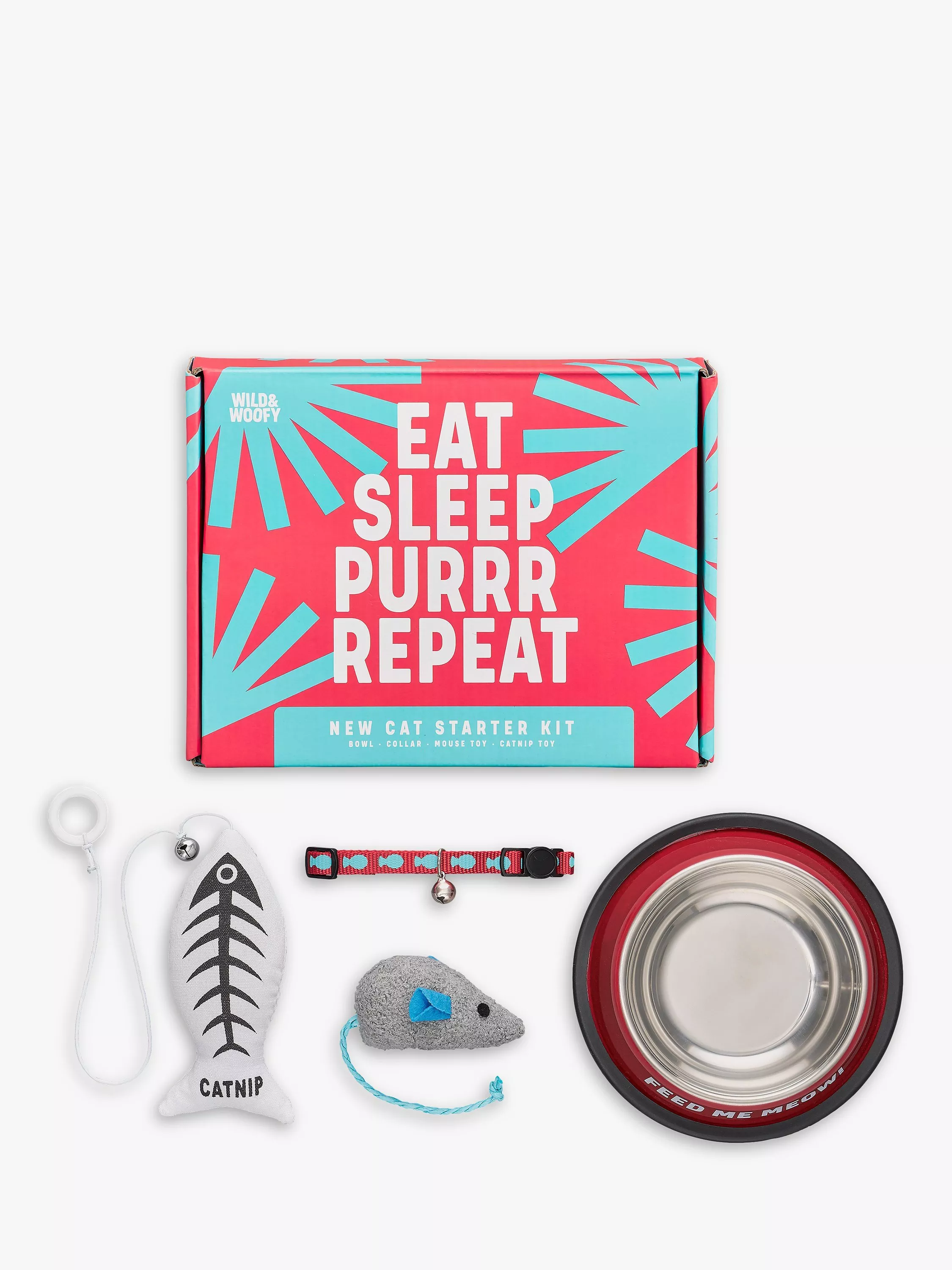 Eat, Sleep, Purrr, Repeat! Welcome your new bundle of fur to the family with this New Cat Starter Kit from Wild & Woofy!