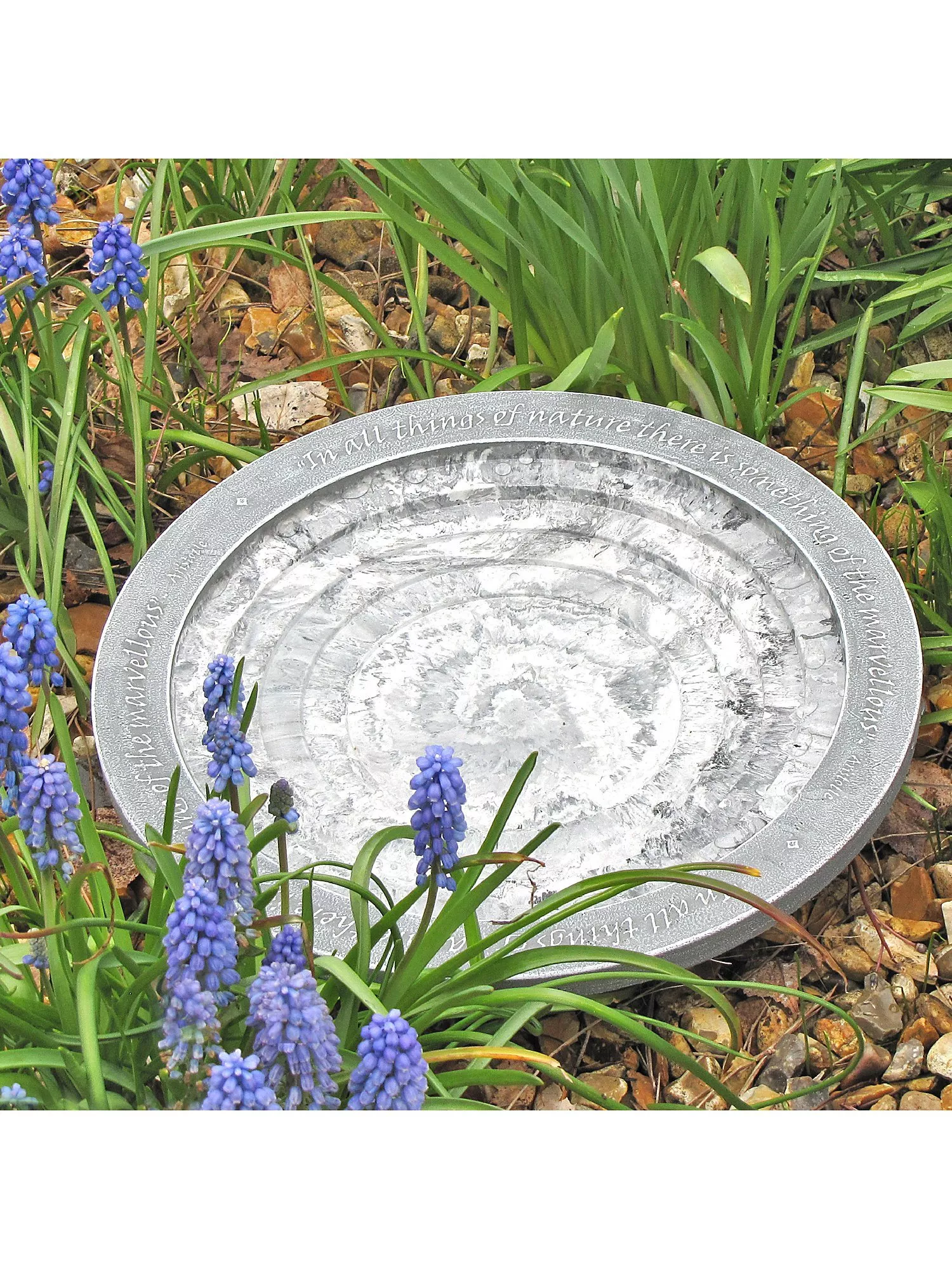 Pollinators and delicate insects can safely access the water using the small bird bath and drinker's shallow steps. The low integral pedestal raises the small bath and drinker just a little above the ground. It feels remarkably heavy and robust for its size, and as a decorative twist, the bird bath is finished in a natural marble-effect appearance and it has a nature-inspired quote from Aristotle around the outer edge.