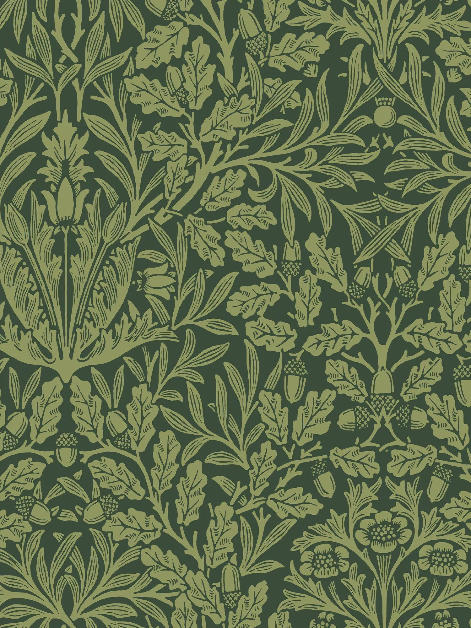 This beautifully detailed pattern of acorns and anemone-like flowers, combined with willow and oak leaves, was designed by William Morris in 1879 as a woodblock print.