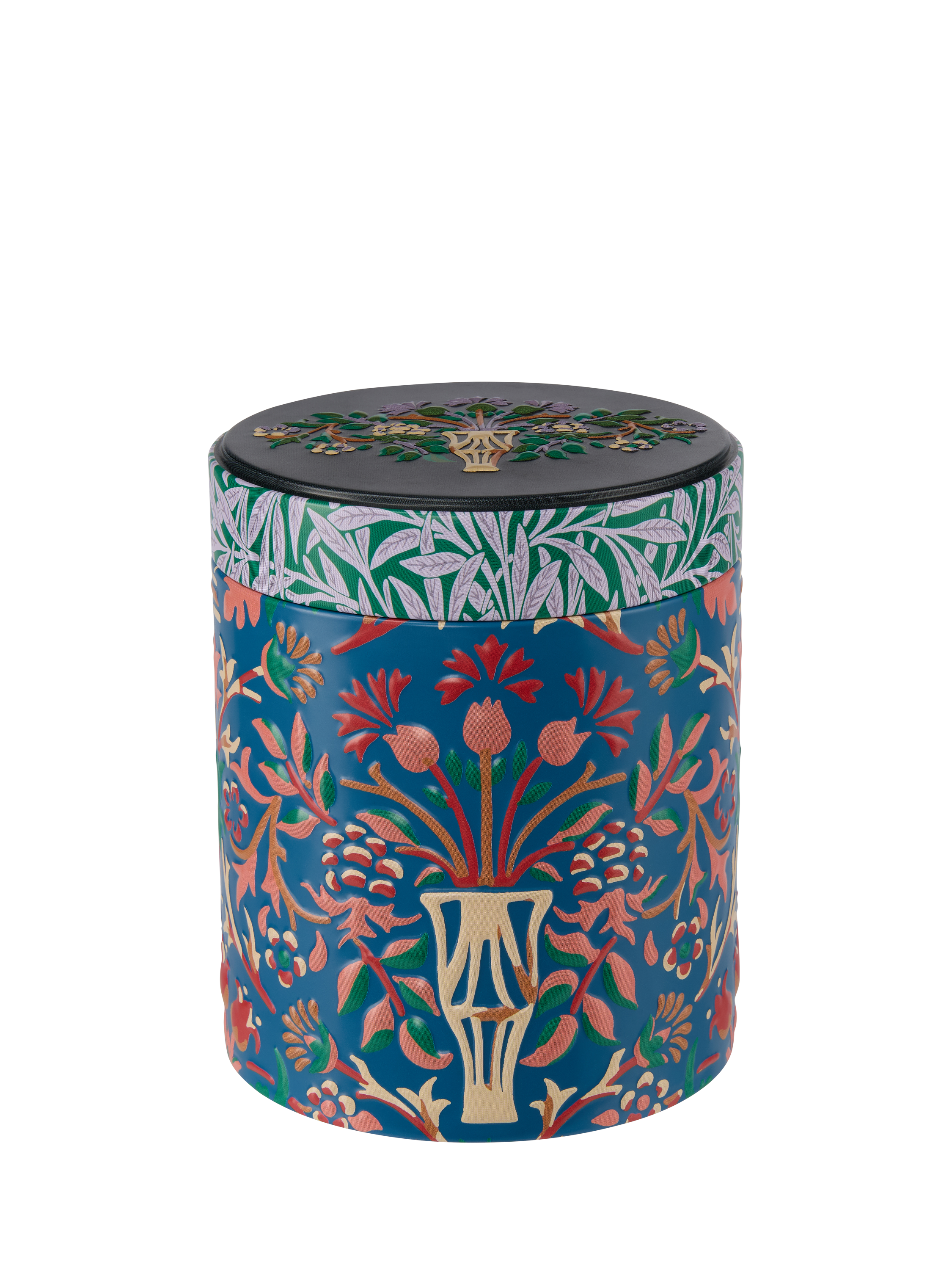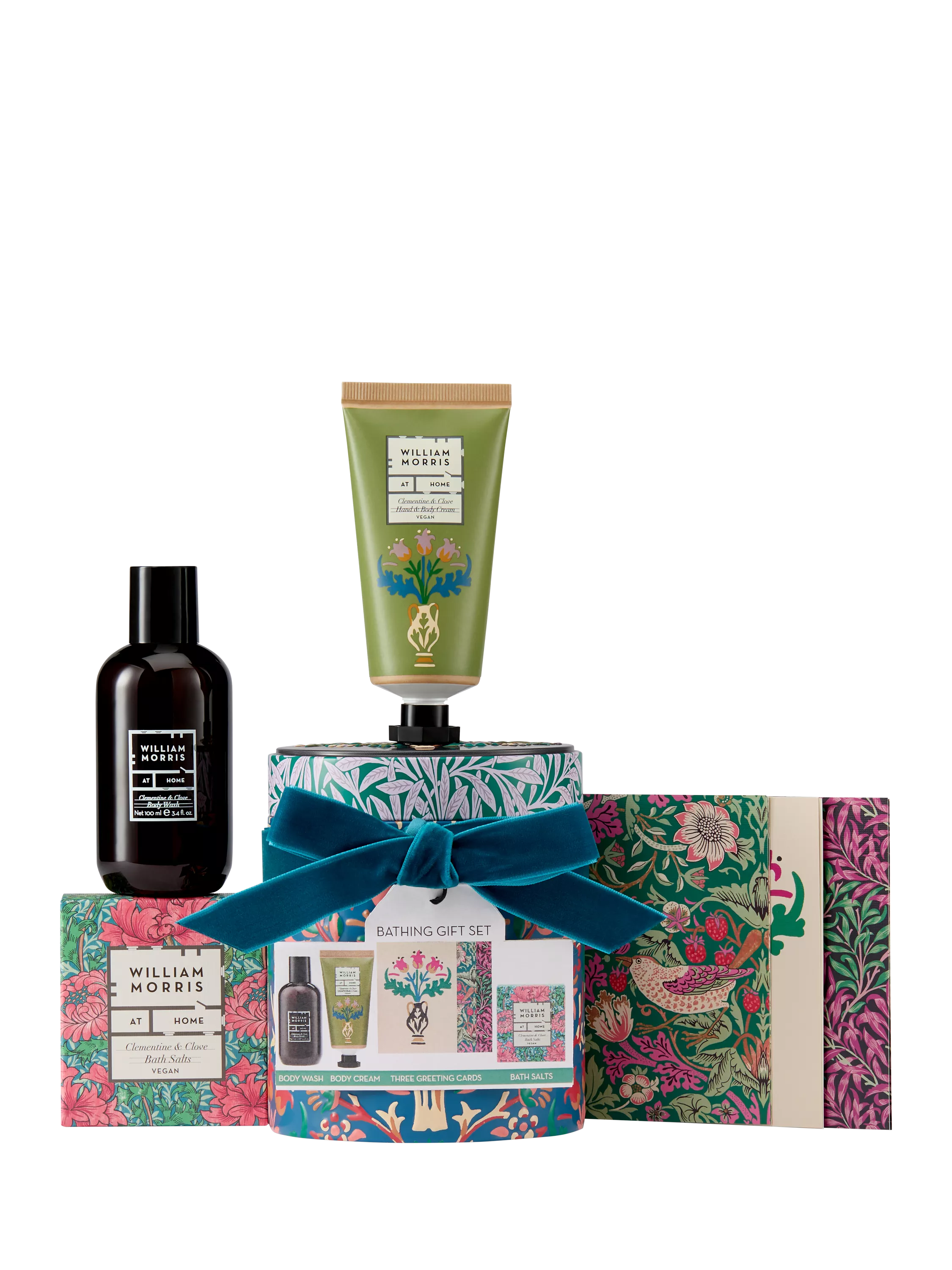 A useful and beauty-filled gift tin for fans of heritage design, finished with teal velvet bow. This round decorative tin with the Flowerpot design contains a cornucopia of treats including hand and body cream, body wash, bath salts and three William Morris print greetings cards.
