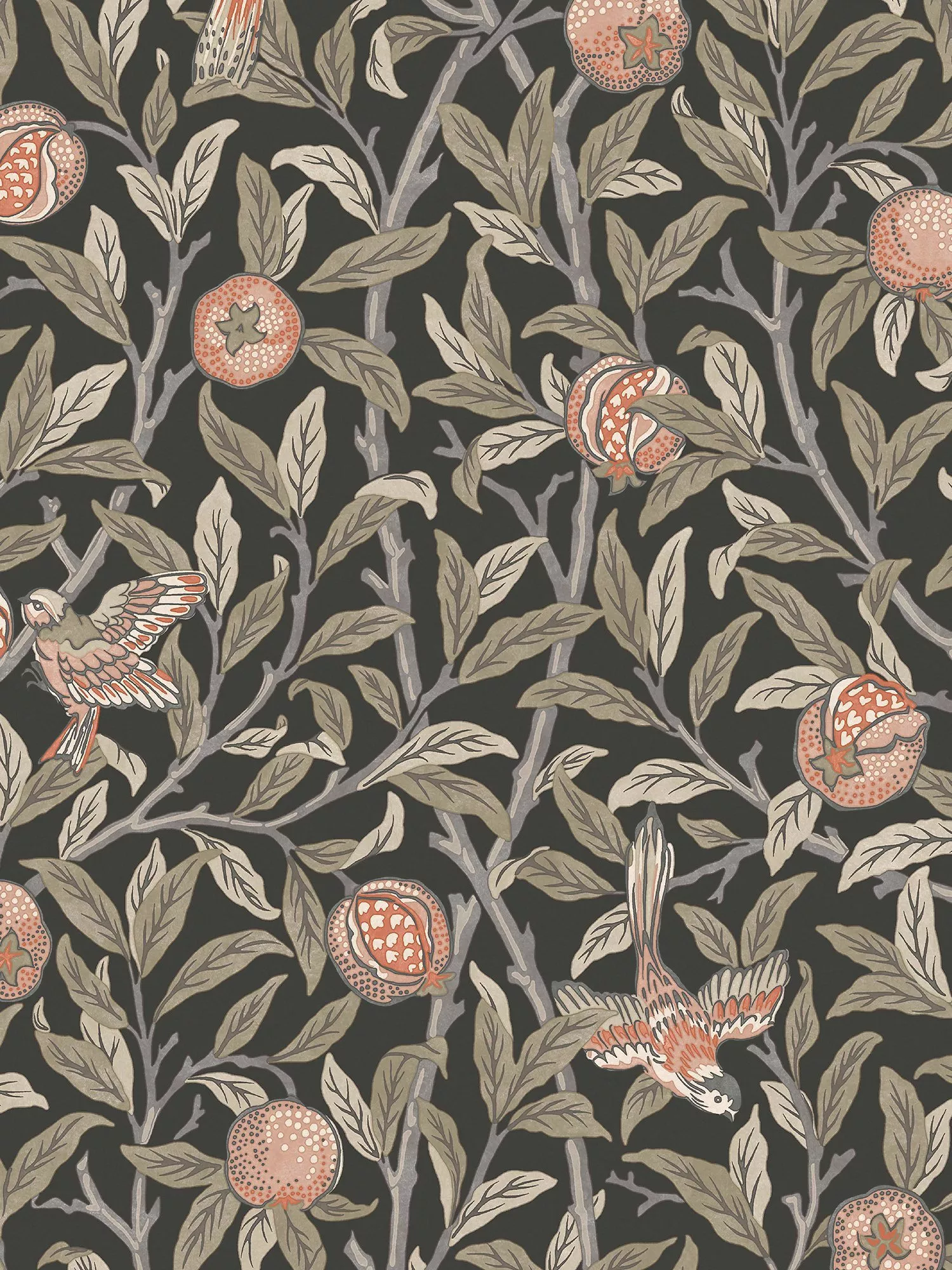 The inspiration for this piece was William Morris's much earlier pattern, "Fruit", which similarly depicts luscious pomegranates amongst branches, leaves and blooming pomegranate flowers. With nature the focus, this vibrant and whimsical design is a fine exemplar of Morris characteristic style.