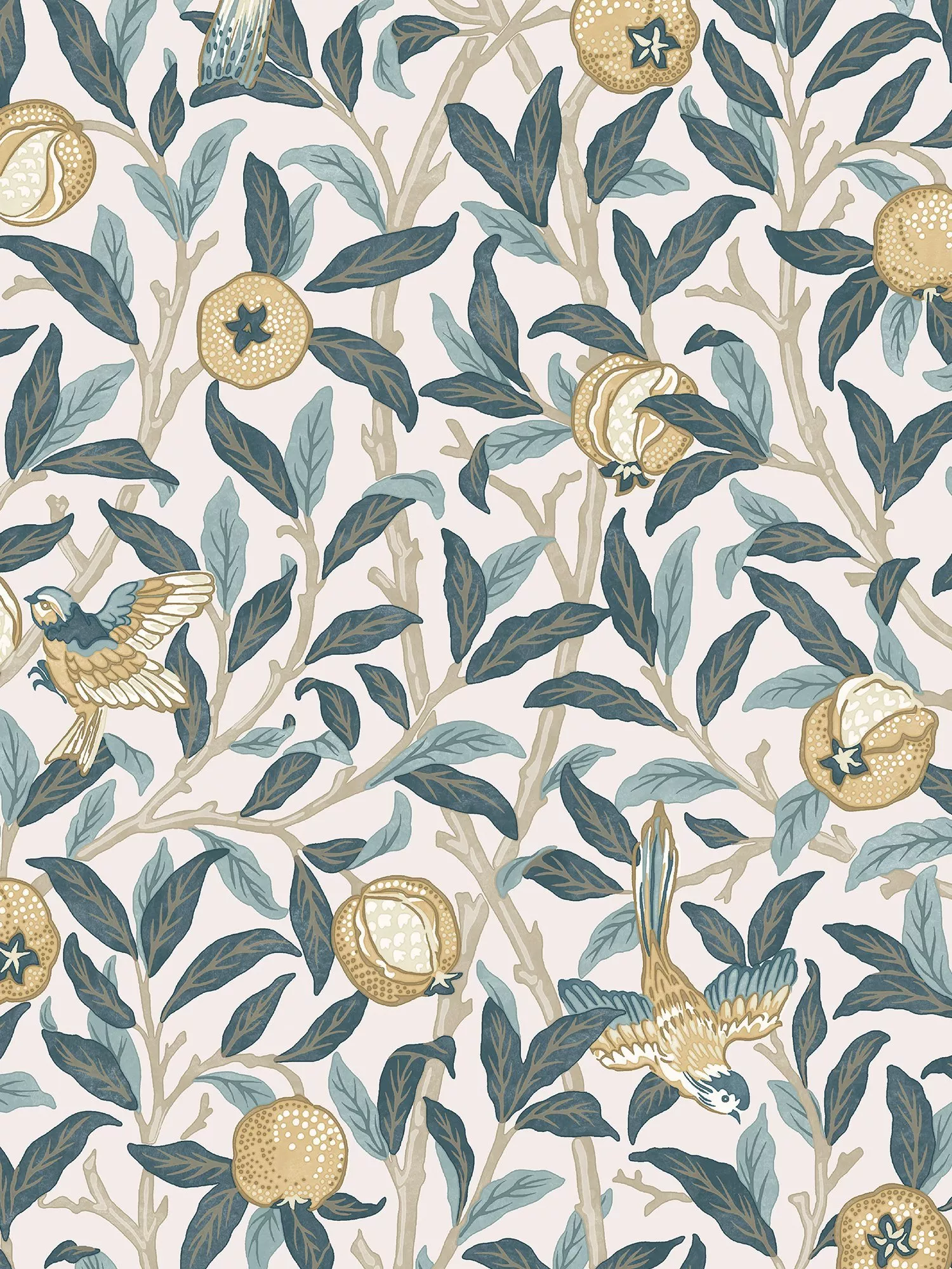 A beautiful and dynamic Morris design featuring perching and swooping birds against a network of foliage and an abundance of ripe pomegranates: some whole, some bursting open and others getting pecked at by diving birds.