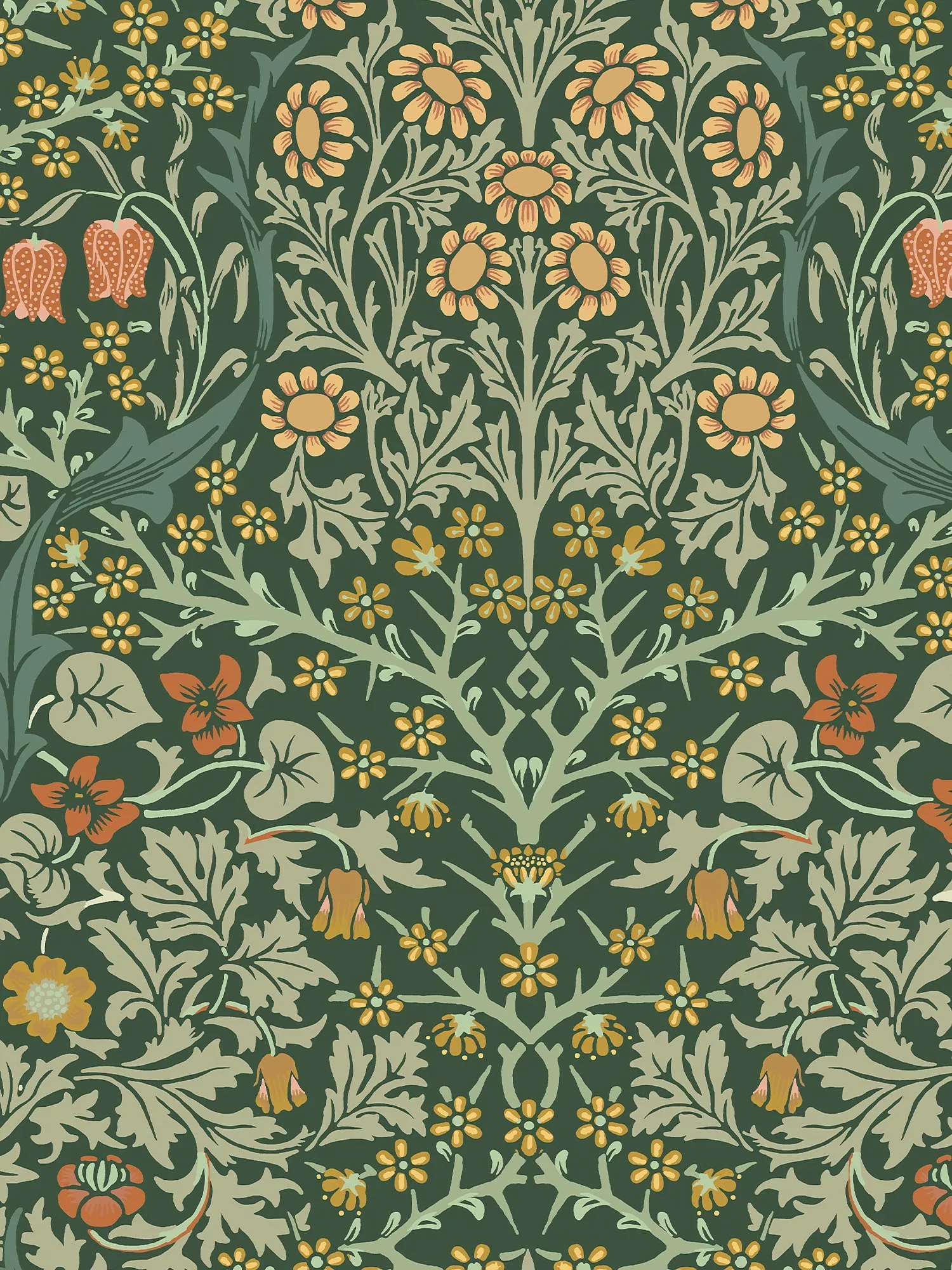 Designed in 1892, Blackthorn was originally block-printed and features white blackthorn (or sloe) blossom and violets with meadow flowers of red snakes head fritillaries and yellow daisies. The flowers bloom from a lattice of curling foliage, leaves, and stems in this iconic Morris pattern. Typical of Morris's work, Blackthorn is a celebration of the beauty of nature.