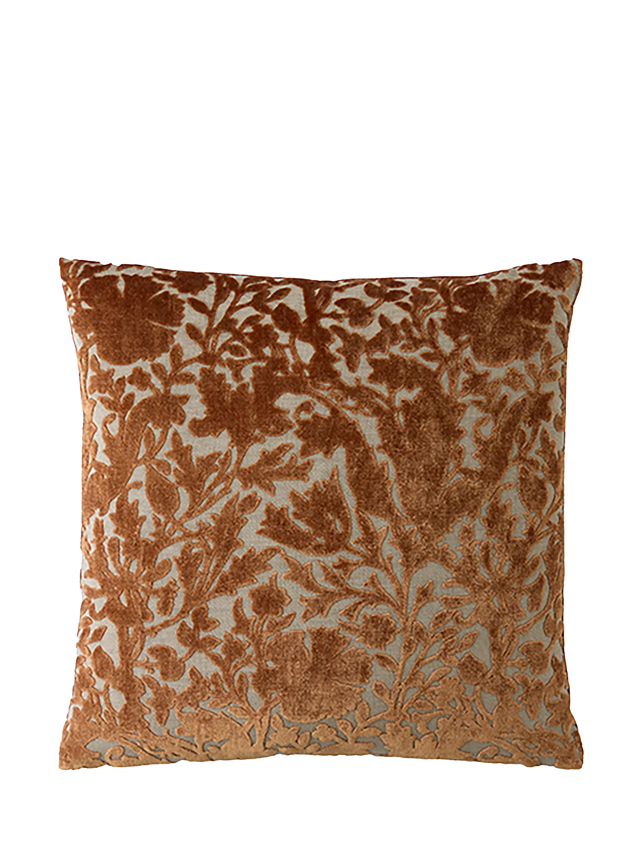 Compton features exquisite tulips and honeysuckle against layers of meandering foliage. Originally printed by hand, using twenty-eight wooden blocks with a different block for each colour, this design translates as a beautiful silhouette onto a luxurious cut velvet quality, in a rich burnt orange shade.