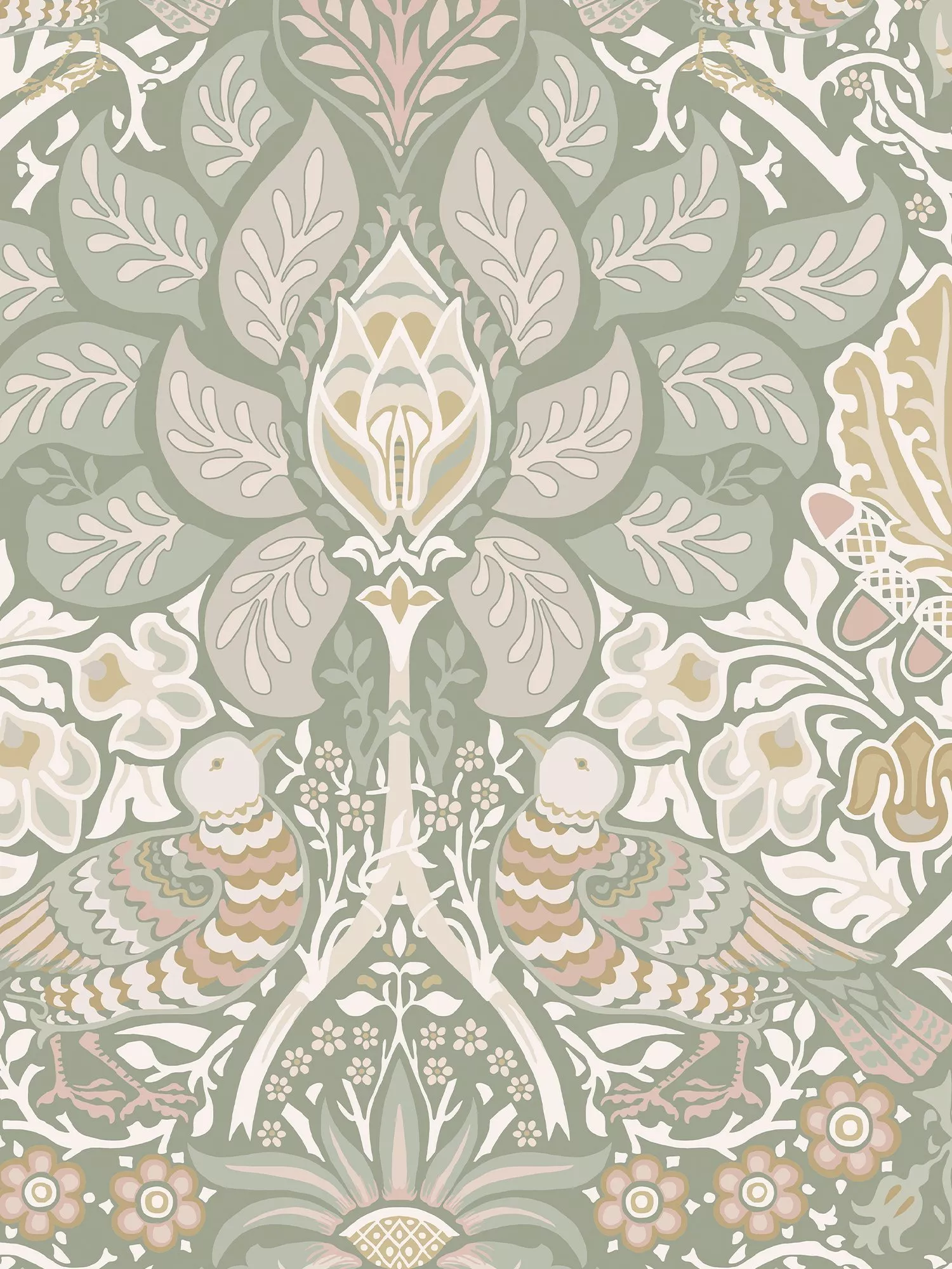 Created from the original design drawing in the William Morris Gallery archive, this design was intended for woven double cloth and features a motif of leaves, stems, rose sprays, acorns, and doves.