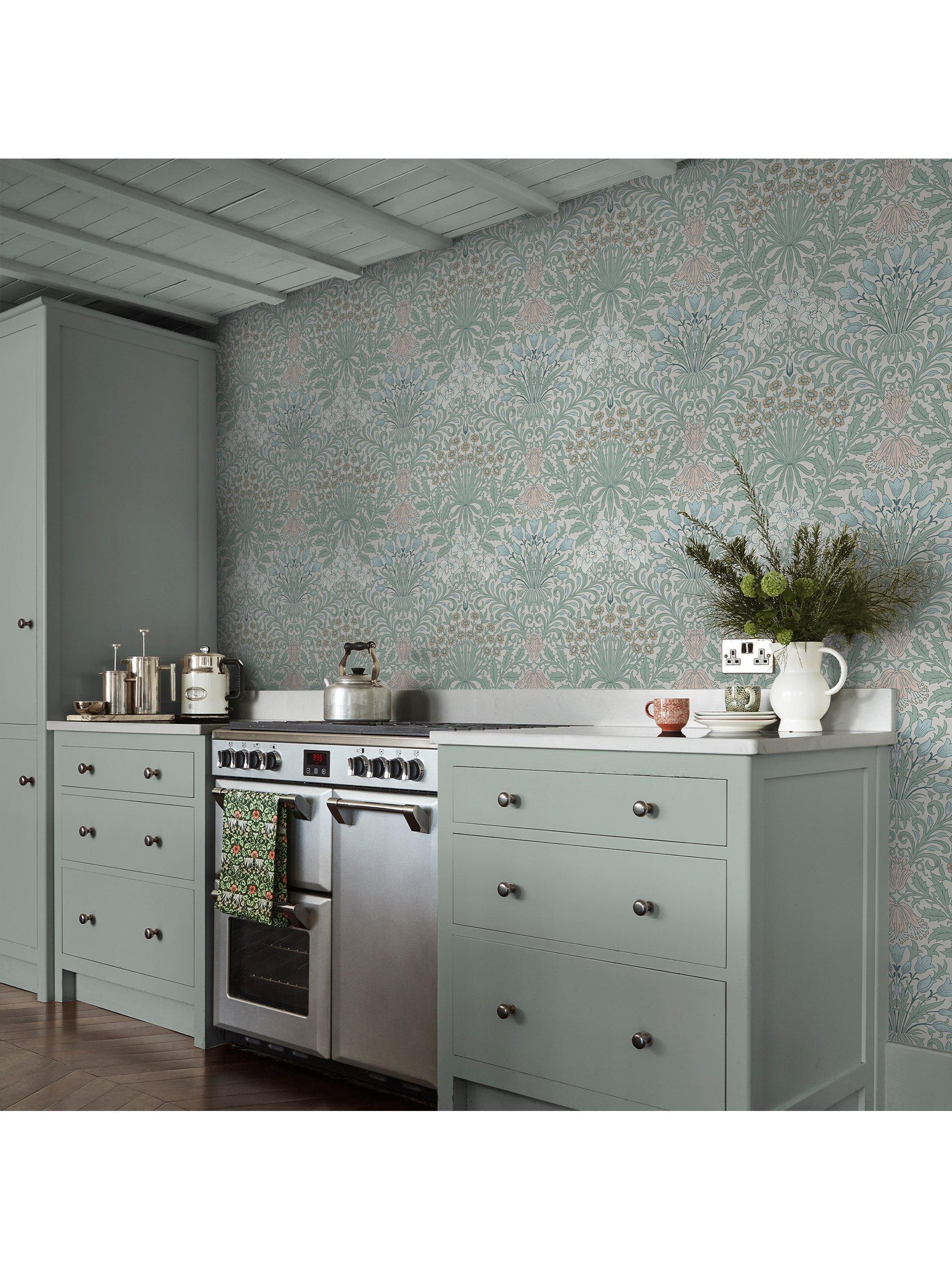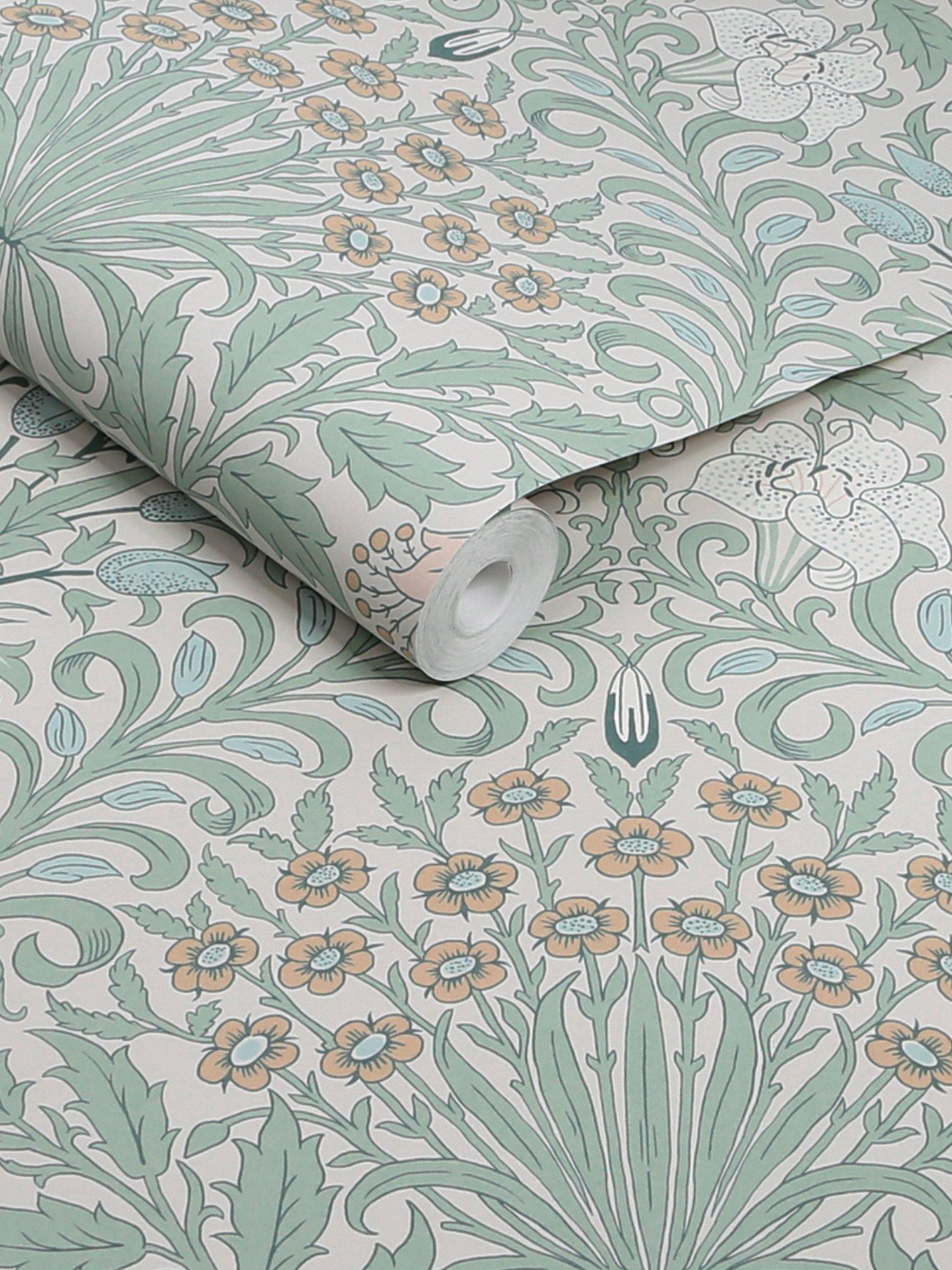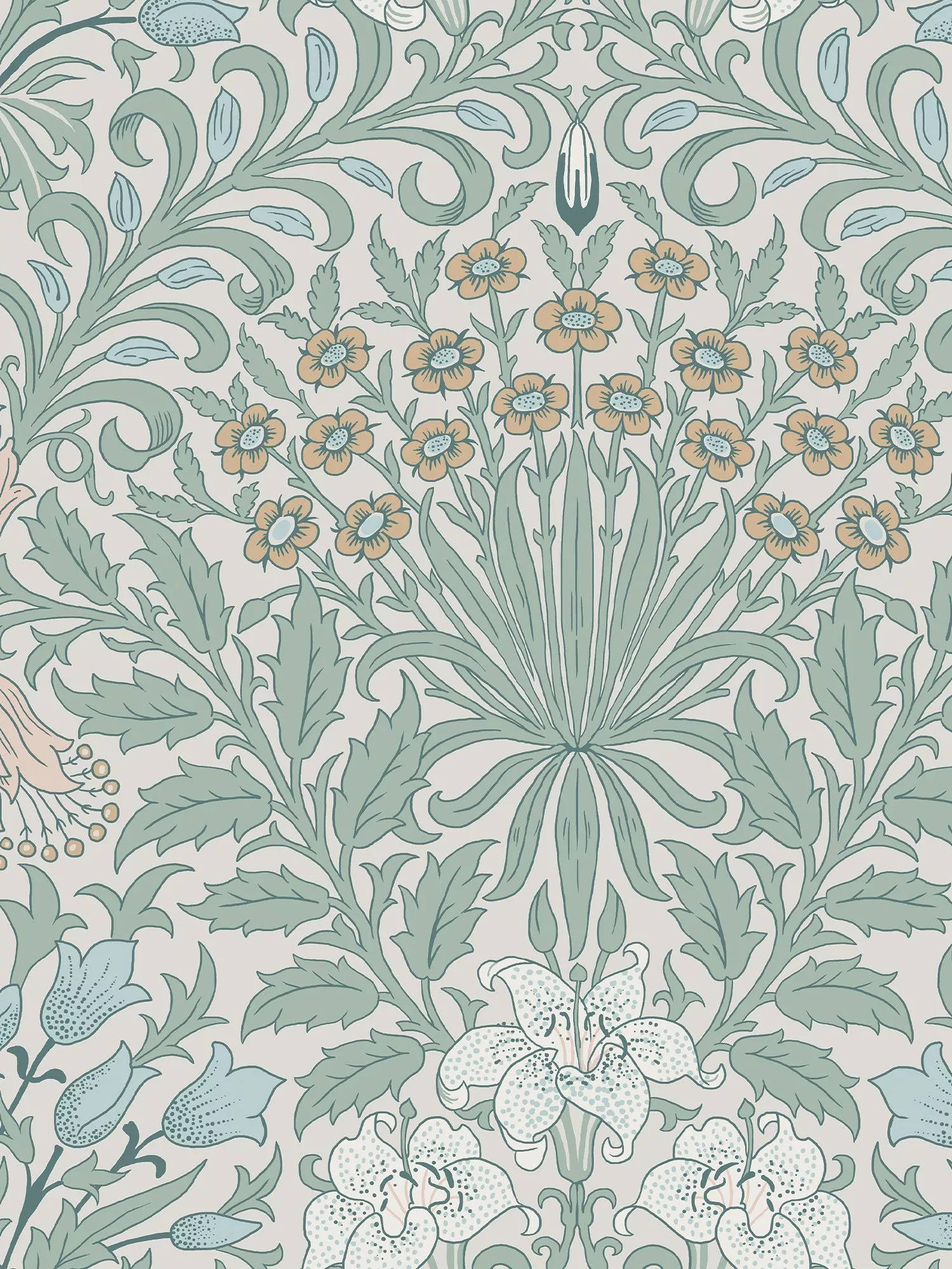 Designed by John Henry Dearle in the early 20th Century, the Garden pattern includes bold foliage with contrasting leaf shapes, supporting a variety of flowers in full bloom including elegant lilies.