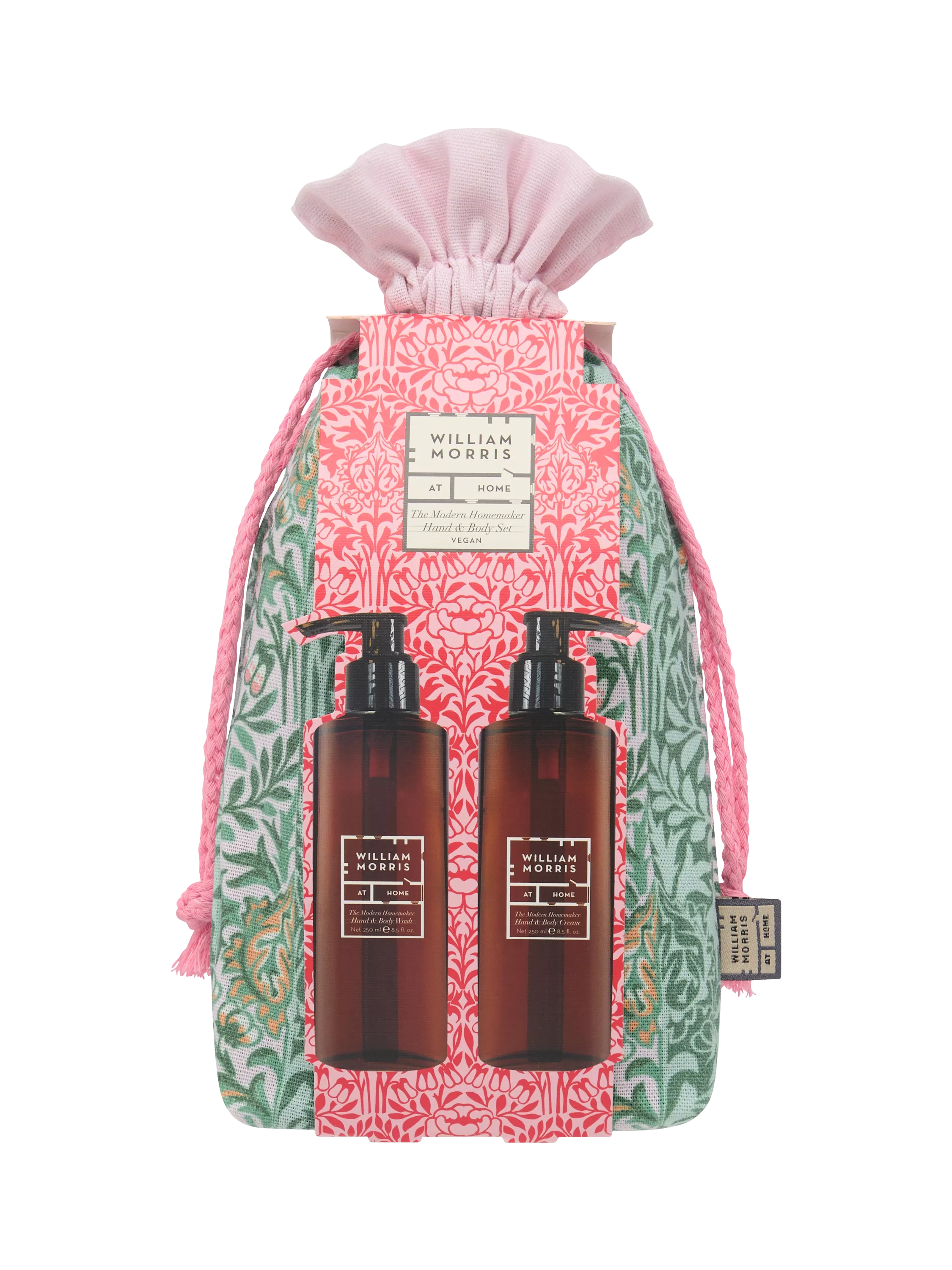 A useful and beautiful linen drawstring bag in the William Morris Rose design containing gentle hand and body wash, and lotion. Enriched with skin-loving vitamin E and lemongrass essential oil to leave skin cleansed, deeply hydrated and delicately scented with notes of wild flowers and crisp citronella.