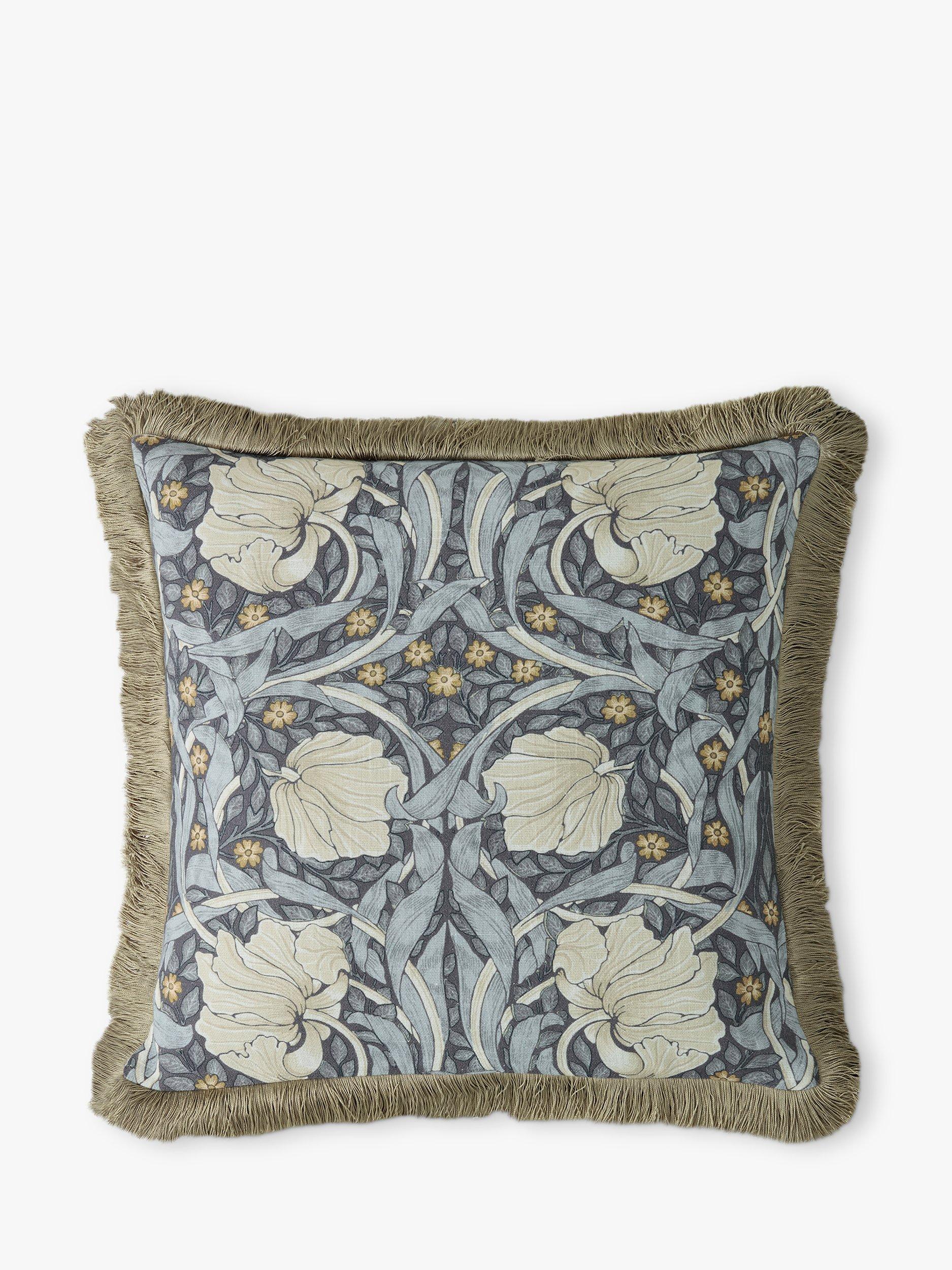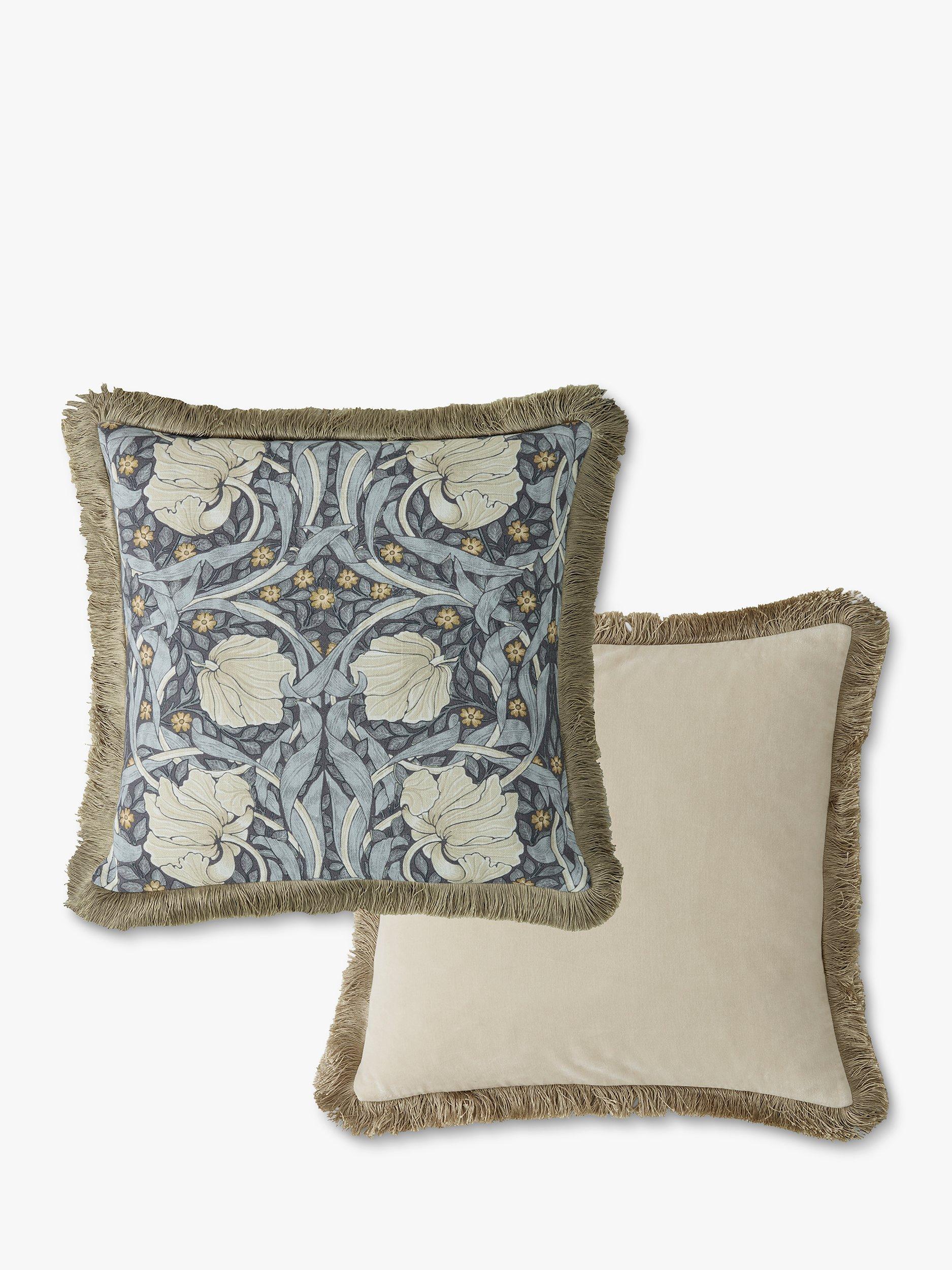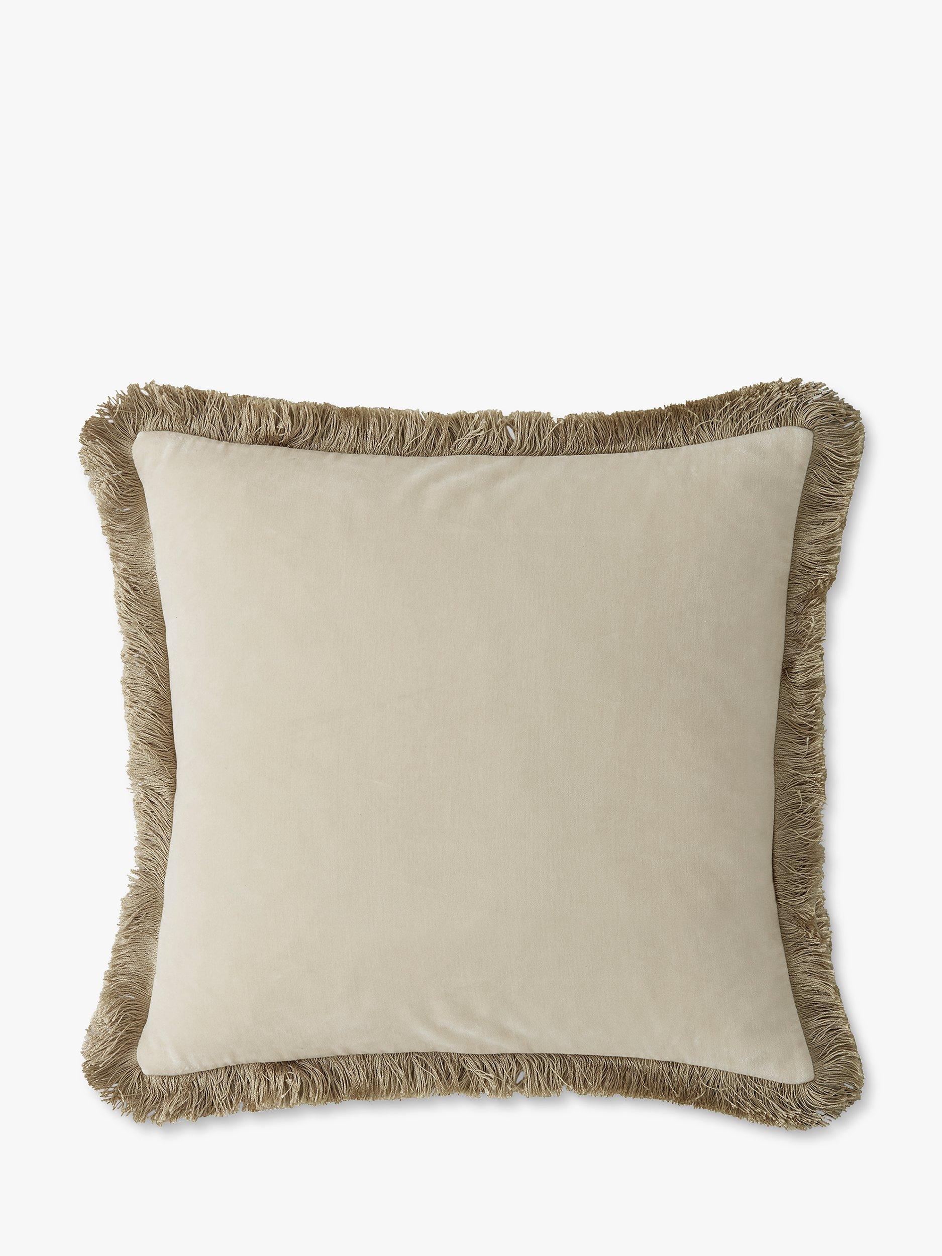 Digitally printed onto an elegant, linen-look, cotton base, in a classic colour palette of blues, creams and yellow, with a cream cotton-velvet reverse and smart fringed edging, this cushion is perfect for celebrating pattern and nature in your home.