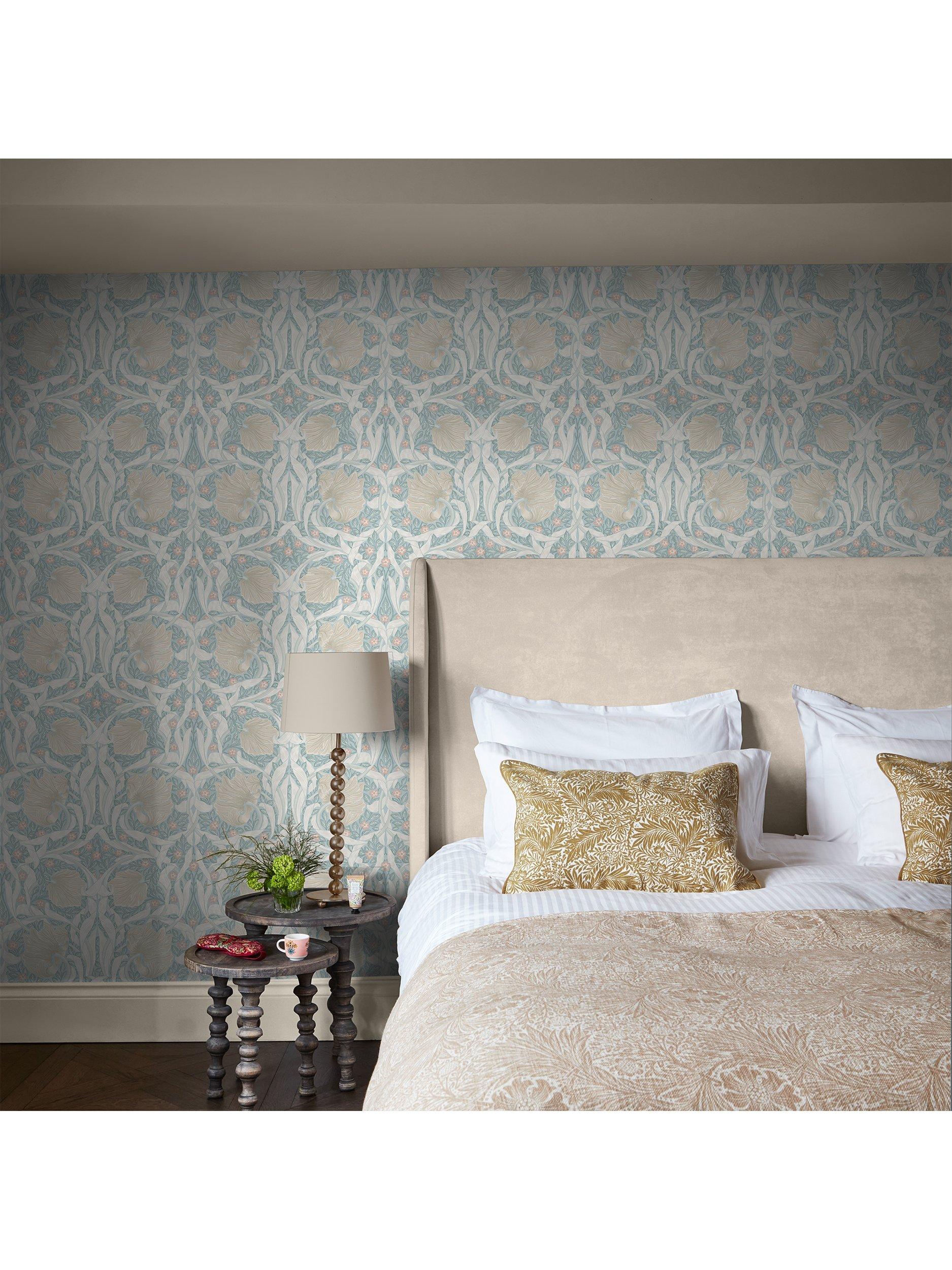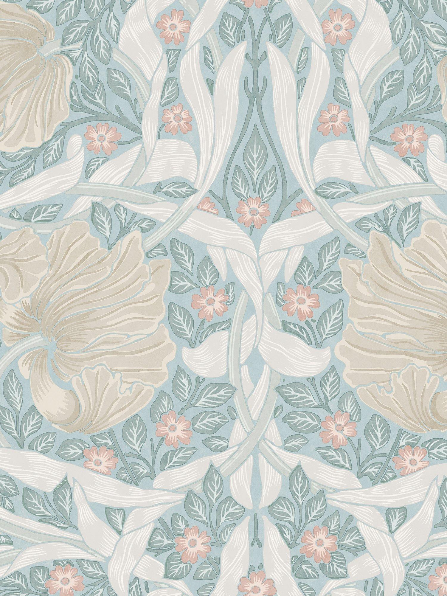 This hand block printed design features large sensual tulips and their curling leaves, entwined with foliage and small pimpernel flowers. The pattern is a wonderful example of William Morris’s sense of humour, since on initial inspection your eye is drawn towards the dominating, graphic tulip heads and yet the name of the design is attributed to the secondary floral detail; the smaller pimpernel flower.