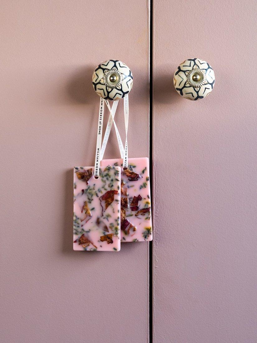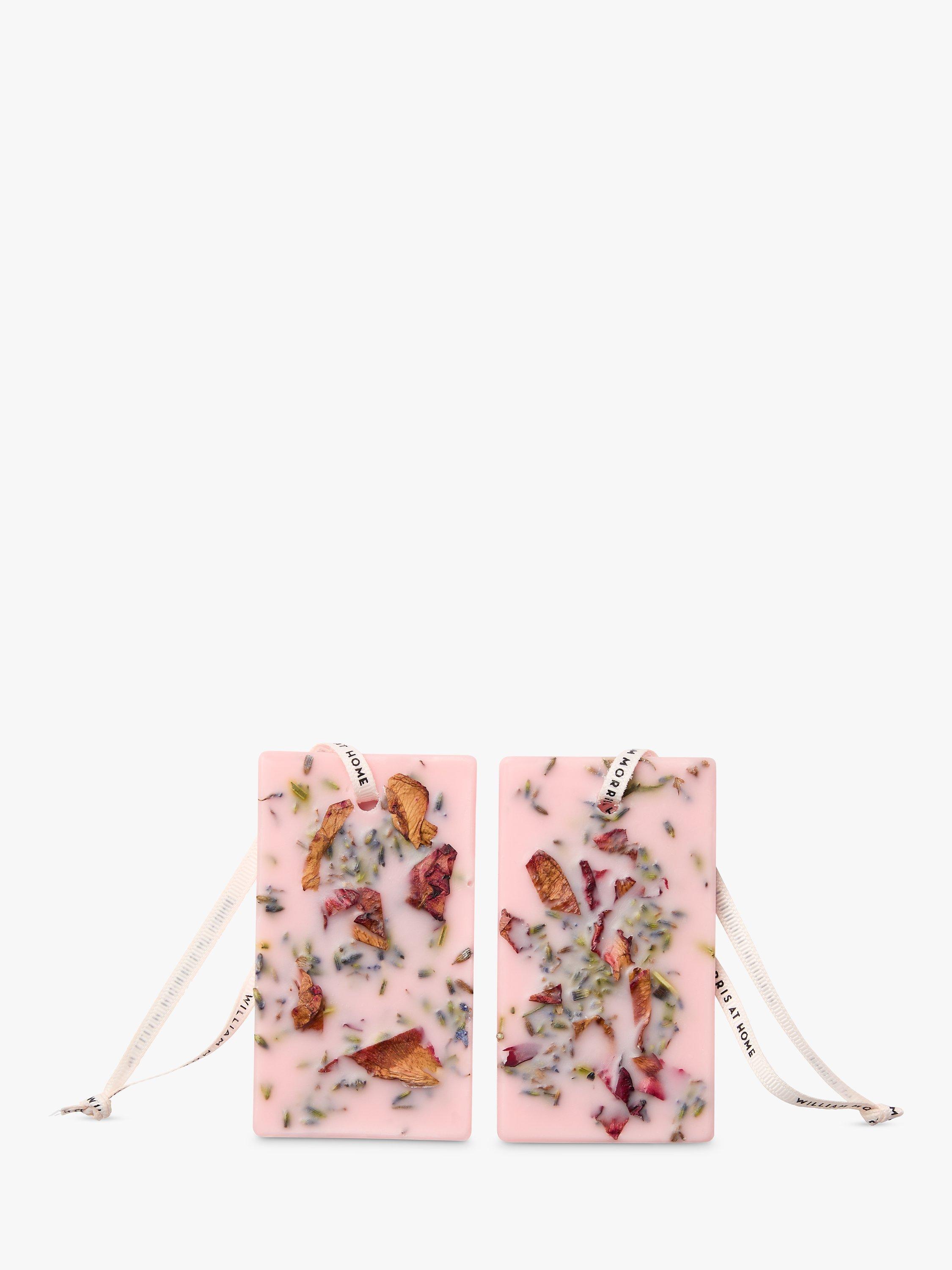 Discover a beautiful way to scent small spaces. Two Patchouli & Red Berry scented wax tablets with dried rose petals and lavender flowers, fragranced with grounding patchouli entwined with notes of enticing red berry and warming cardamom. Use to perfume drawers, suitcases, linen cupboard or hang in wardrobes.