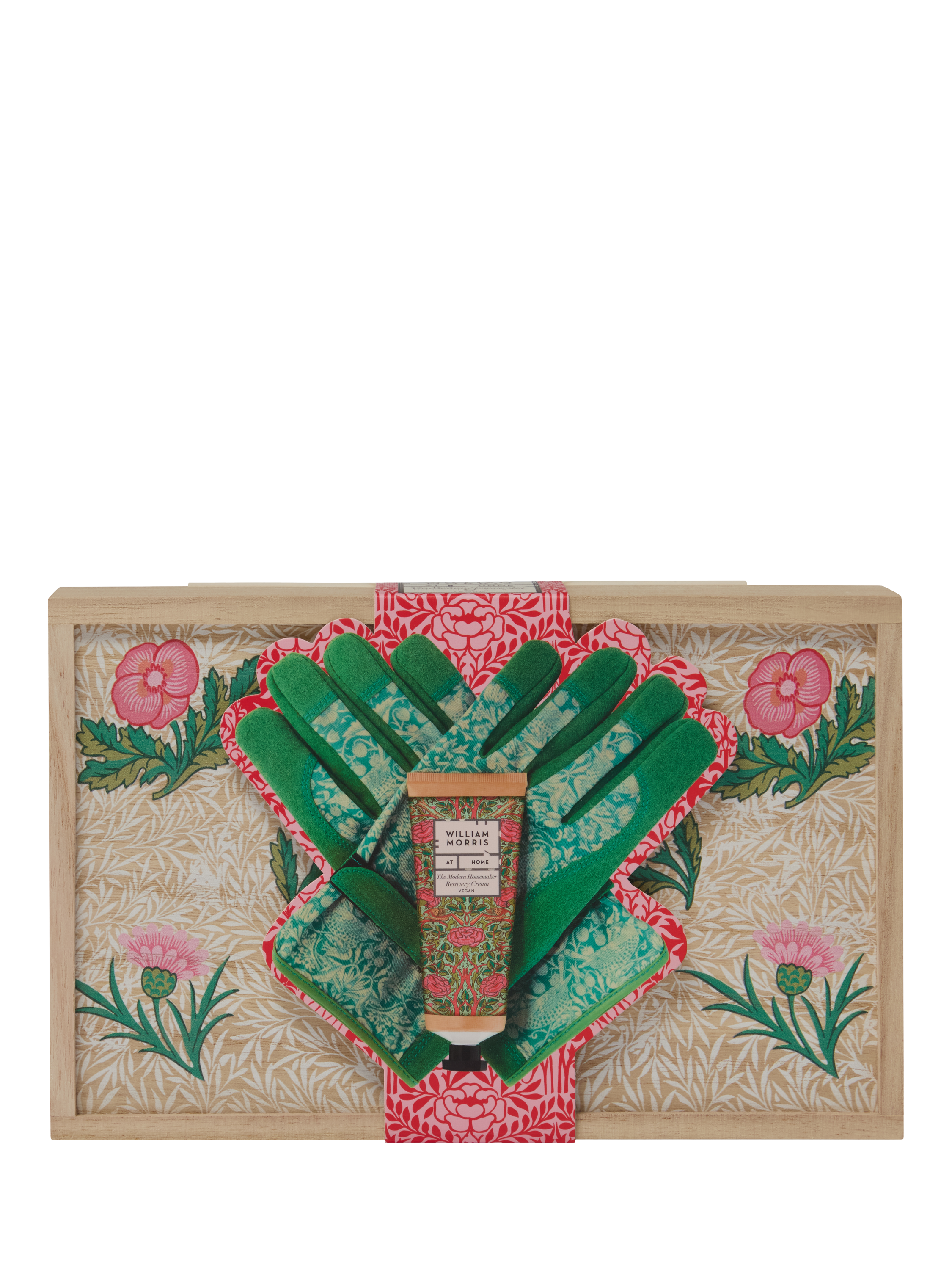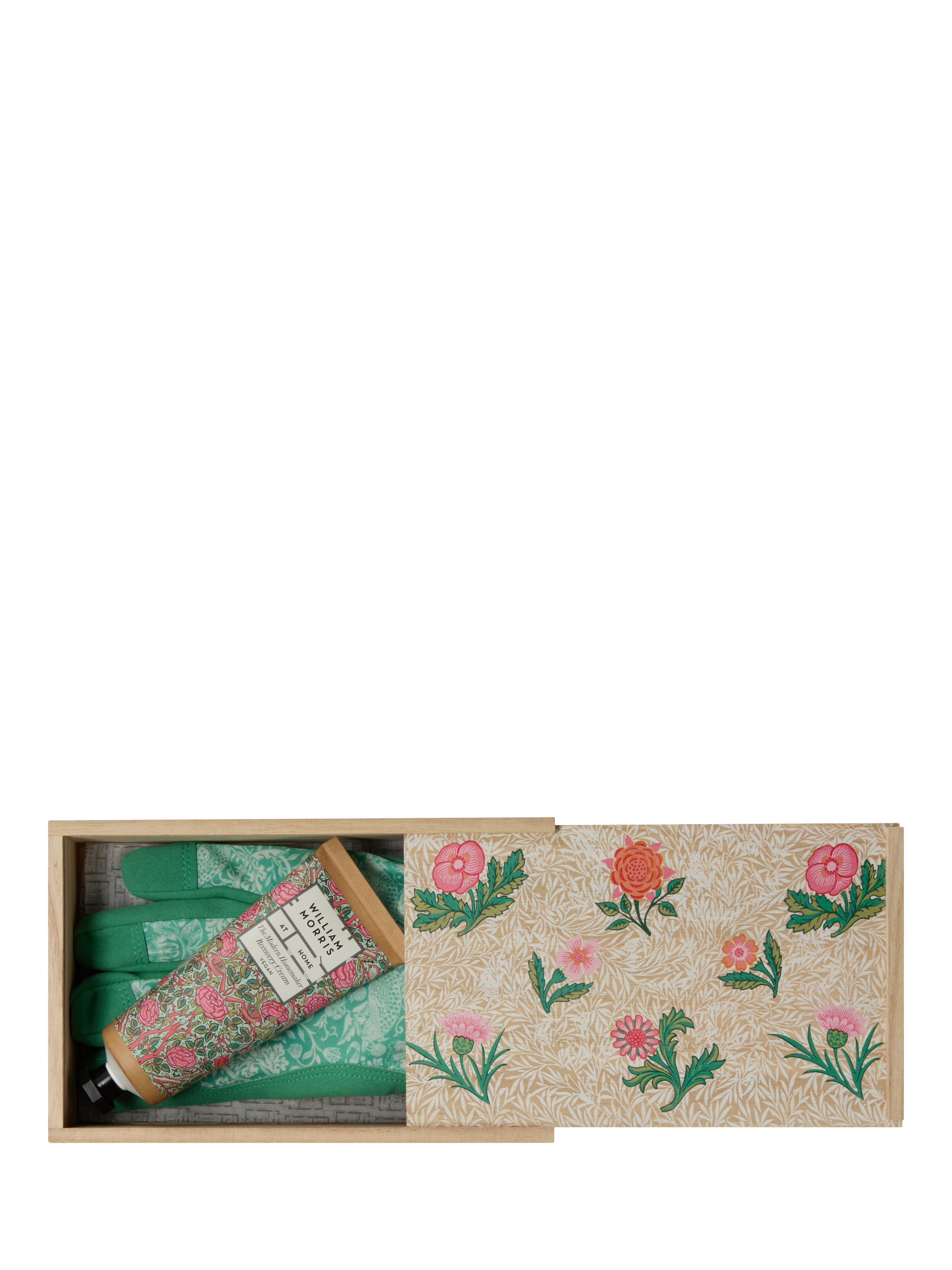 Working together hand in glove, our rich Hand Recovery Balm for post gardening care and adjustable Strawberry Thief gardening gloves with strap, in a painted, wooden storage box. An ideal gift for the keen gardener.